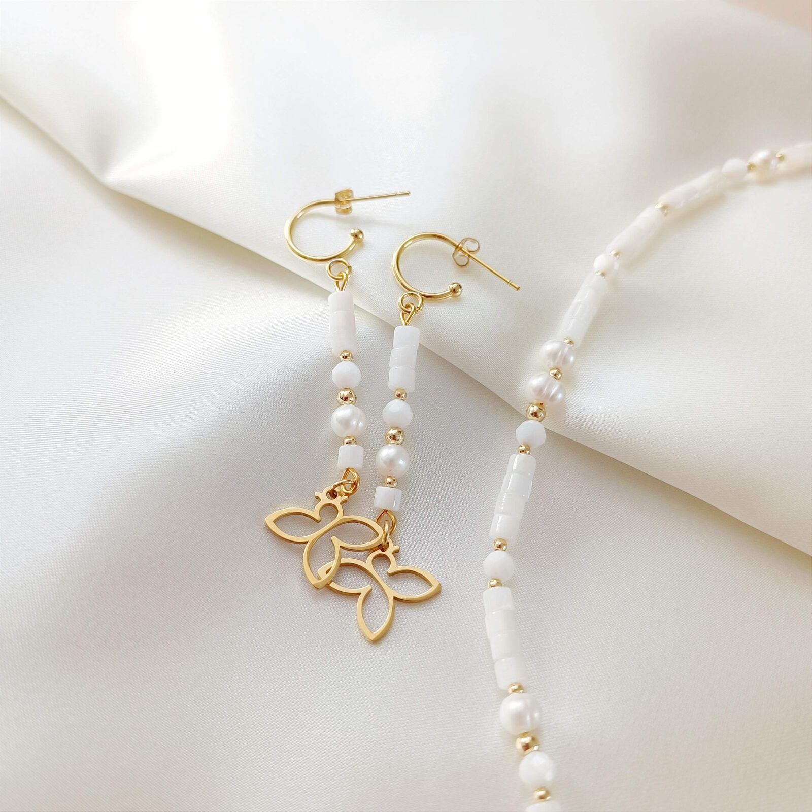 Wypełnione walcami masy perłowej, kulkami muszli i naturalnymi perłami hodowanymi, zakończone autorskimi zawieszkami Beezu.
