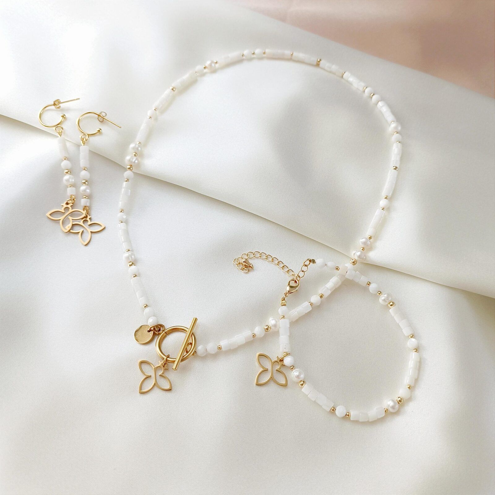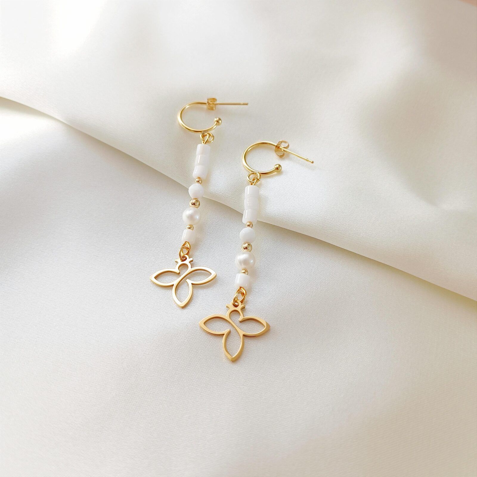 Wypełnione walcami masy perłowej, kulkami muszli i naturalnymi perłami hodowanymi, zakończone autorskimi zawieszkami Beezu.