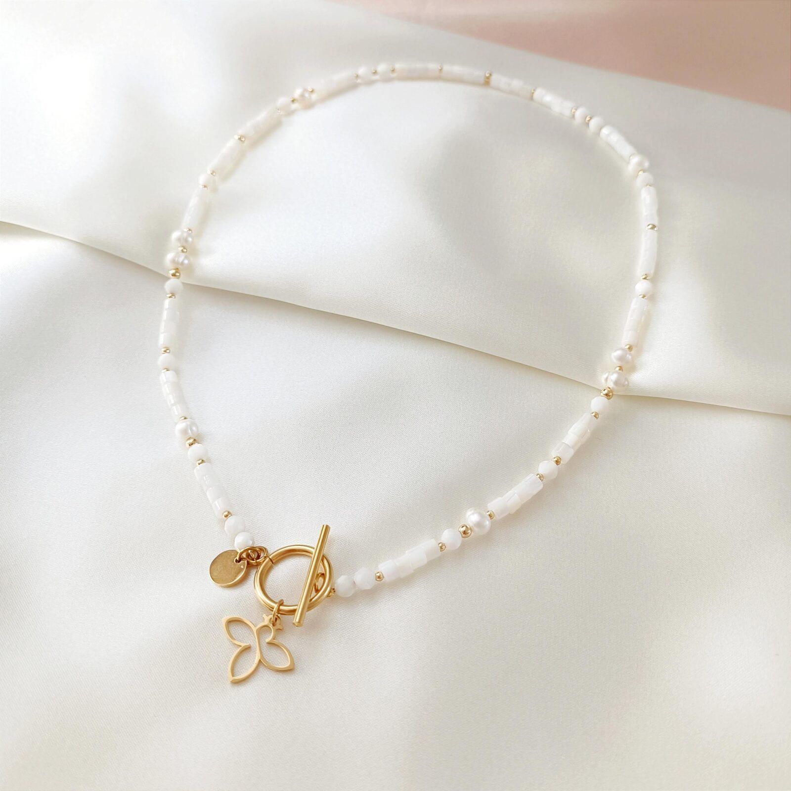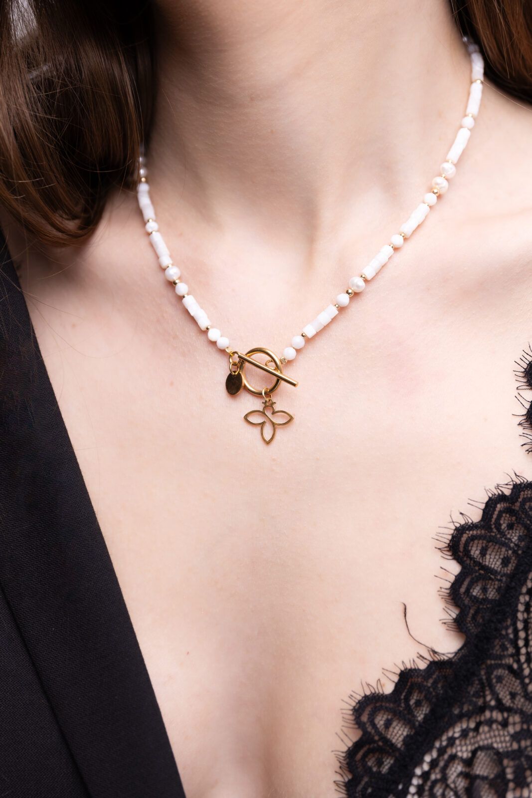 Wszystkie złote dodatki wykorzystane w tym naszyjniku to antyalergiczna stal chirurgiczna.