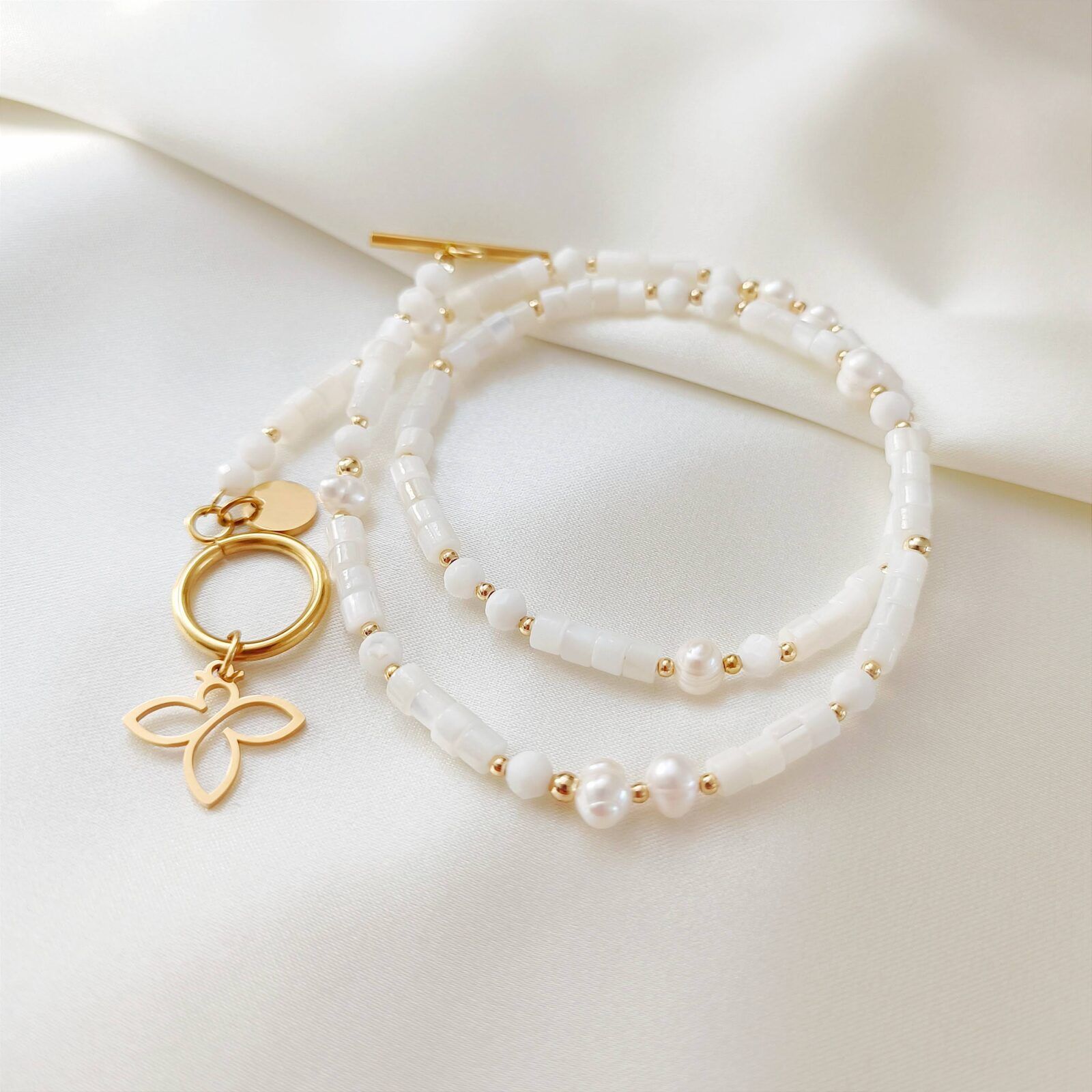 W przewadze walce masy perłowej, kulki białej muszli oraz naturalne perły hodowane.