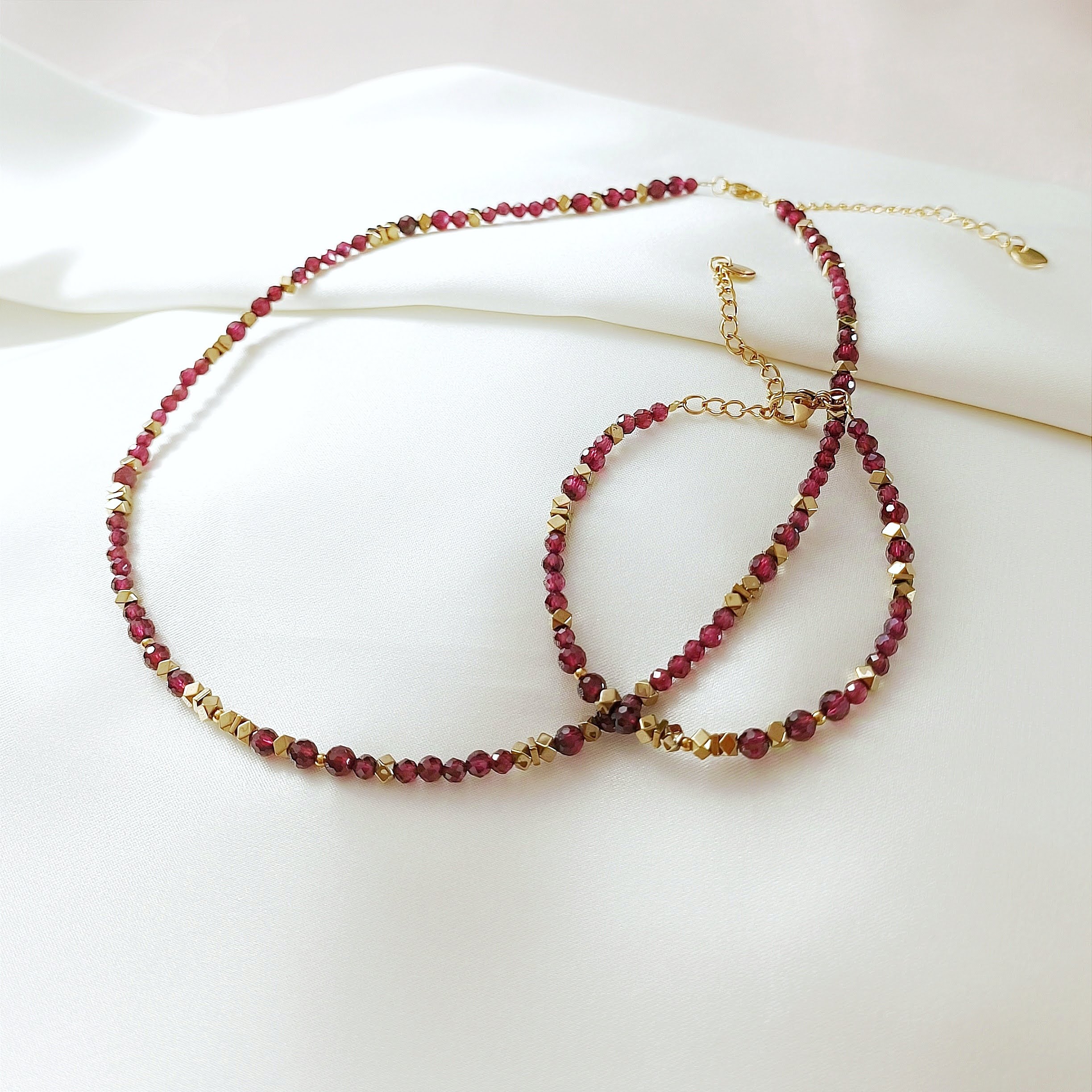 Bransoletka wykonana z naturalnego granatu oraz hematytu w kolorze złotym.