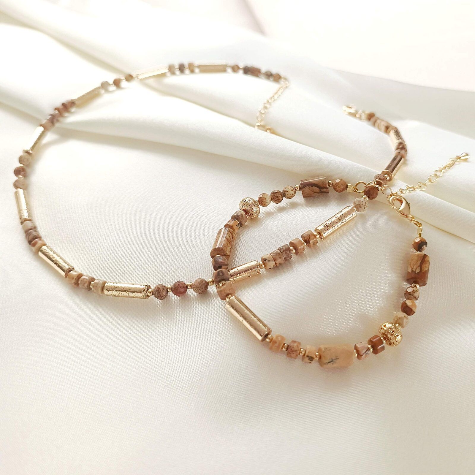 Bransoletka z jaspisem krajobrazowym i lawą wulkaniczną w złotym odcieniu to wyjątkowy dodatek, który łączy spokój ziemi z energią ognia. Naturalne wzory jaspisu przypominające pejzaże nadają biżuterii niepowtarzalny charakter, a złocona lawa wulkaniczna rozświetla całość subtelnym blaskiem.