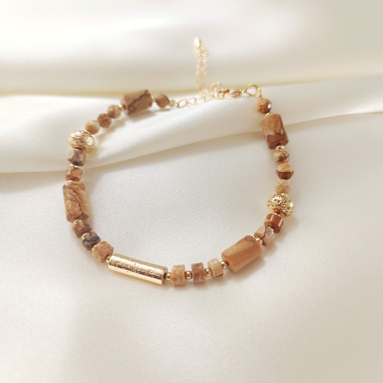 W tej bransoletce lawa została pokryta złotą powłoką, co nadaje jej elegancki wygląd i pięknie komponuje się z ciepłymi odcieniami jaspisu krajobrazowego.