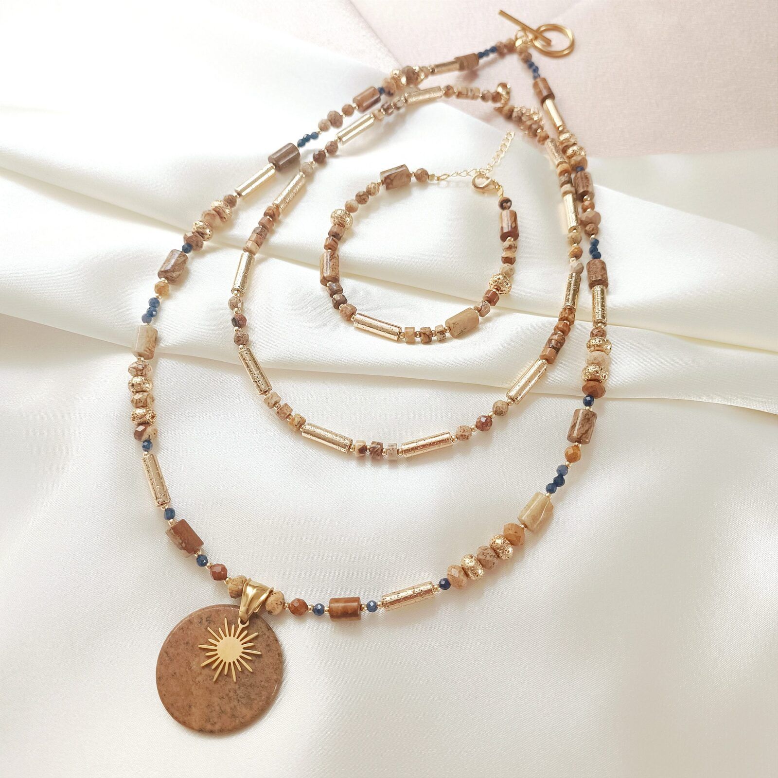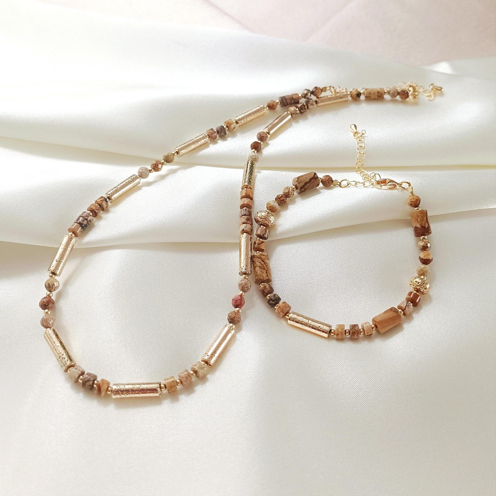 Bransoletka z jaspisem krajobrazowym i lawą wulkaniczną w złotym odcieniu to wyjątkowy dodatek, który łączy spokój ziemi z energią ognia. Naturalne wzory jaspisu przypominające pejzaże nadają biżuterii niepowtarzalny charakter, a złocona lawa wulkaniczna rozświetla całość subtelnym blaskiem.