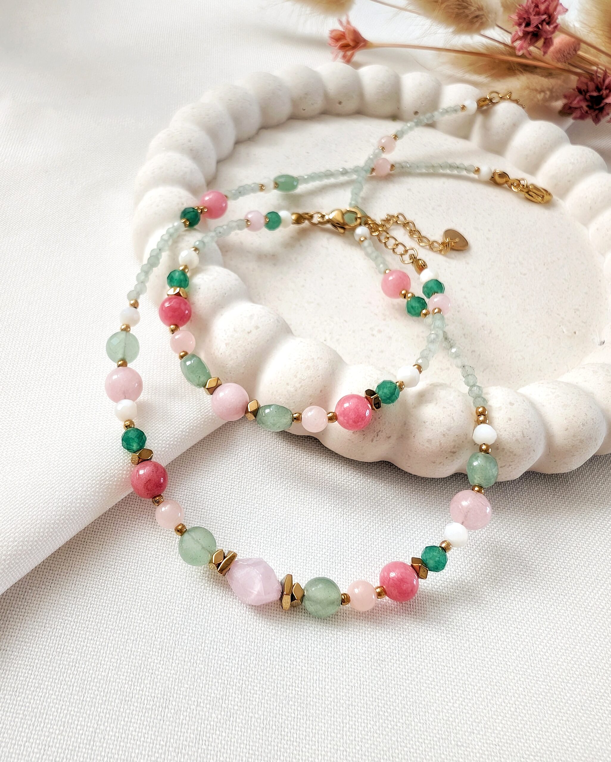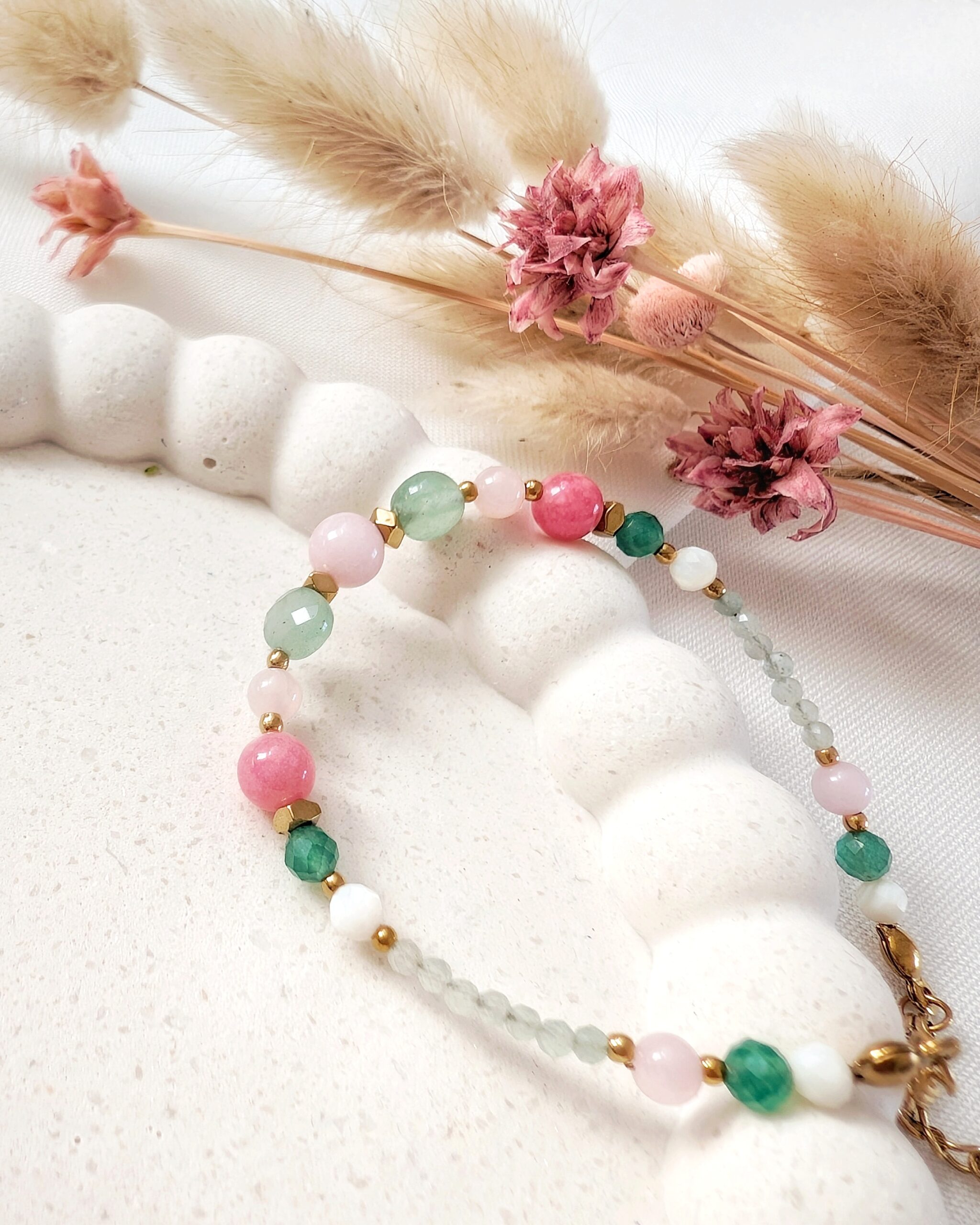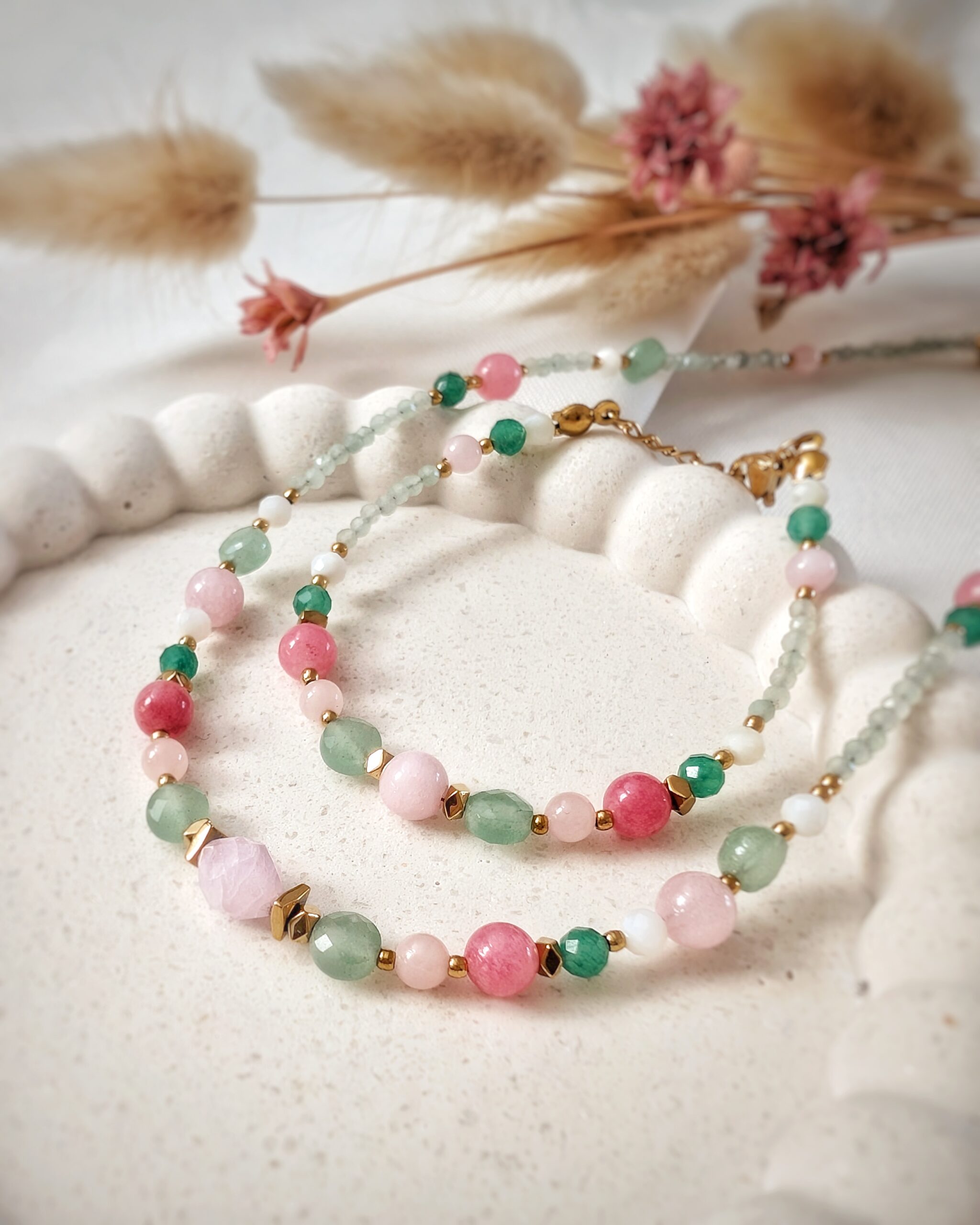 W tej kompozycji spotykają się zielony awenturyn i różowe jadeity. Kamienie, które razem tworzą paletę przypominającą kwietną łąkę skąpaną w słońcu.