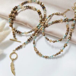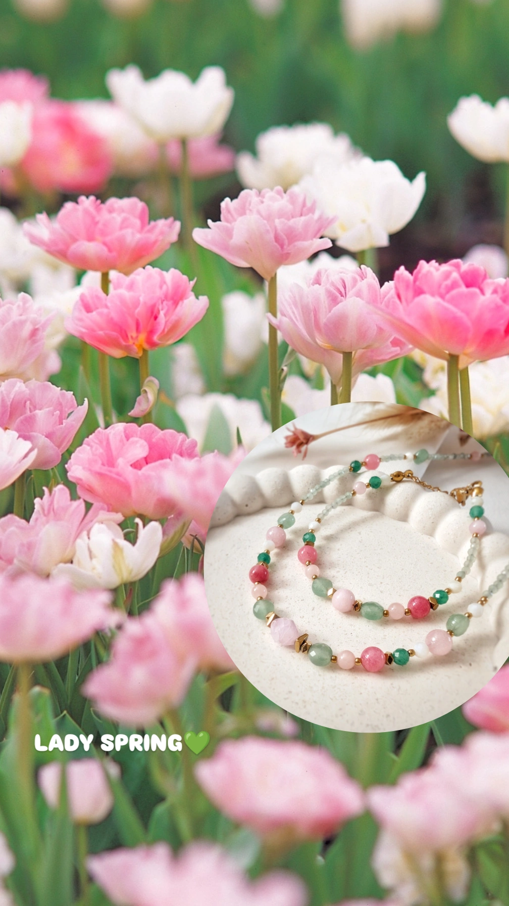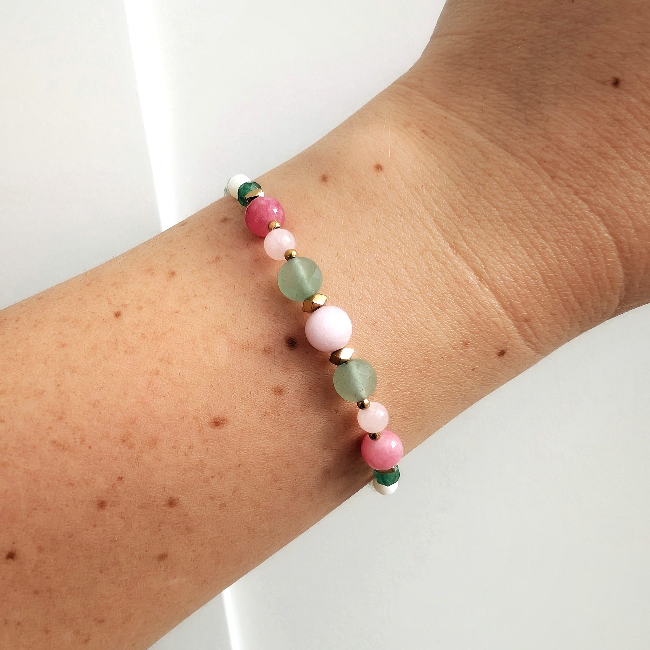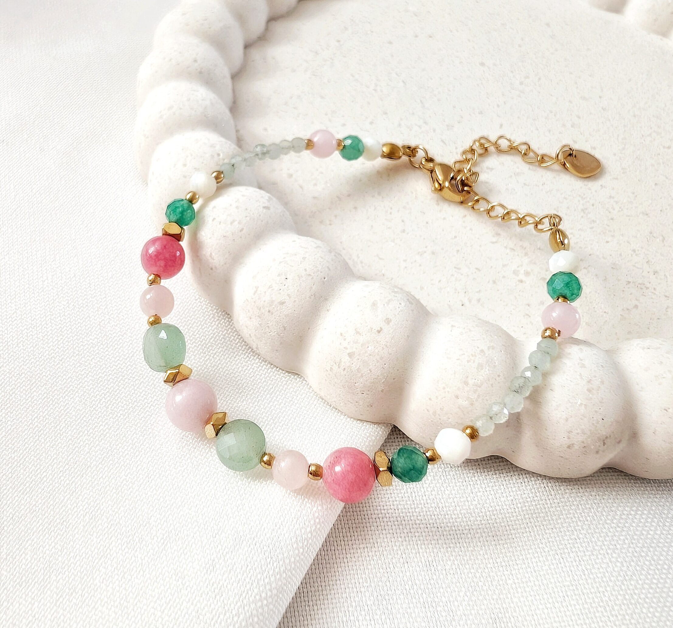 W tej kompozycji spotykają się zielony awenturyn i różowe jadeity. Kamienie, które razem tworzą paletę przypominającą kwietną łąkę skąpaną w słońcu.