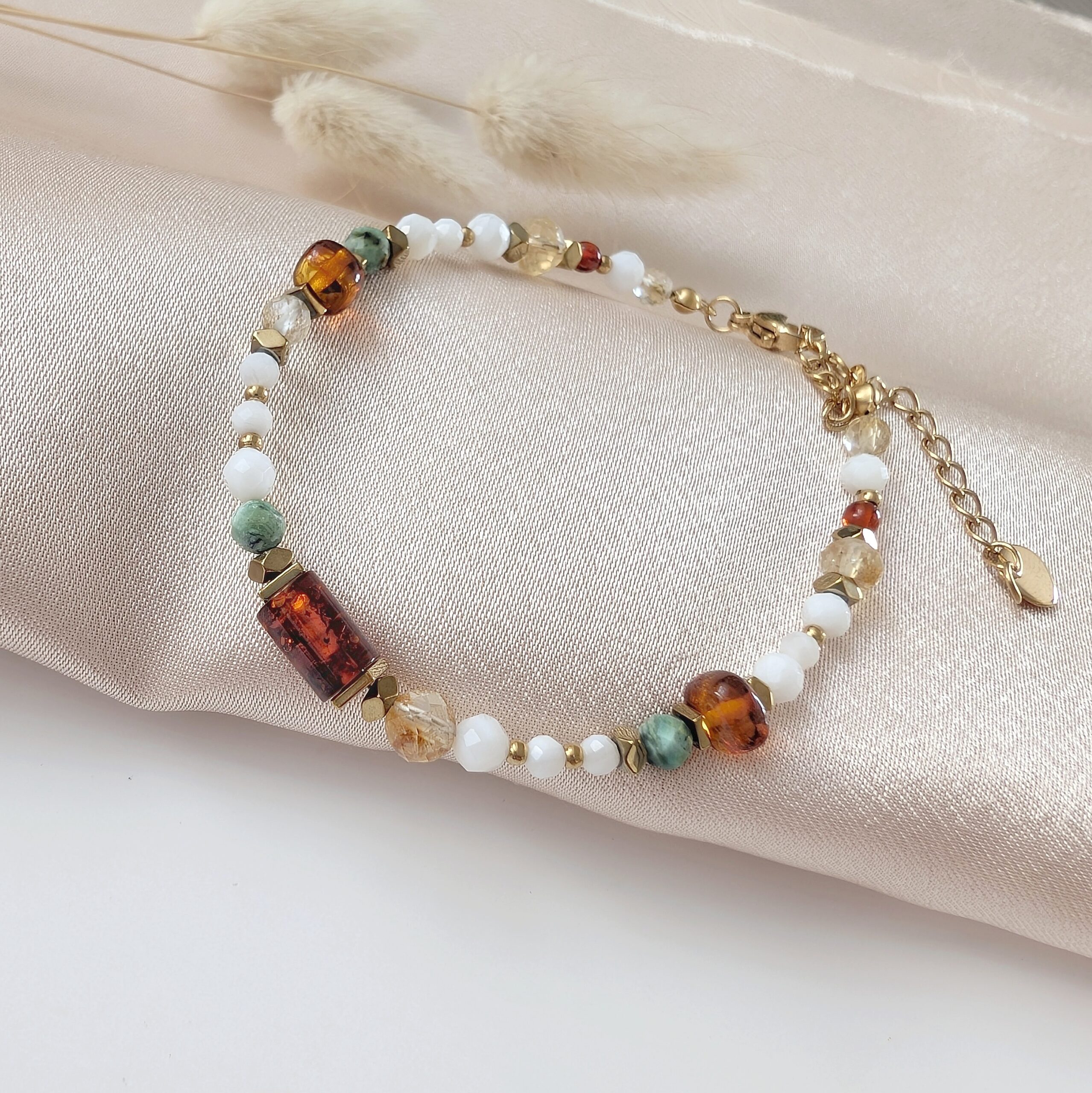 Bransoletka AMBERLYN to ciepła, biało – turkusowo – koniakowa kompozycja kamieni to idealny dodatek na tych, którzy chcą zatrzymać w sobie odrobinę lata na dłużej.