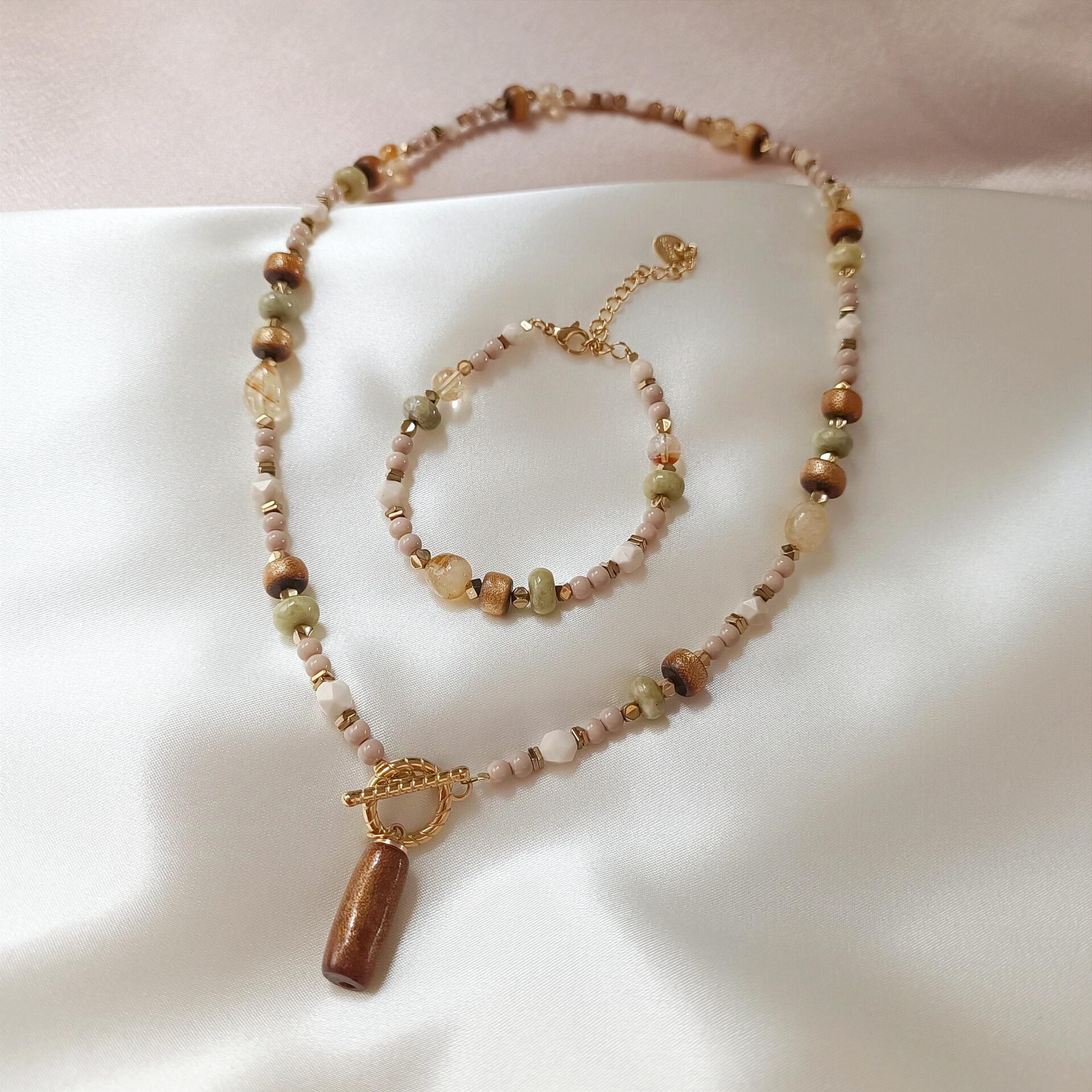 Bransoletka łączy w sobie energię oceanu i ziemi, tworząc unikalną kompozycję naturalnych kamieni. Koral, oliwin, cytryn, hematyt i kamień rzeczny zachwycają kontrastującymi barwami i wyjątkową symboliką, a ich połączenie nadaje biżuterii zarówno lekkości, jak i mocy.