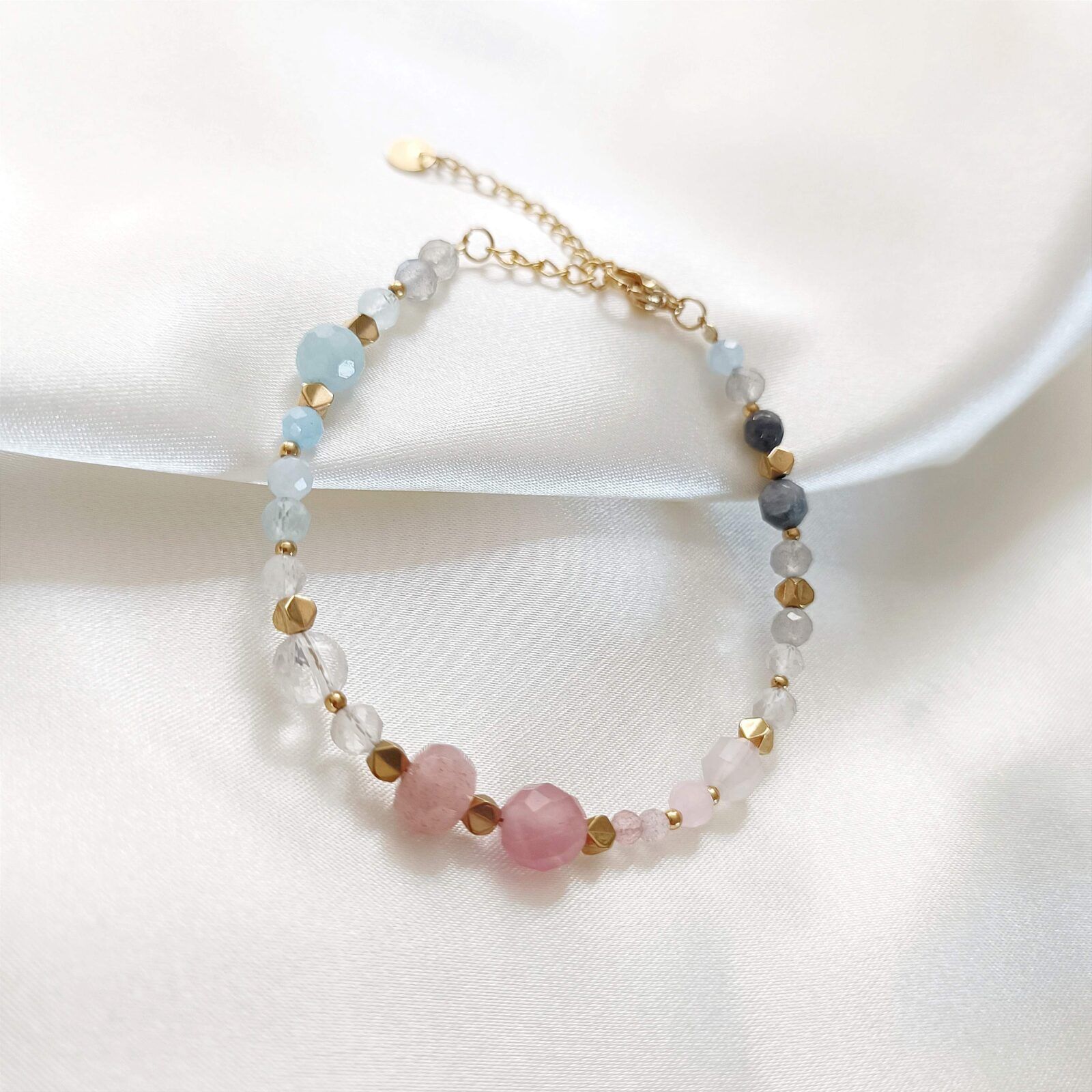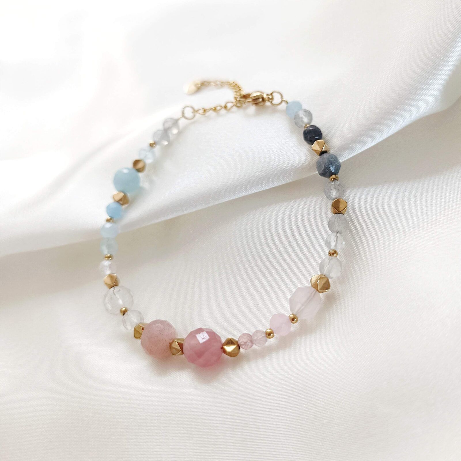 Bransoletka AVELINE wykonana z kamieni naturalnych: kryształ górski truskawkowy, kwarc różowy, akwamaryn, kryształ górski transparentny, labradoryt, kamień słoneczny i hematyt.