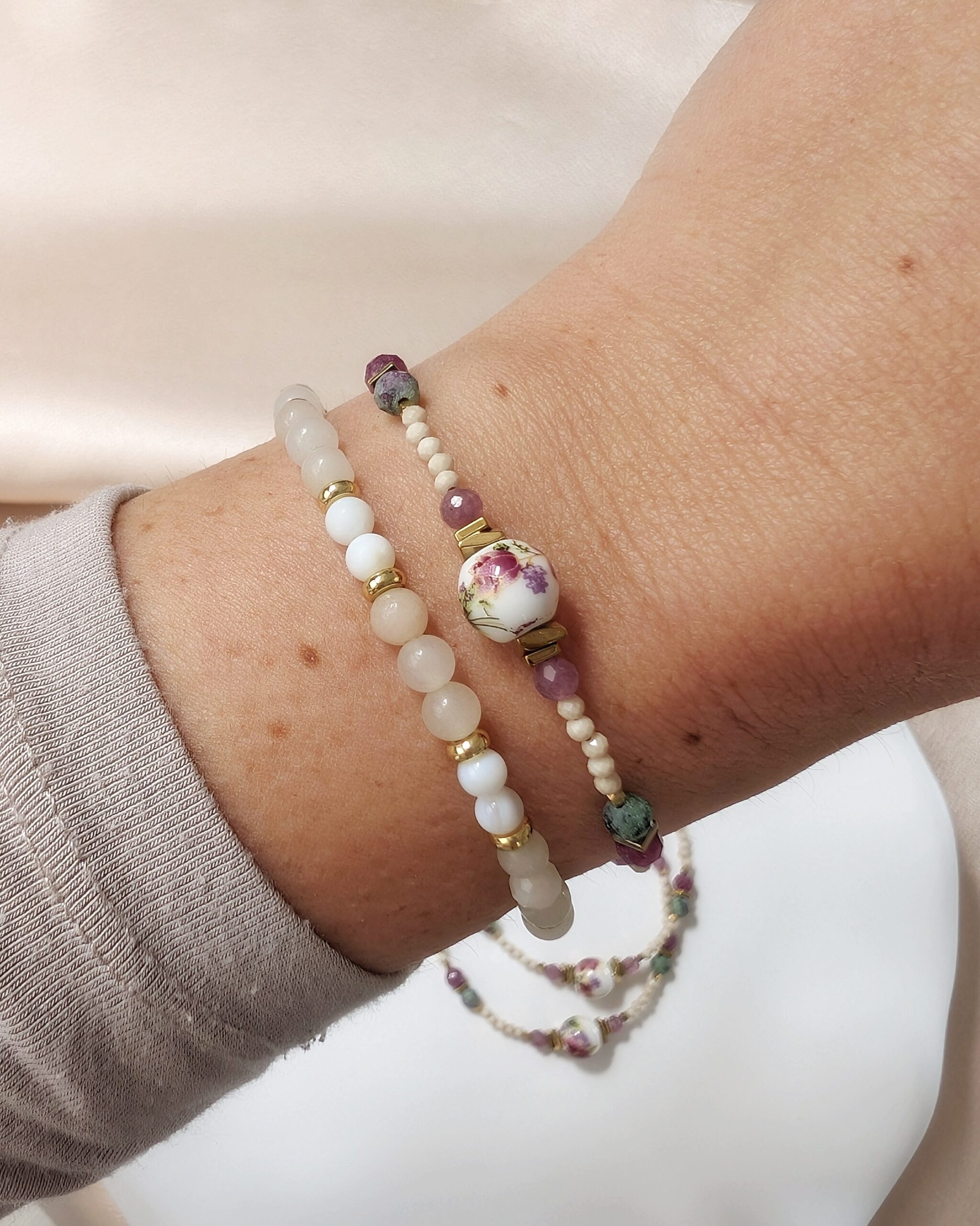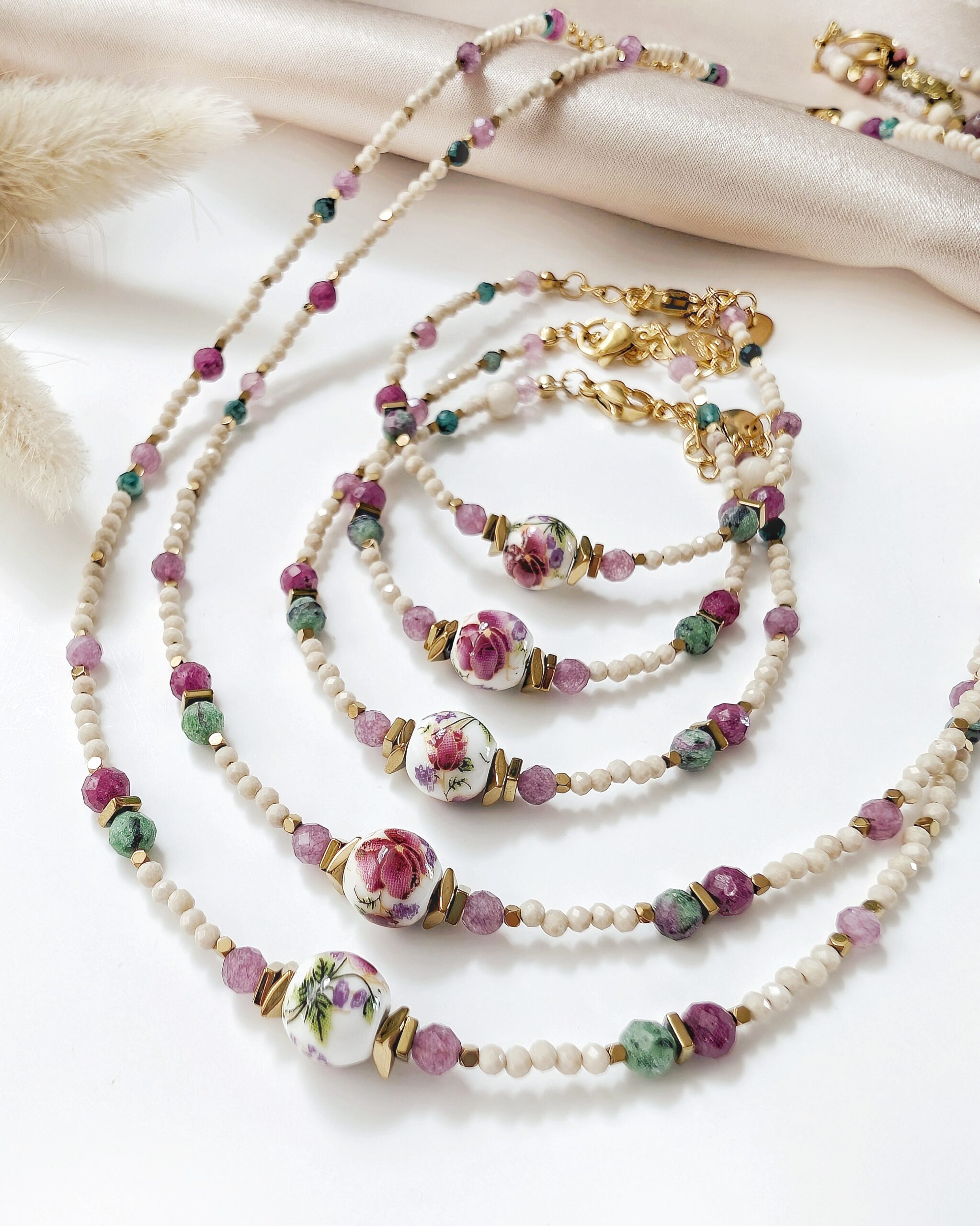 Pięknie wyeksponowany ceramiczny koralik z motywem kwiatów oraz dopasowane do niego kamienie naturalne: rubin – kamień miłości i namiętności, zoisyt – kamień regeneracji i emocjonalnego odrodzenia, wrzosowy chalcedon – kamień spokoju i komunikacji, zielony agat – kamień równowagi i harmonii, hematyt – kamień siły i uziemienia.