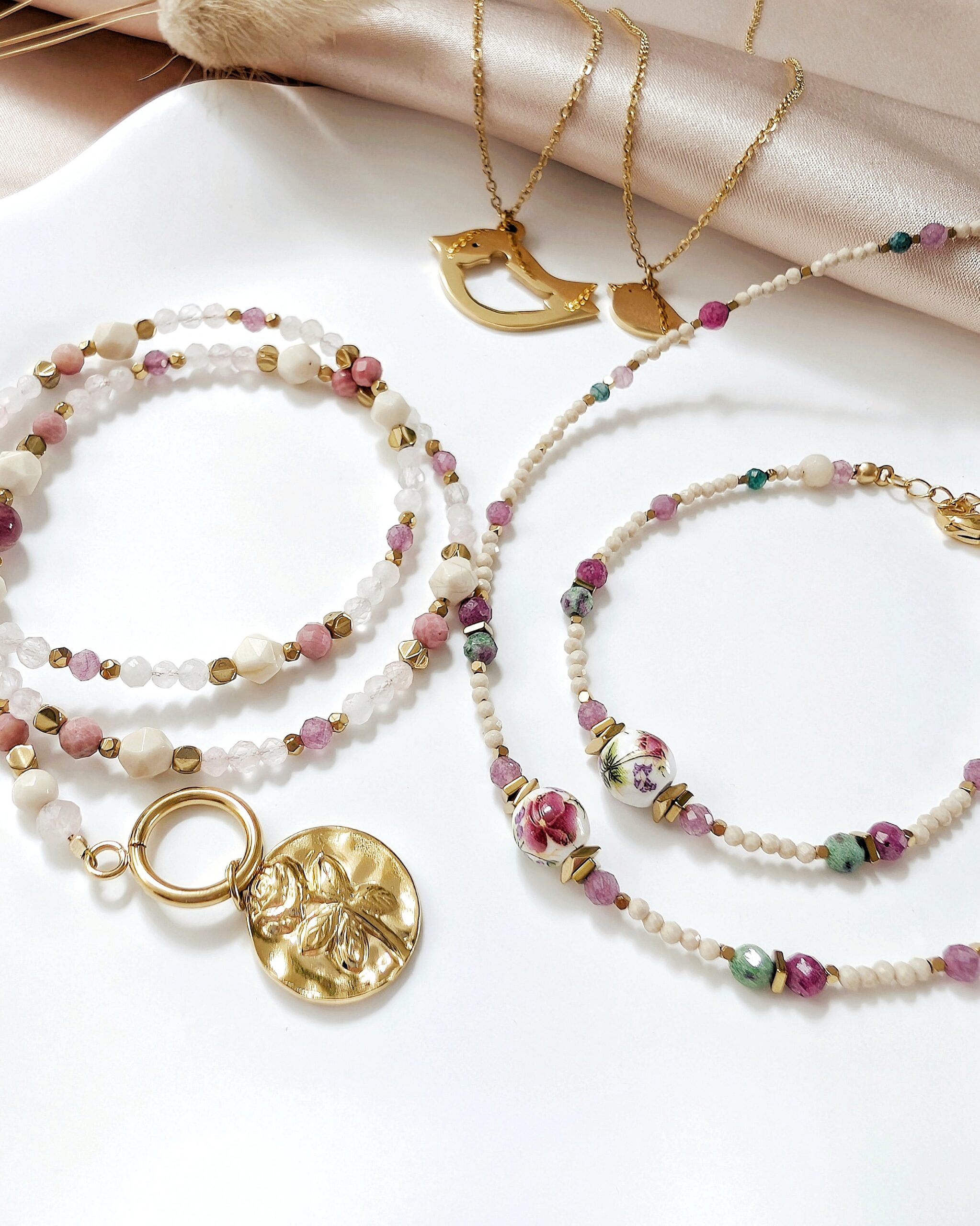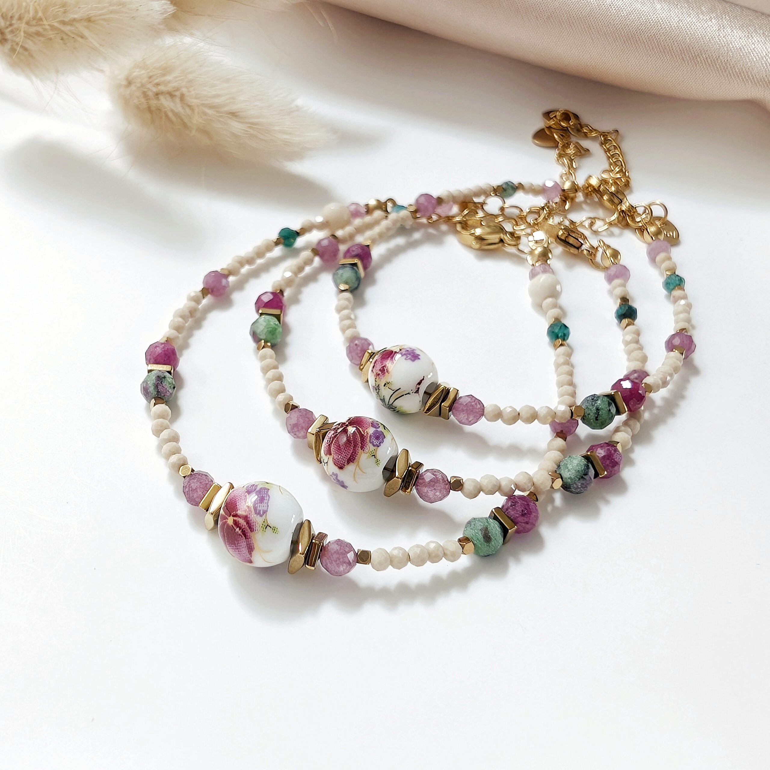 Pięknie wyeksponowany ceramiczny koralik z motywem kwiatów oraz dopasowane do niego kamienie naturalne: rubin – kamień miłości i namiętności, zoisyt – kamień regeneracji i emocjonalnego odrodzenia, wrzosowy chalcedon – kamień spokoju i komunikacji, zielony agat – kamień równowagi i harmonii, hematyt – kamień siły i uziemienia.