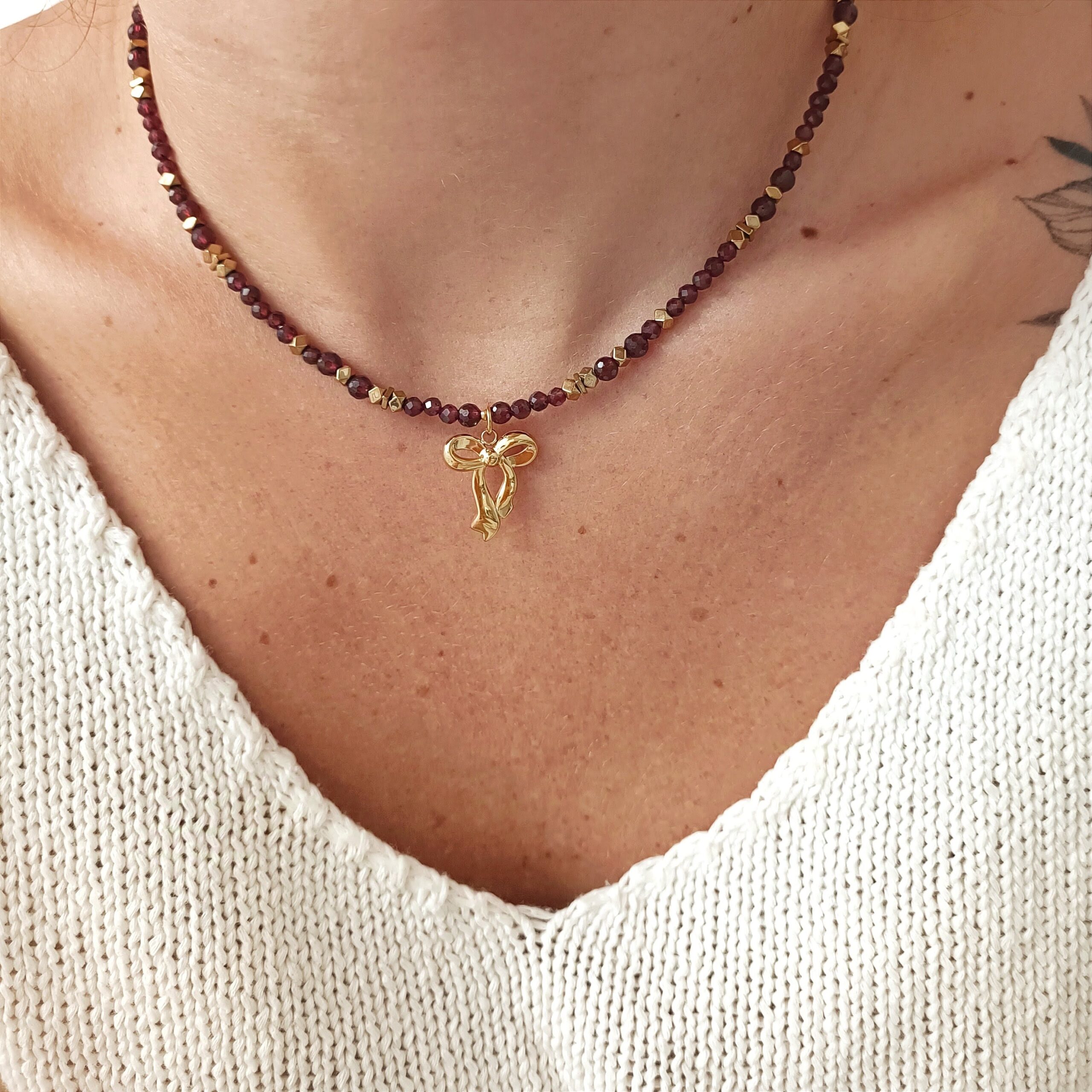 Choker to symbol subtelnej elegancji, który doskonale podkreśla szyję, nadając stylizacji wyrafinowanego charakteru. W tym modelu klasyczna forma została wzbogacona o naturalny granat oraz hematyt w kolorze złotym, tworząc biżuterię o głębokiej symbolice i niepowtarzalnym uroku.