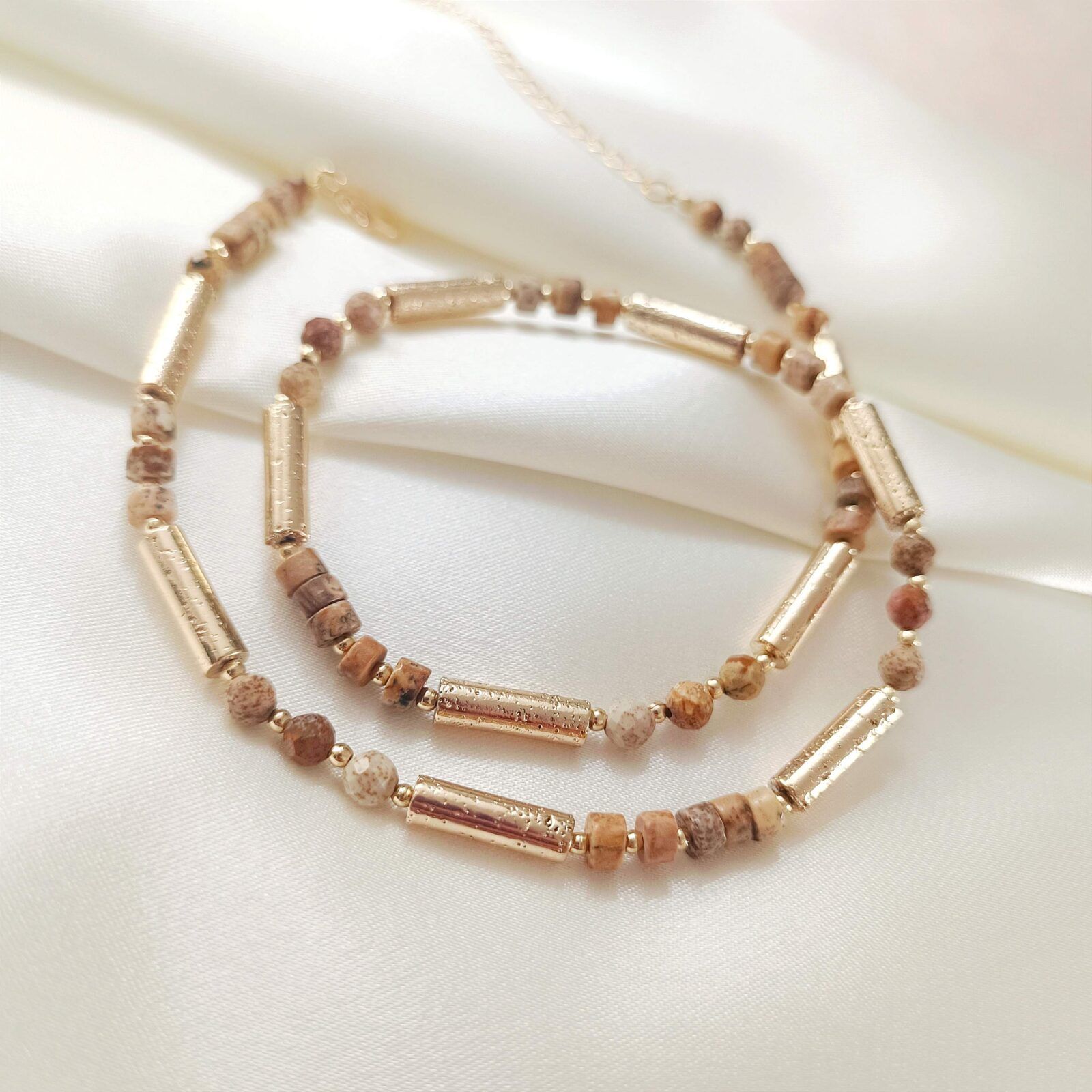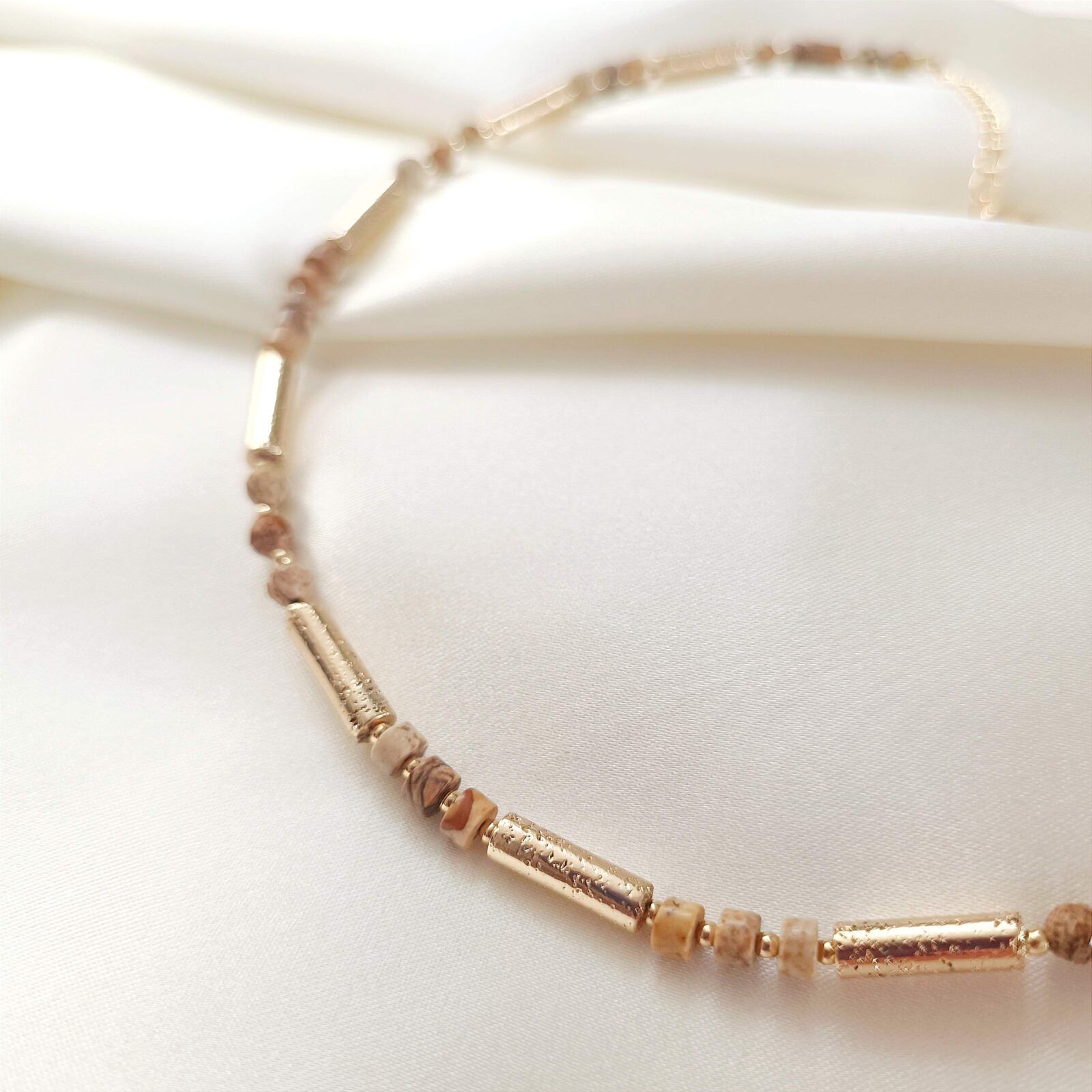 Choker AURIEN wykonany z jaspisu krajobrazowego, rozświetlony lawą wulkaniczną w kolorze złotym.