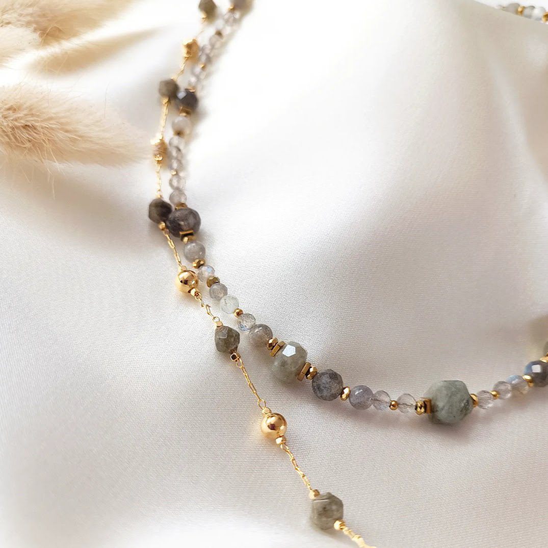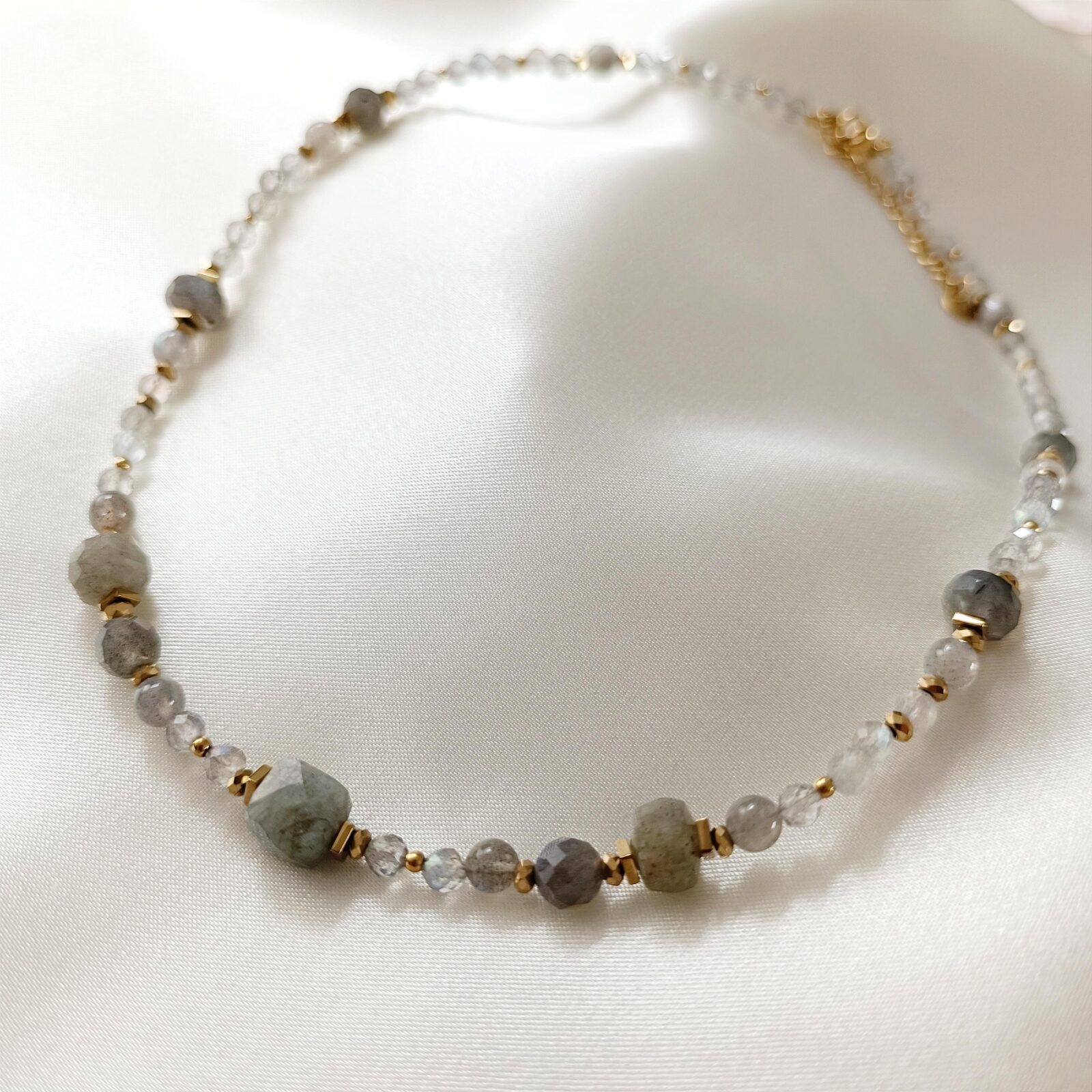 Naszyjnik – kamień naturalny labradoryt i złoty hematyt.