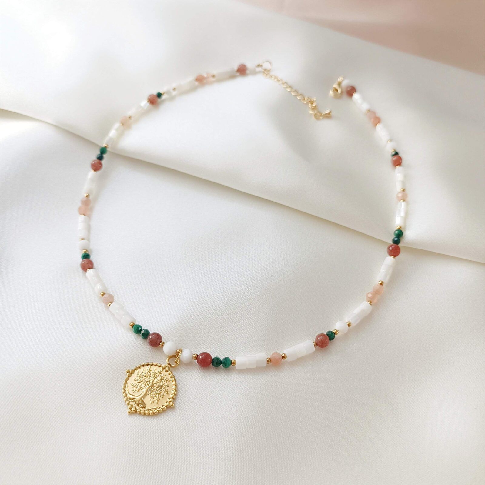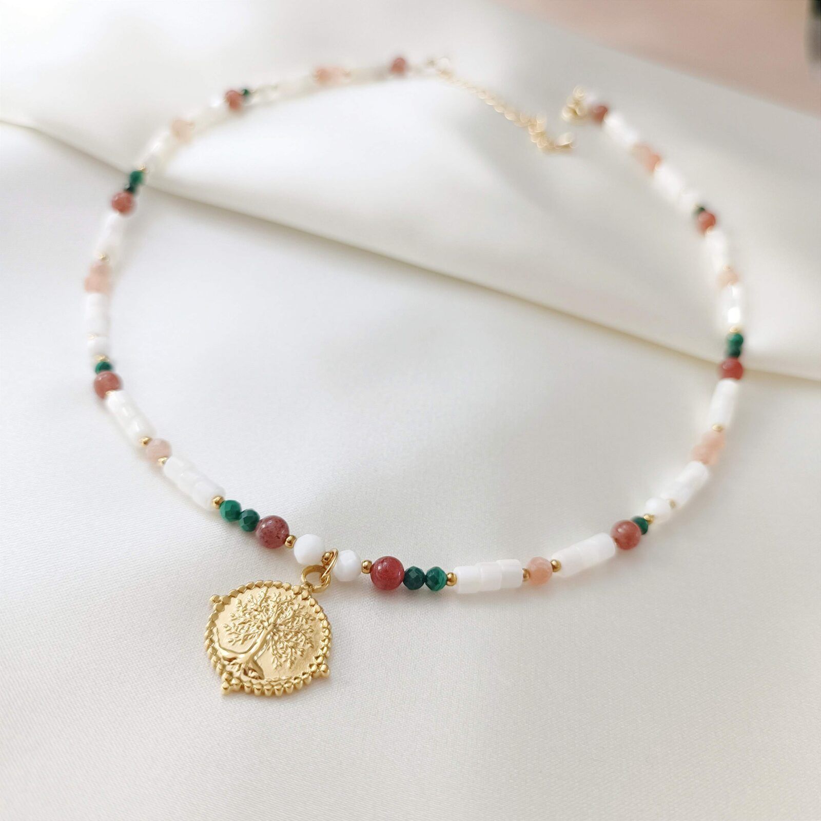 Kolory ziemi – brązowy awenturyn, malachit w kolorze głębokiej zieleni, ciepły kamień słoneczny oraz delikatnie przełamana biel masy perłowej i muszli. Barwy, od których bije spokój.