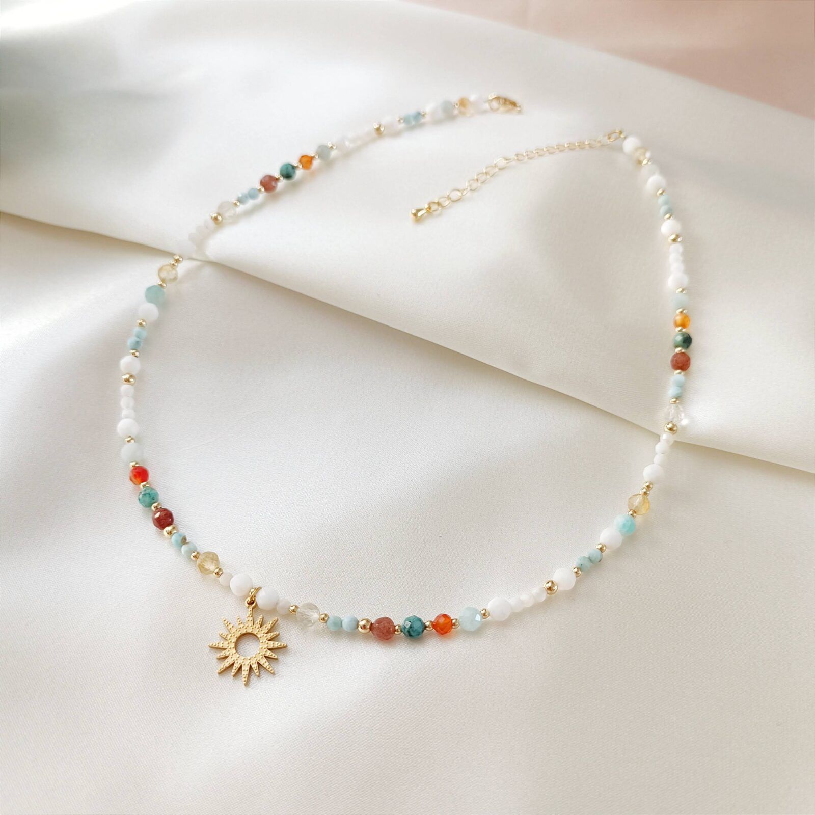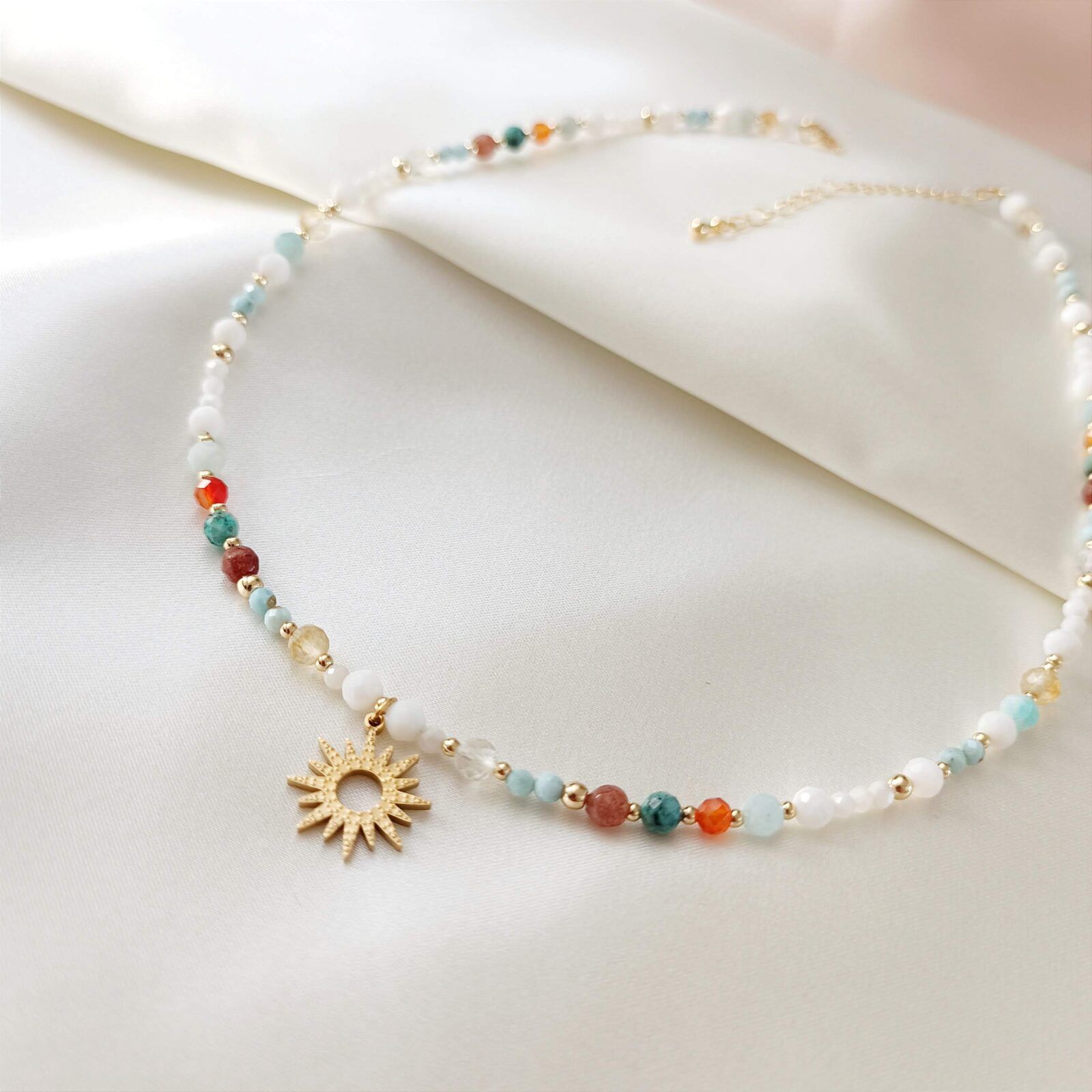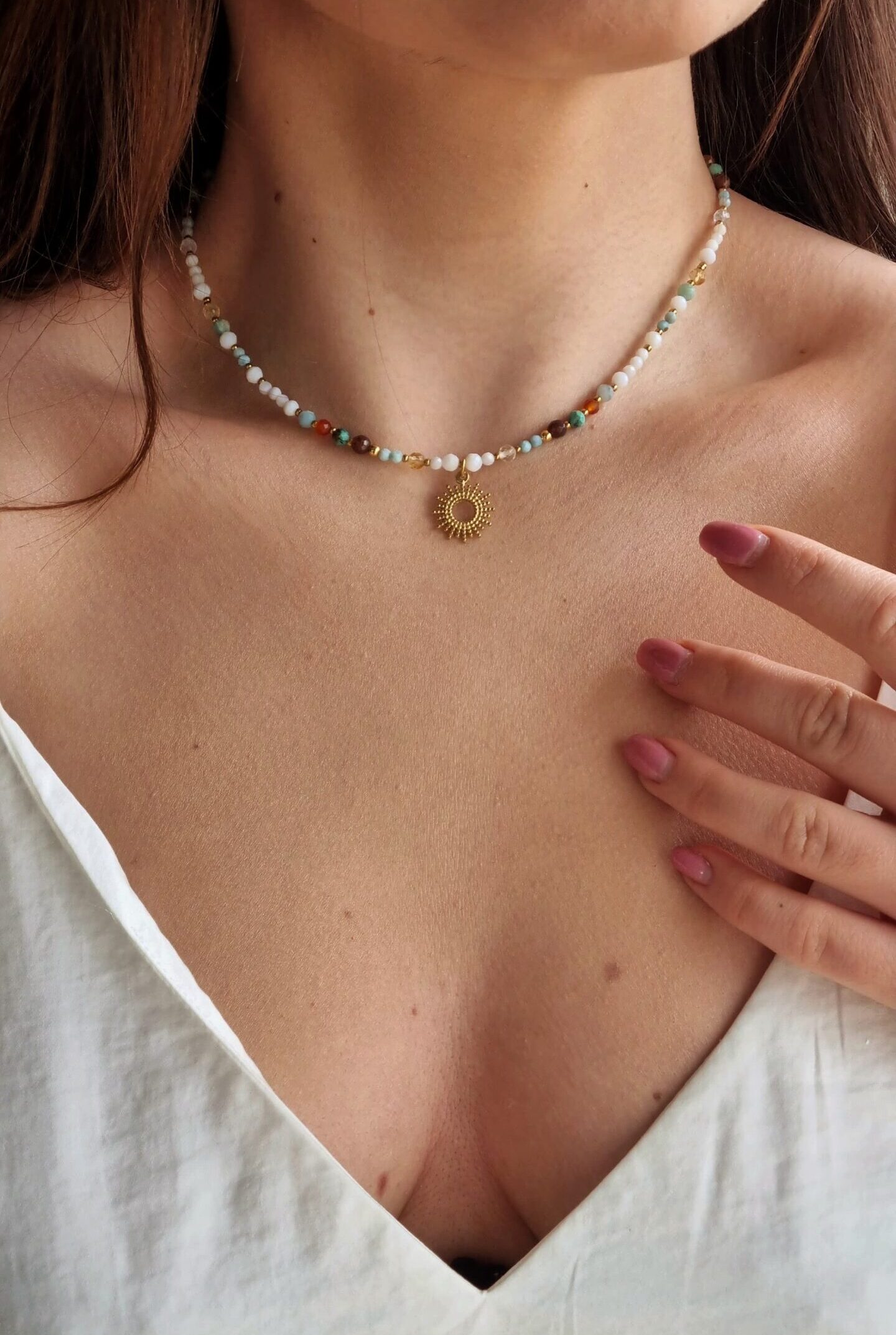 Choker SOLMARE to biel naturalnej, białej muszli przełamana kolorowymi kamieniami: larimar, amazonit, awenturyn, turkus afrykański, karneol, cytryn.