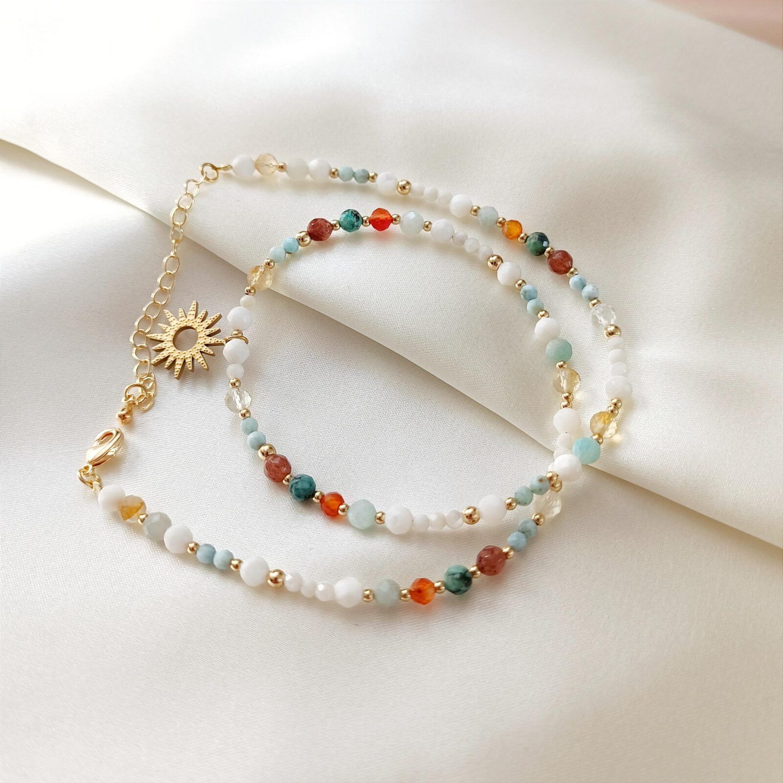 Kamienie naturalne: larimar, amazonit, awenturyn, turkus afrykański, karneol, cytryn.