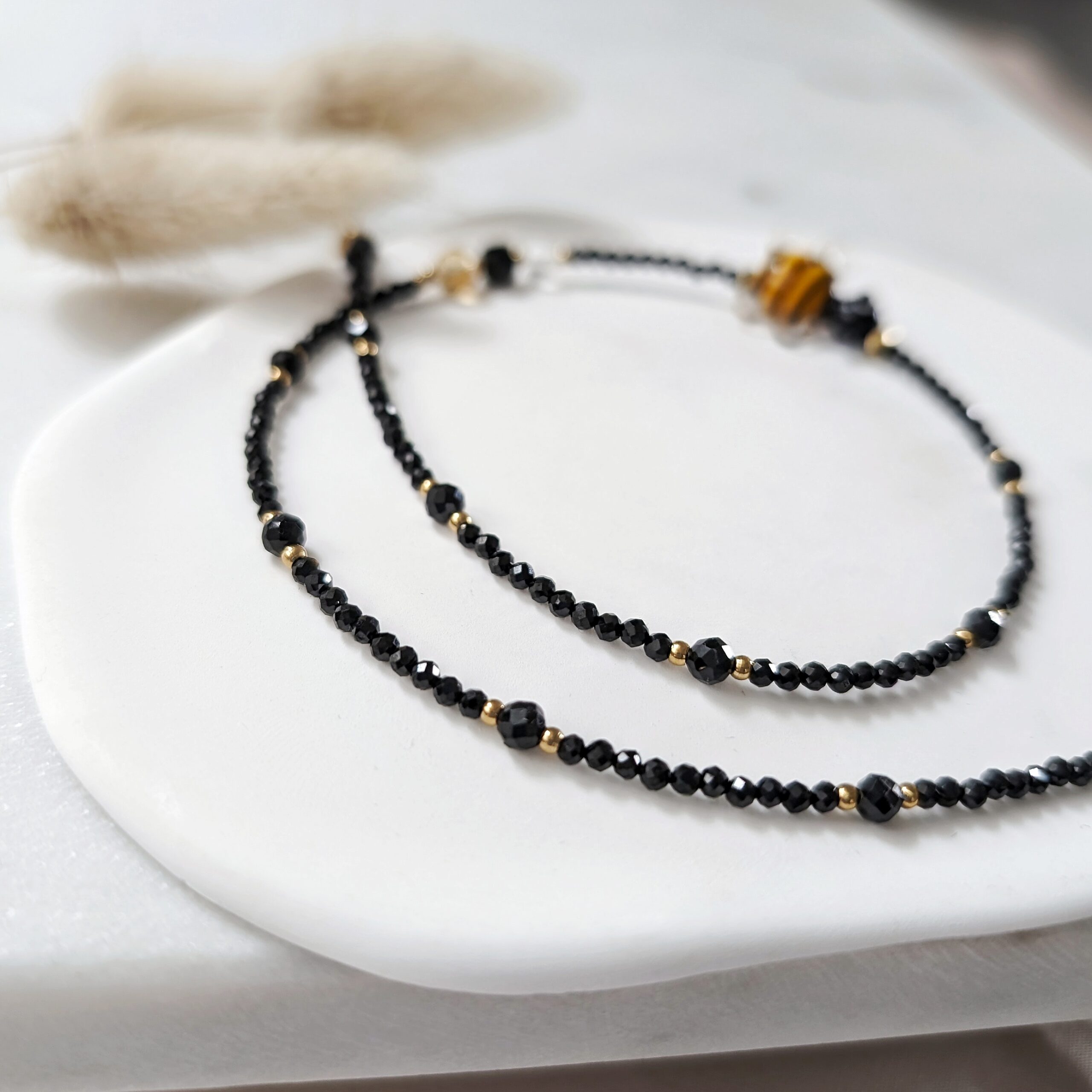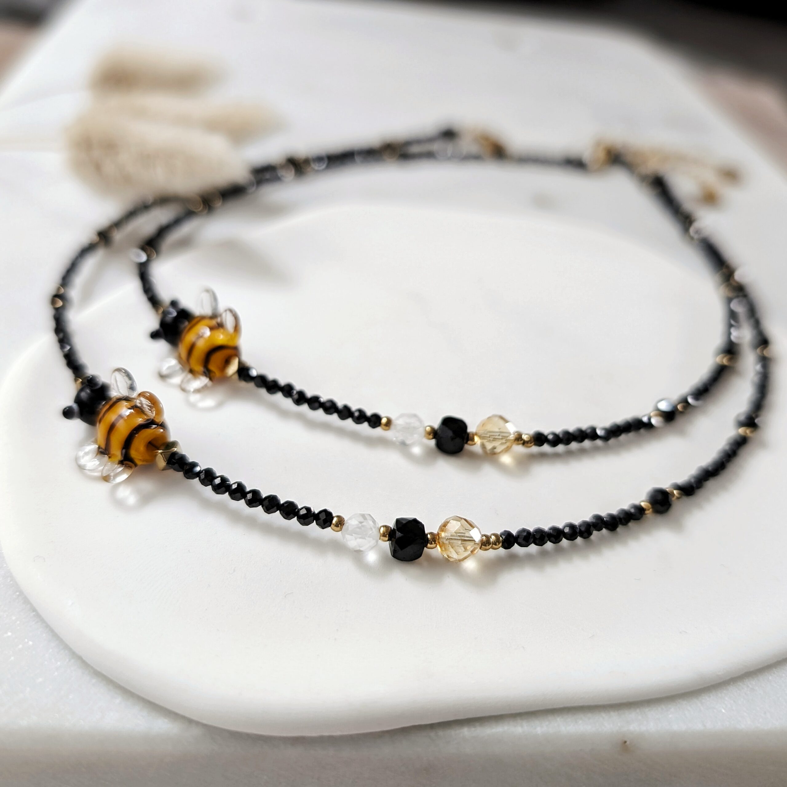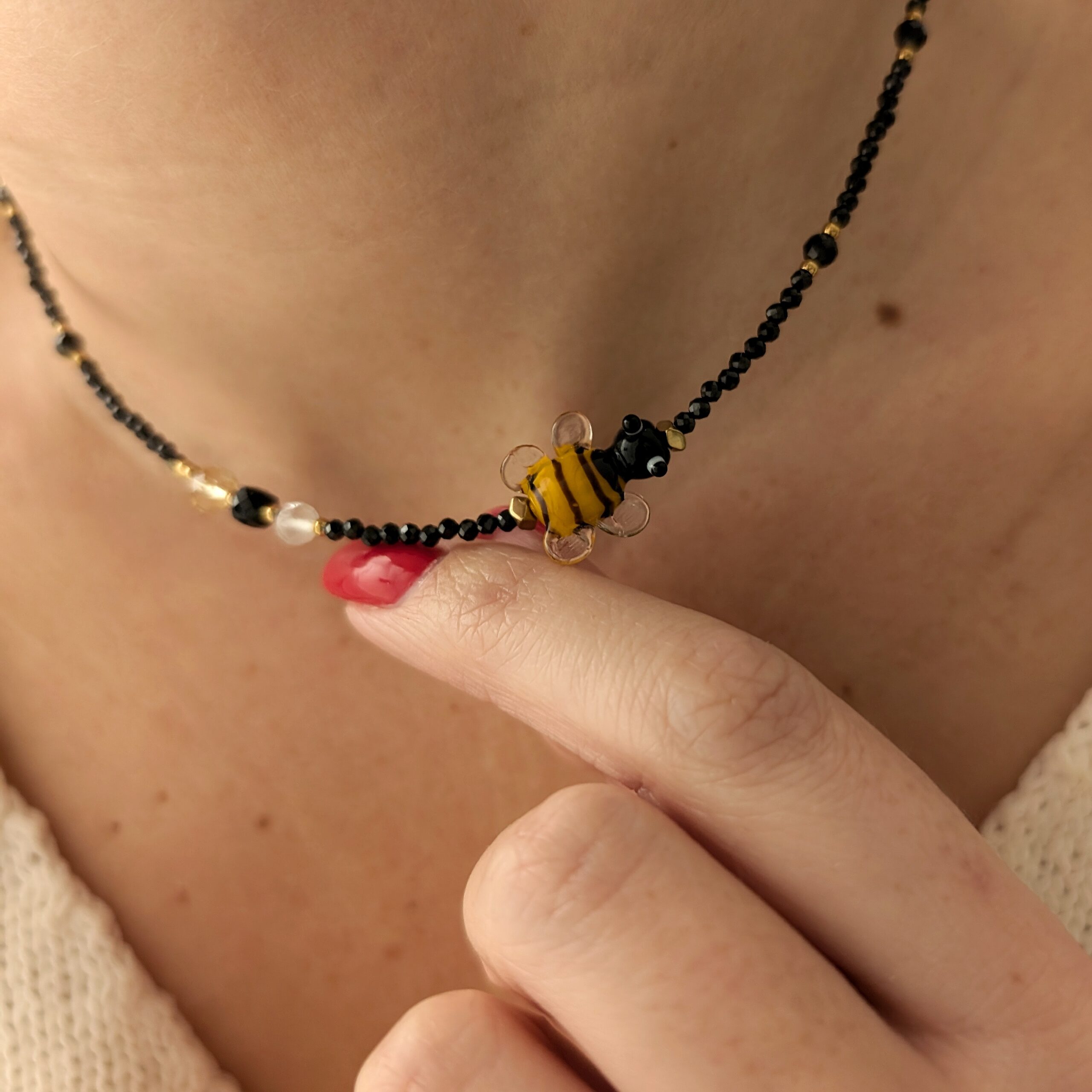 Choker z uroczą, szklaną pszczółką. Wykonany na bazie czarnego spinelu – drobne kamyczki 2 i 3 mm.