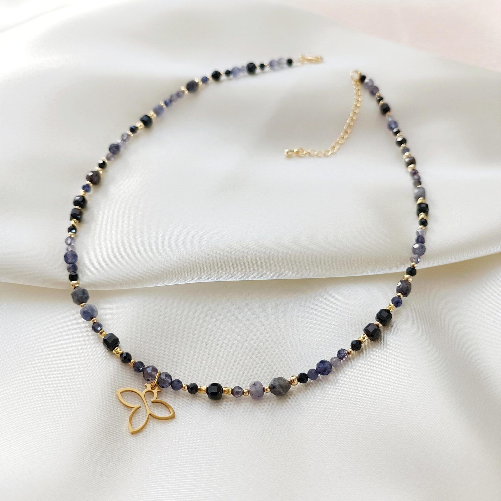 W naszyjniku wykorzystano kordieryt, spinel, labradoryt i tanzanit – minerały o silnym działaniu ochronnym, wspierające intuicję, duchowy rozwój oraz procesy wewnętrznej transformacji.