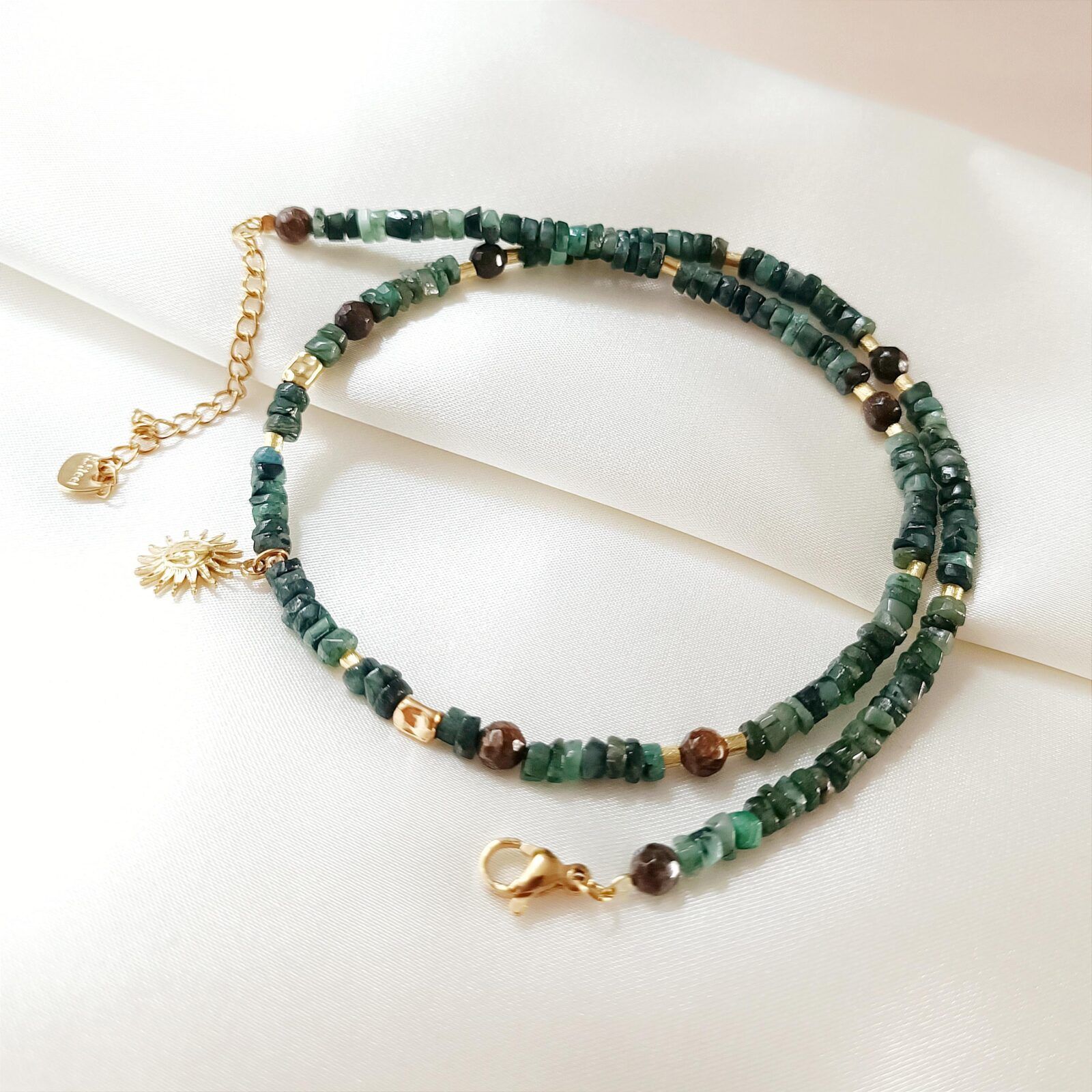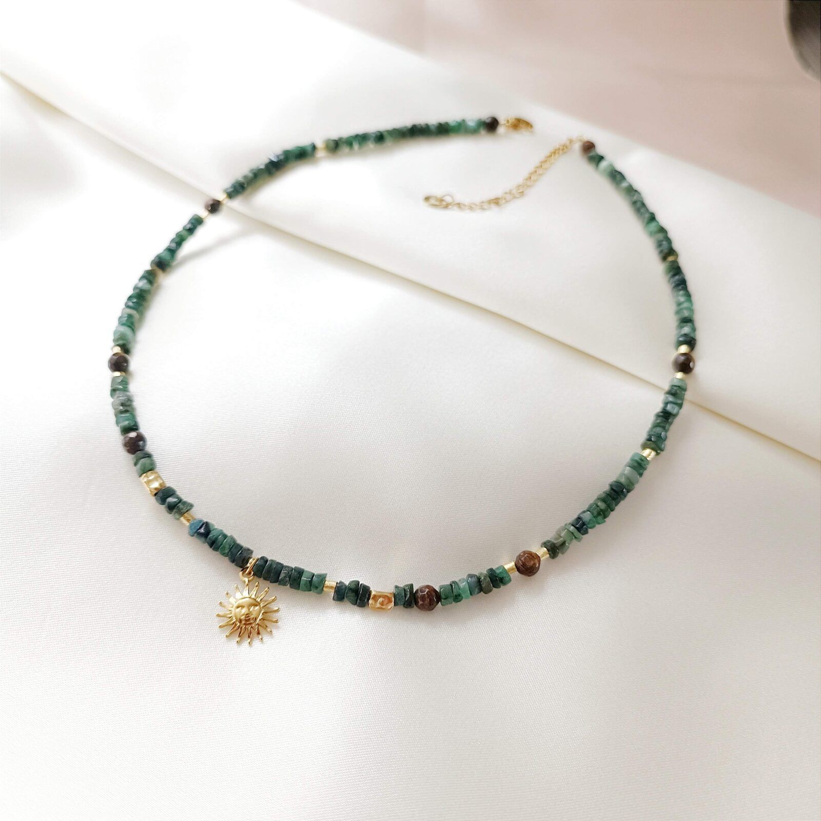Za przepiękny odcień zieleni w naszyjniku FORESTA odpowiada naturalny szmaragd w postaci nieregularnych talarków.