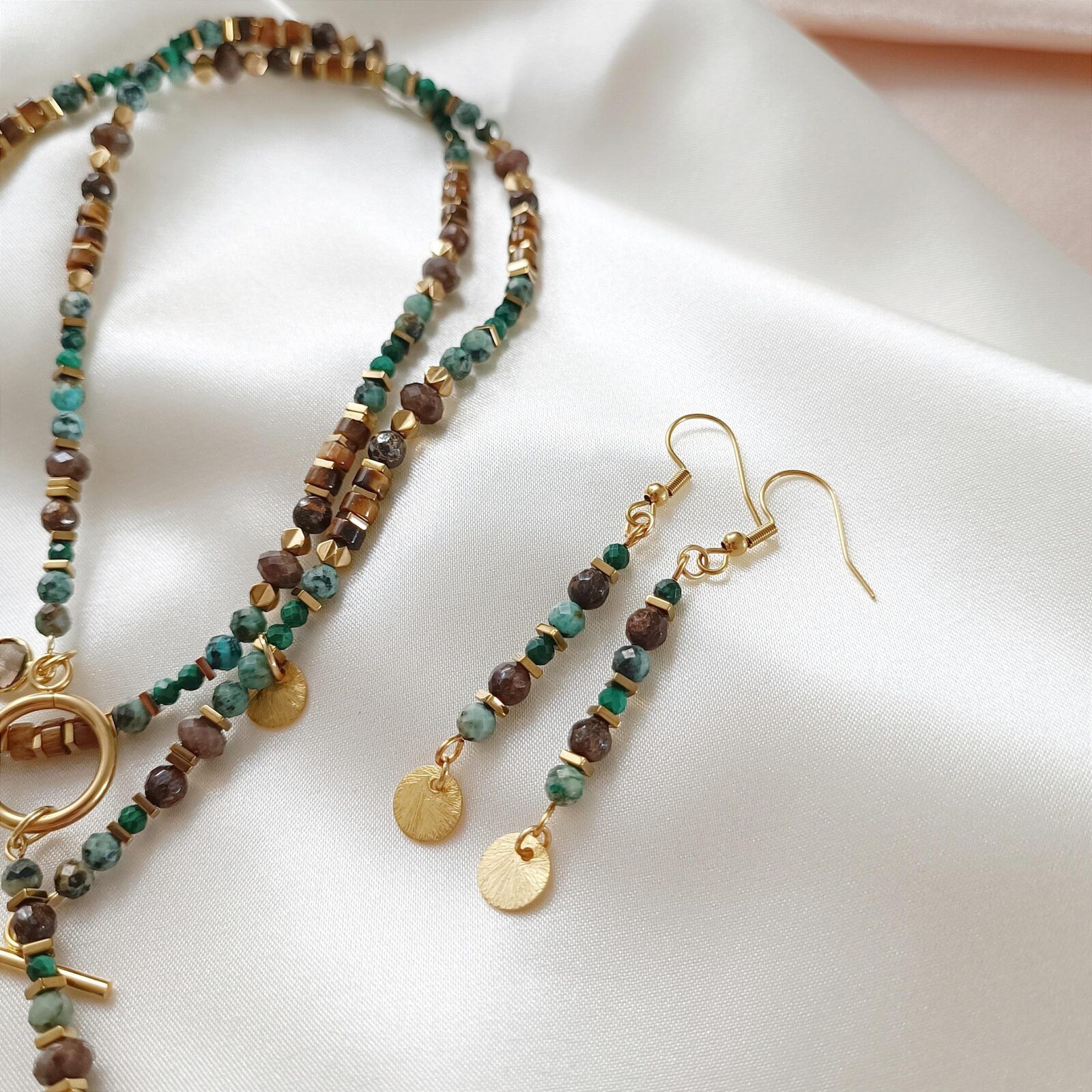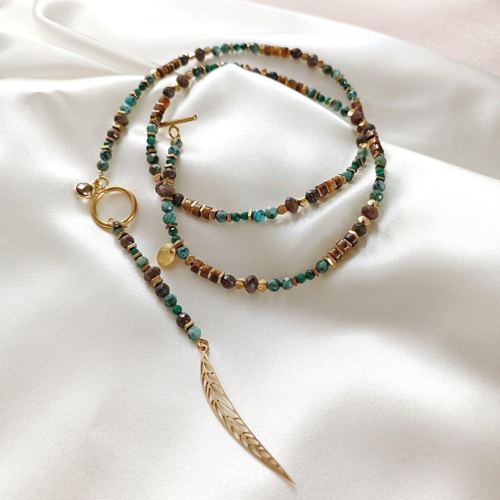 Długi naszyjnik ZEMIRA z malachitem i tygrysim okiem – styl boho, siła i harmonia