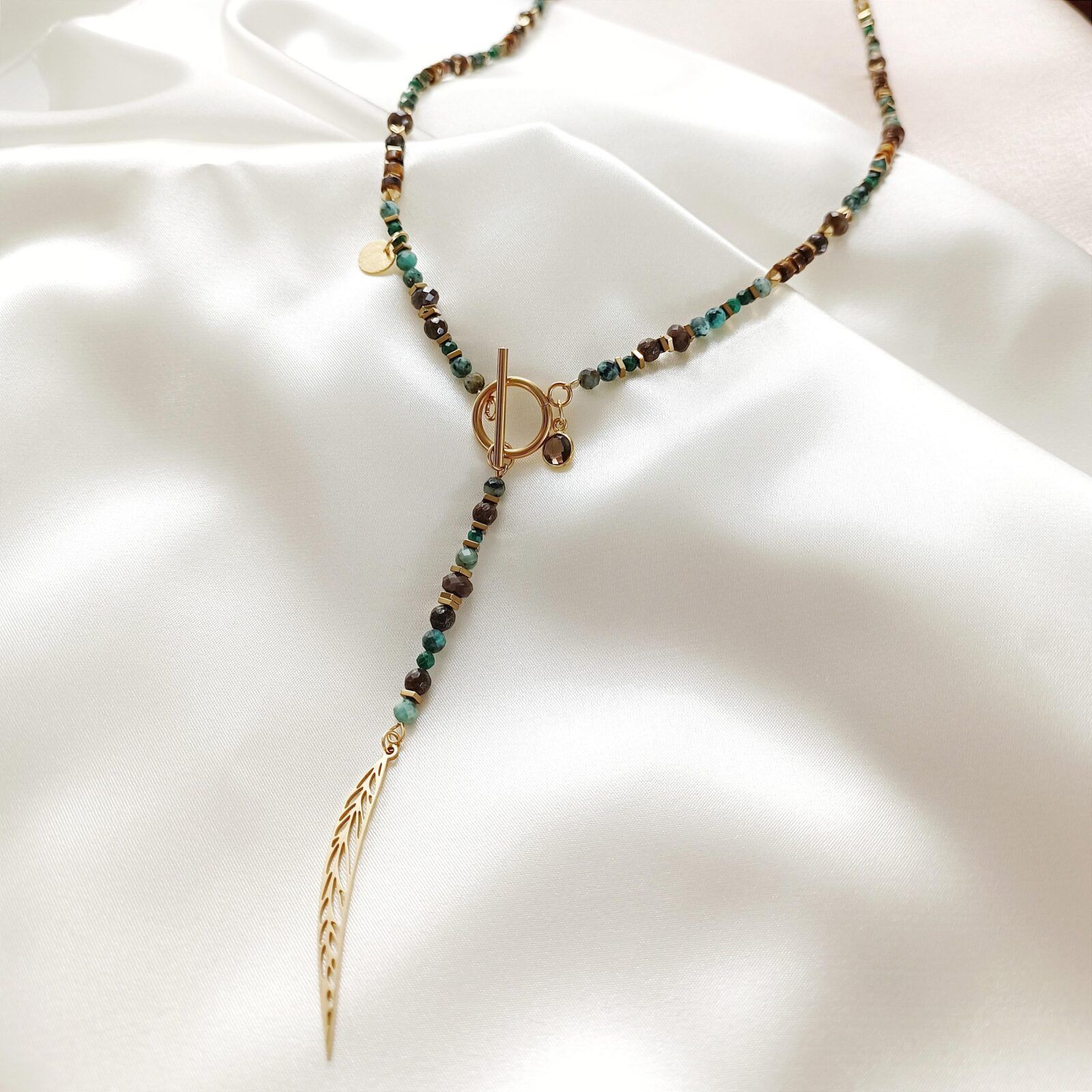 Długi naszyjnik w stylu boho to wyjątkowa kompozycja minerałów, które nie tylko przyciągają wzrok swoją różnorodnością, ale także niosą głęboką symbolikę. Połączenie tygrysiego oka, malachitu, bronzytu, turkusu afrykańskiego, jaspisu i hematytu tworzy harmonijną całość, która może stać się osobistym talizmanem pełnym energii i ochrony.