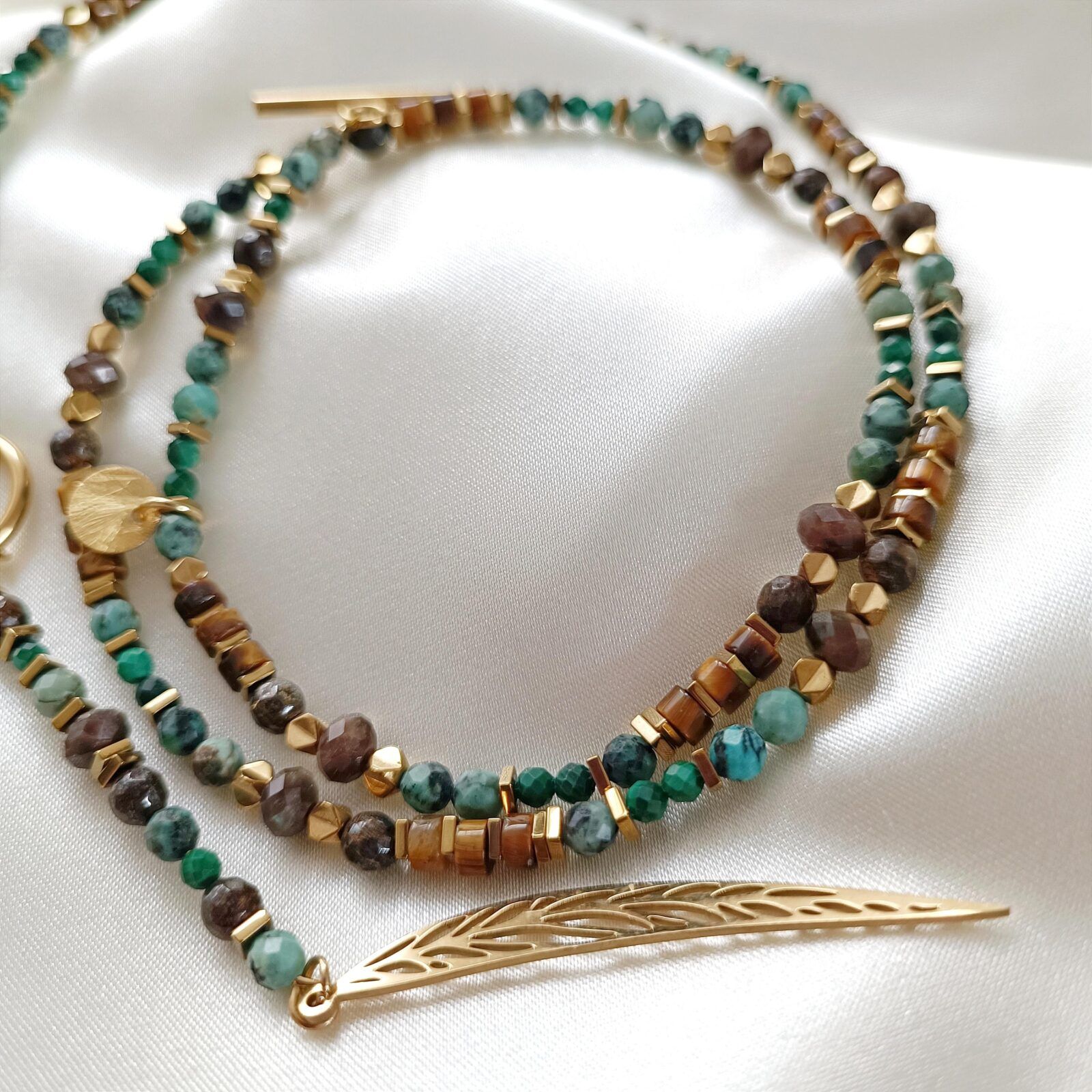 Każdy egzemplarz naszyjnika jest starannie wykonany ręcznie, co podkreśla jego unikalność. Naturalne kamienie tworzą harmonijną kompozycję, która może stać się osobistym talizmanem – dodającym siły, odwagi i wewnętrznej równowagi.