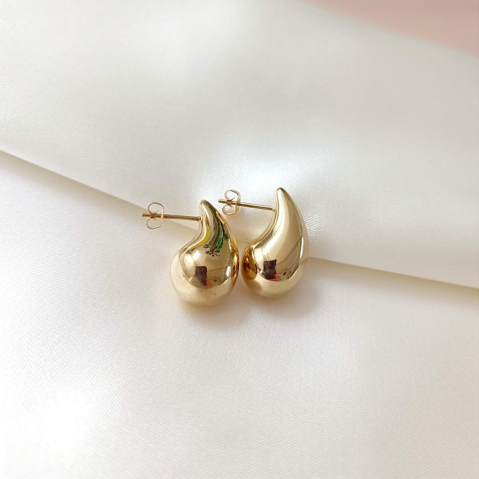 Kolczyki w kształcie kropli 3D. Wykonane z antyalergicznej stali chirurgicznej, złoconej metodą PVD, uznawaną za dużo trwalszą od zwykłego złocenia kąpielowego.