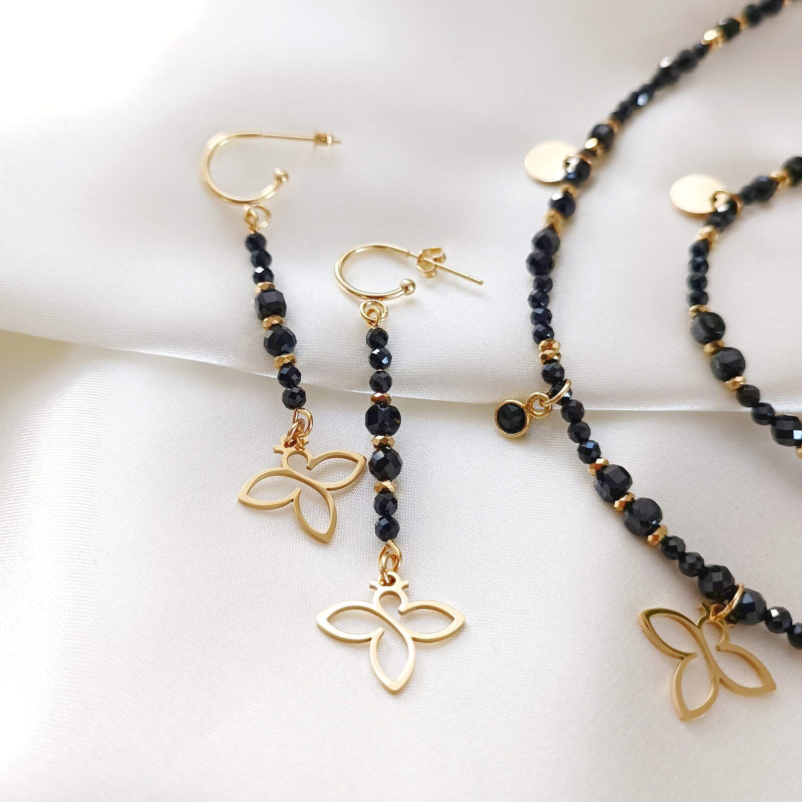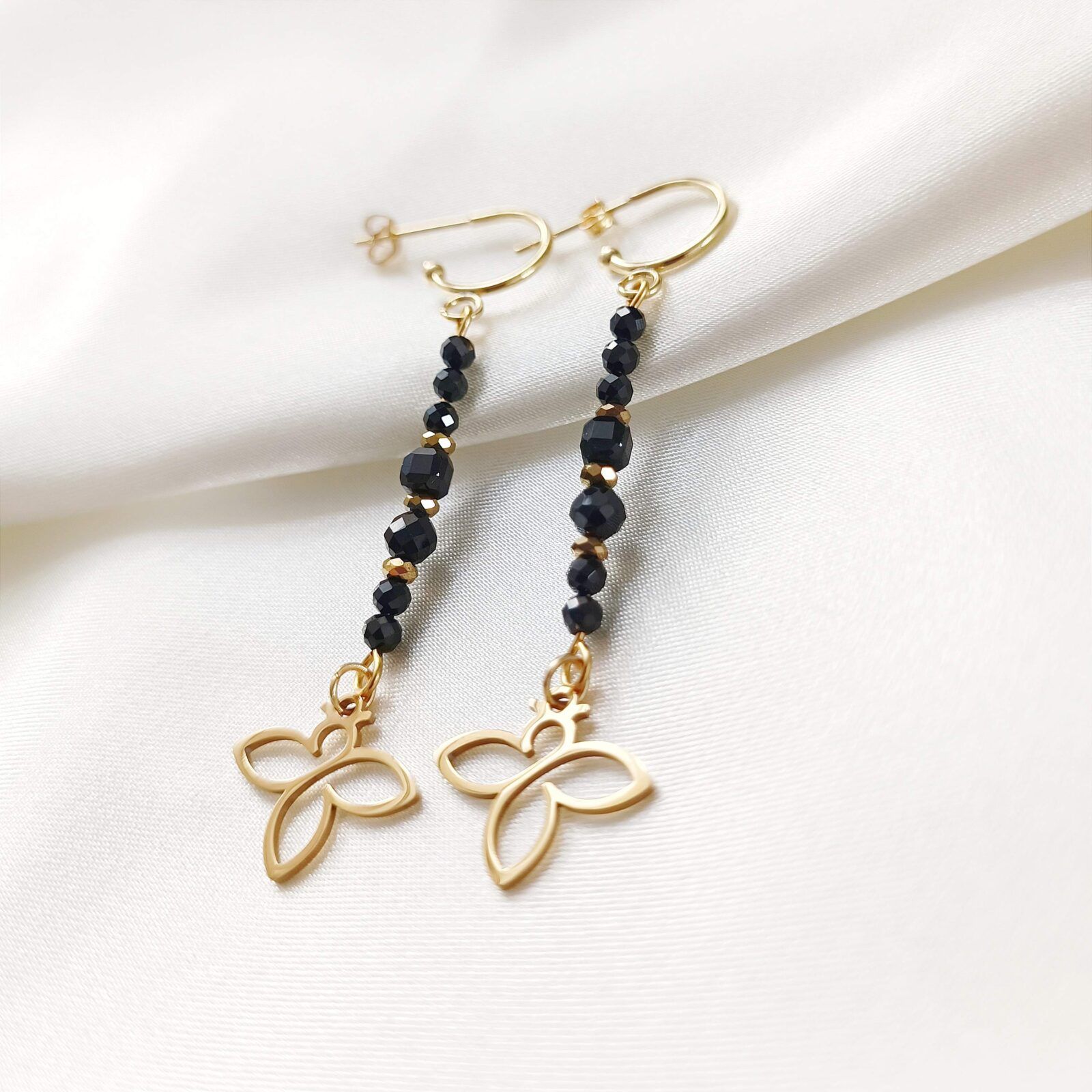 Wypełnione czarnym spinelem, zakończone autorskimi zawieszkami Beezu.