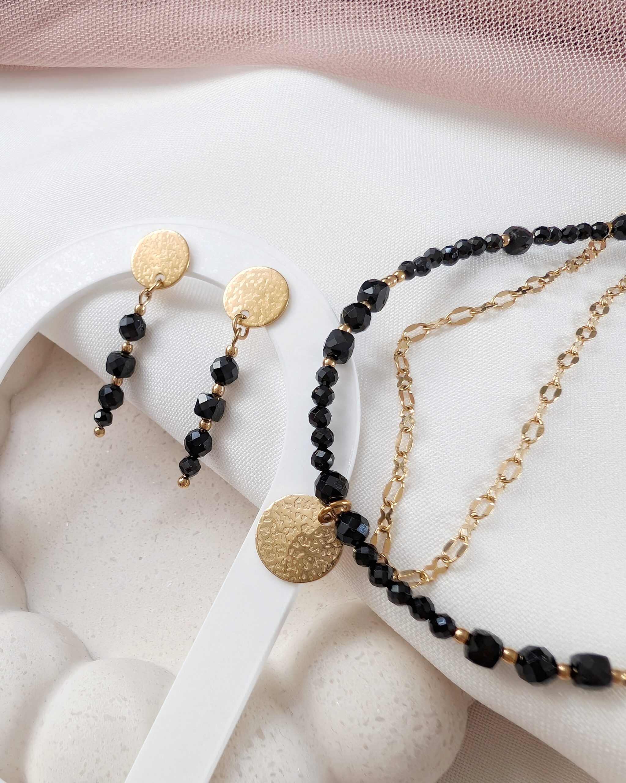 Wiszące kolczyki z czarnymi kamieniami to elegancki i uniwersalny dodatek zarówno na co dzień, jak i na specjalne okazje.