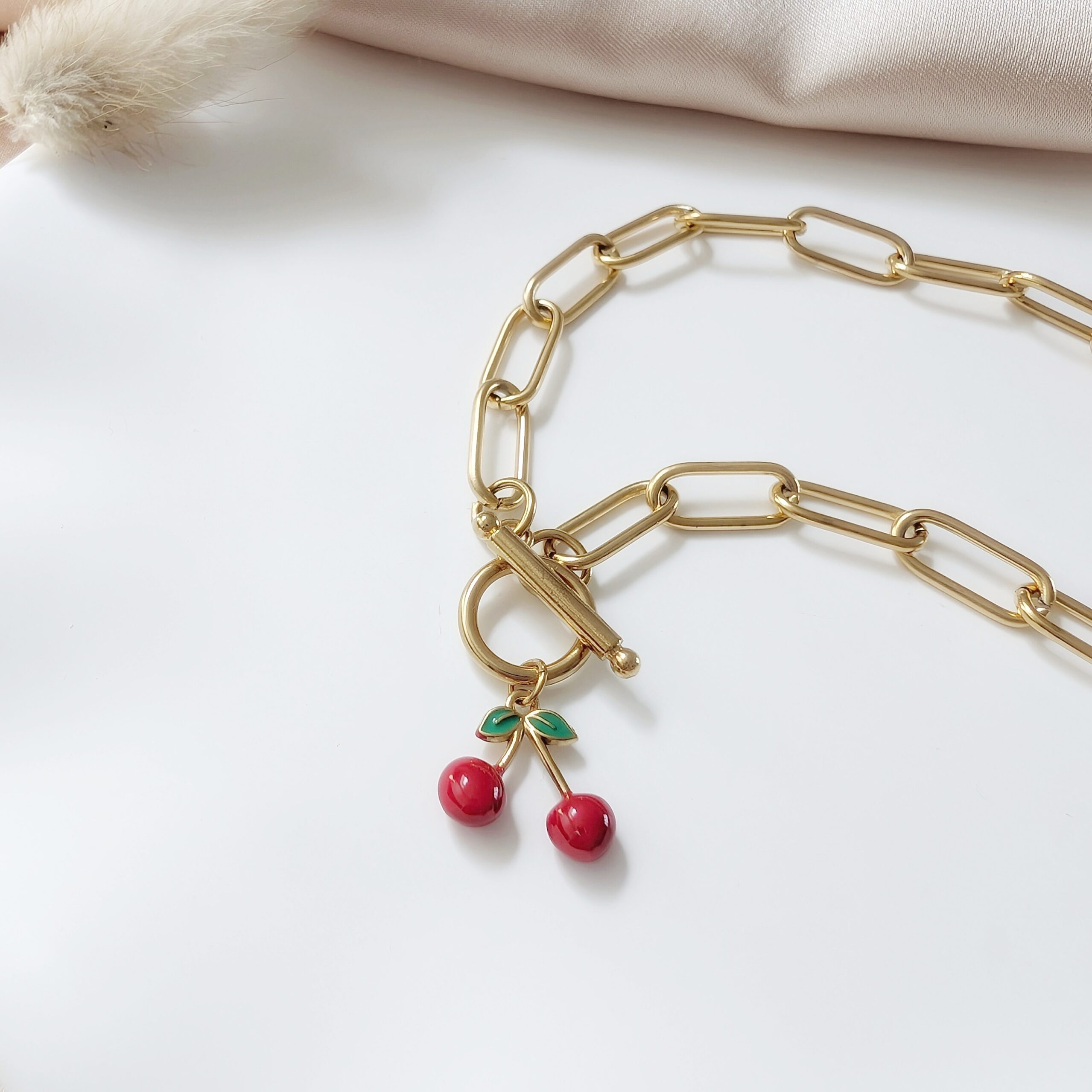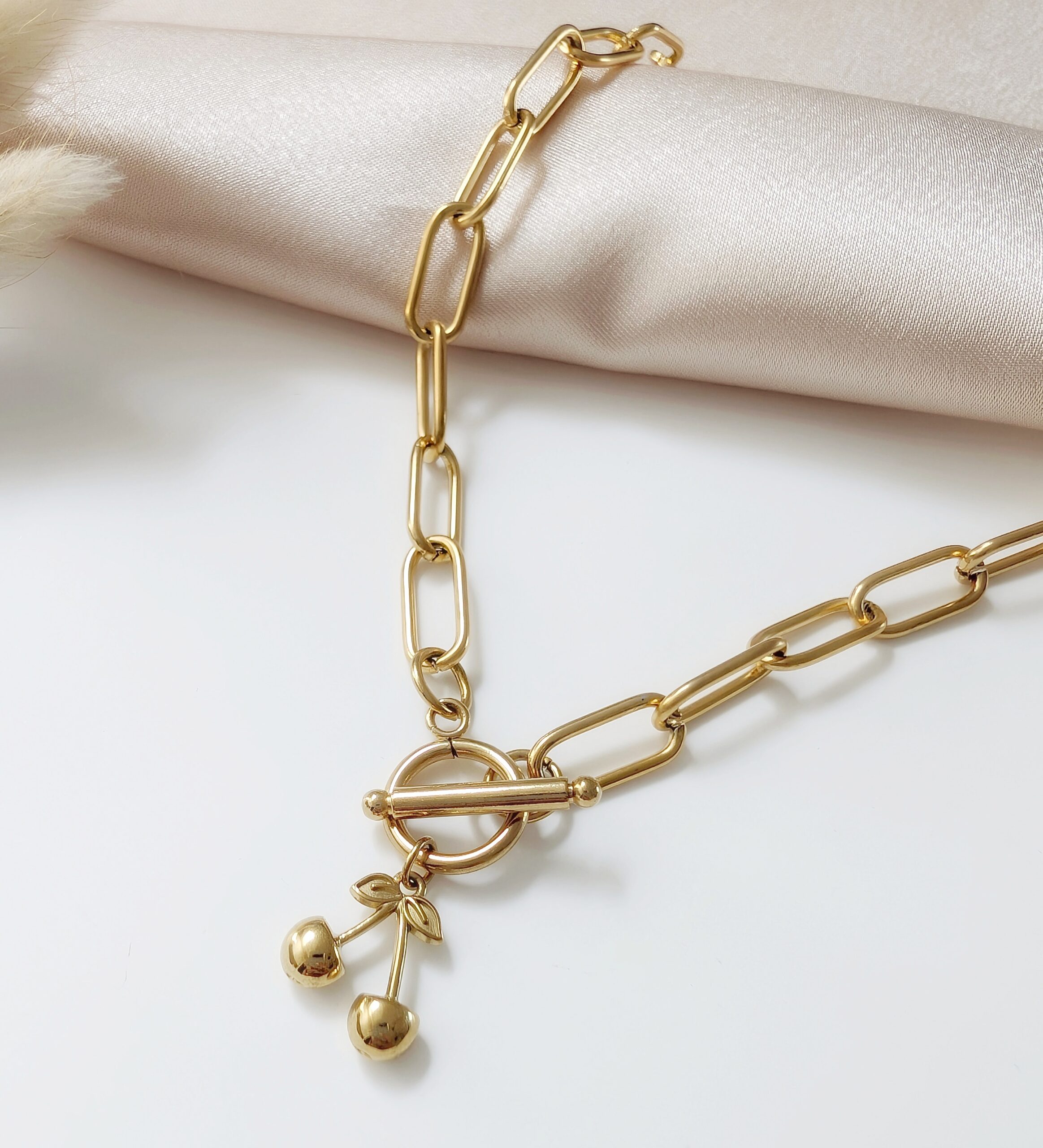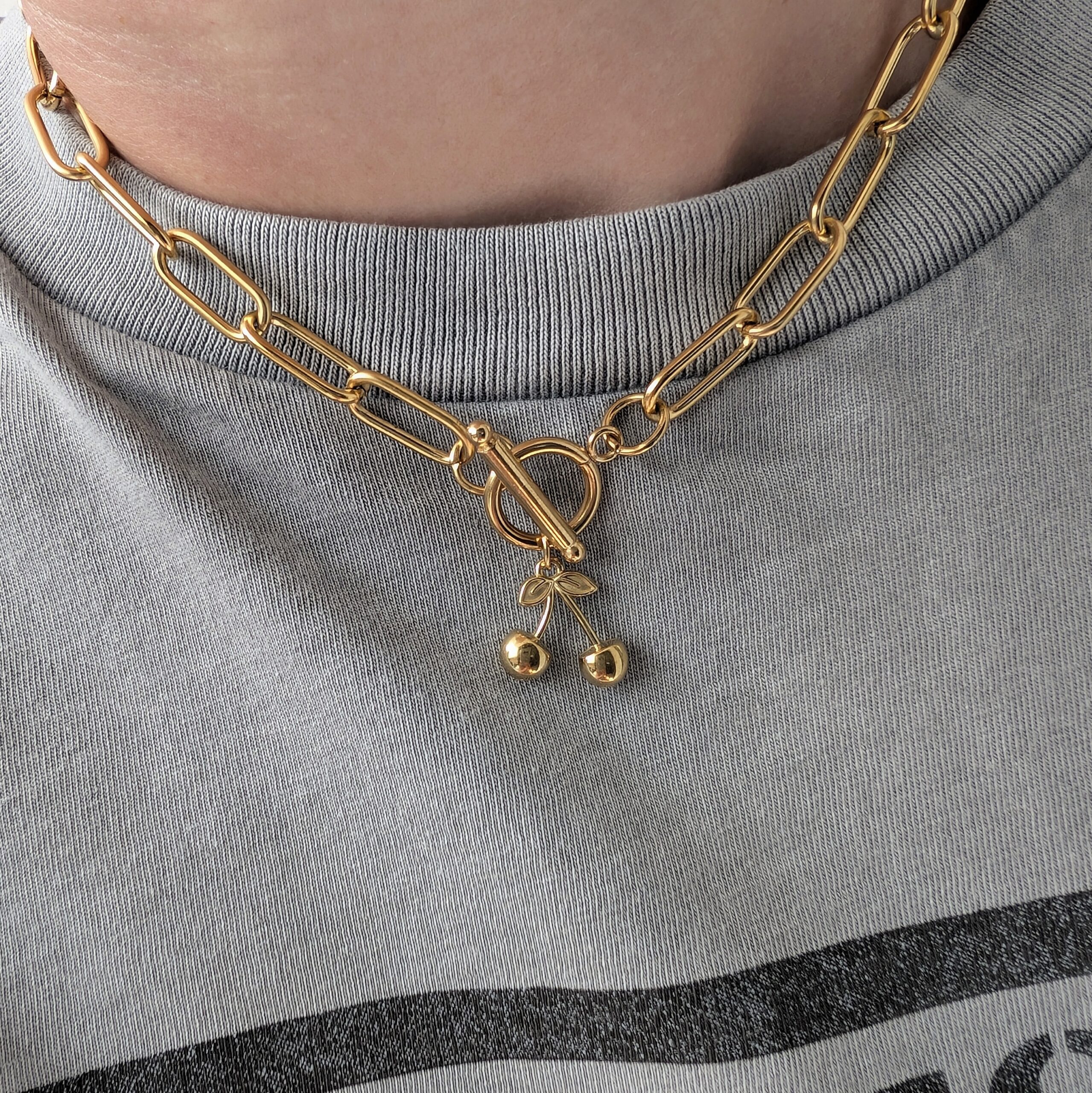 Łańcuch obok którego nikt nie przejdzie obojętnie. Duże, charakterystyczne ogniwa oraz motyw wiśni, niezwykle modne w ostatnim czasie.