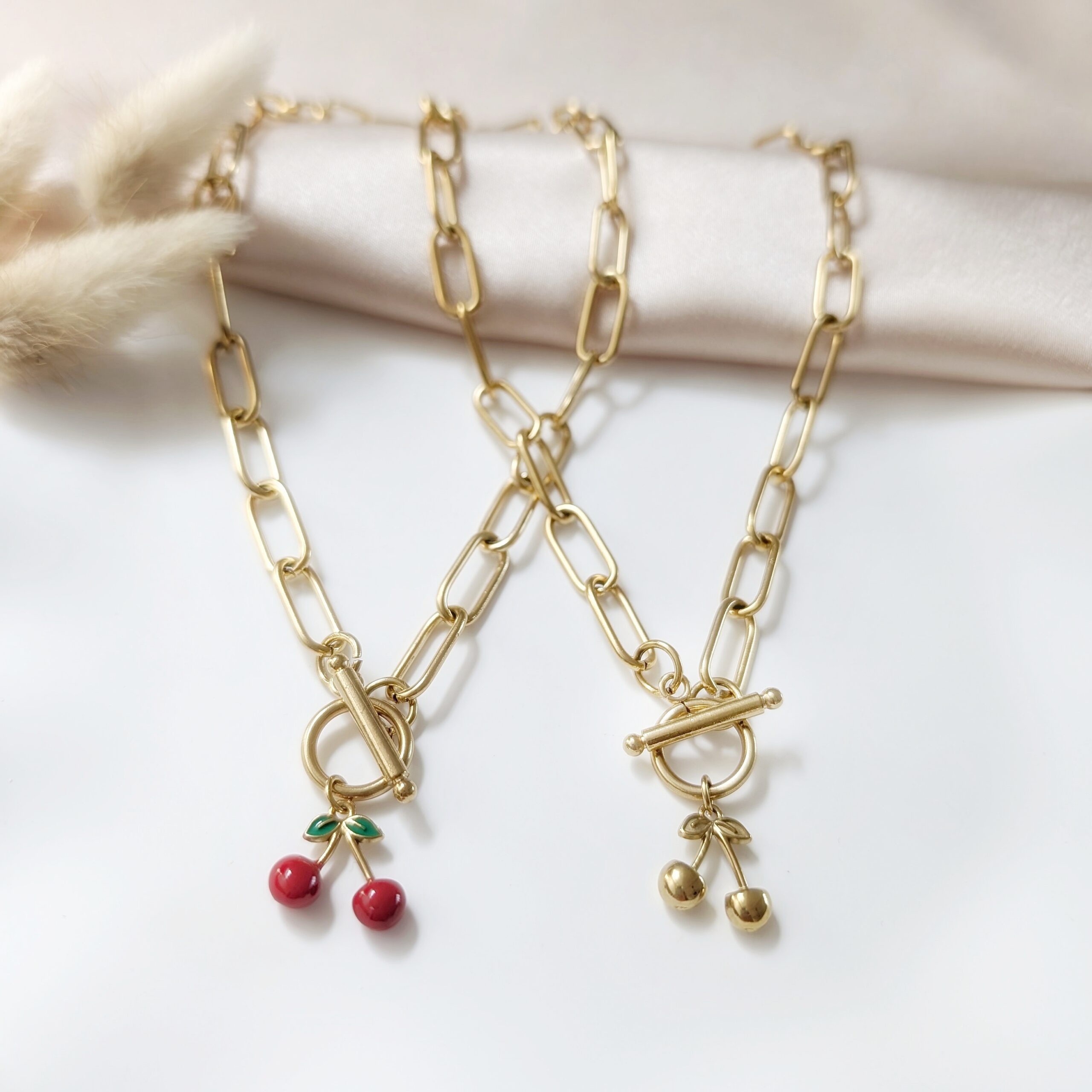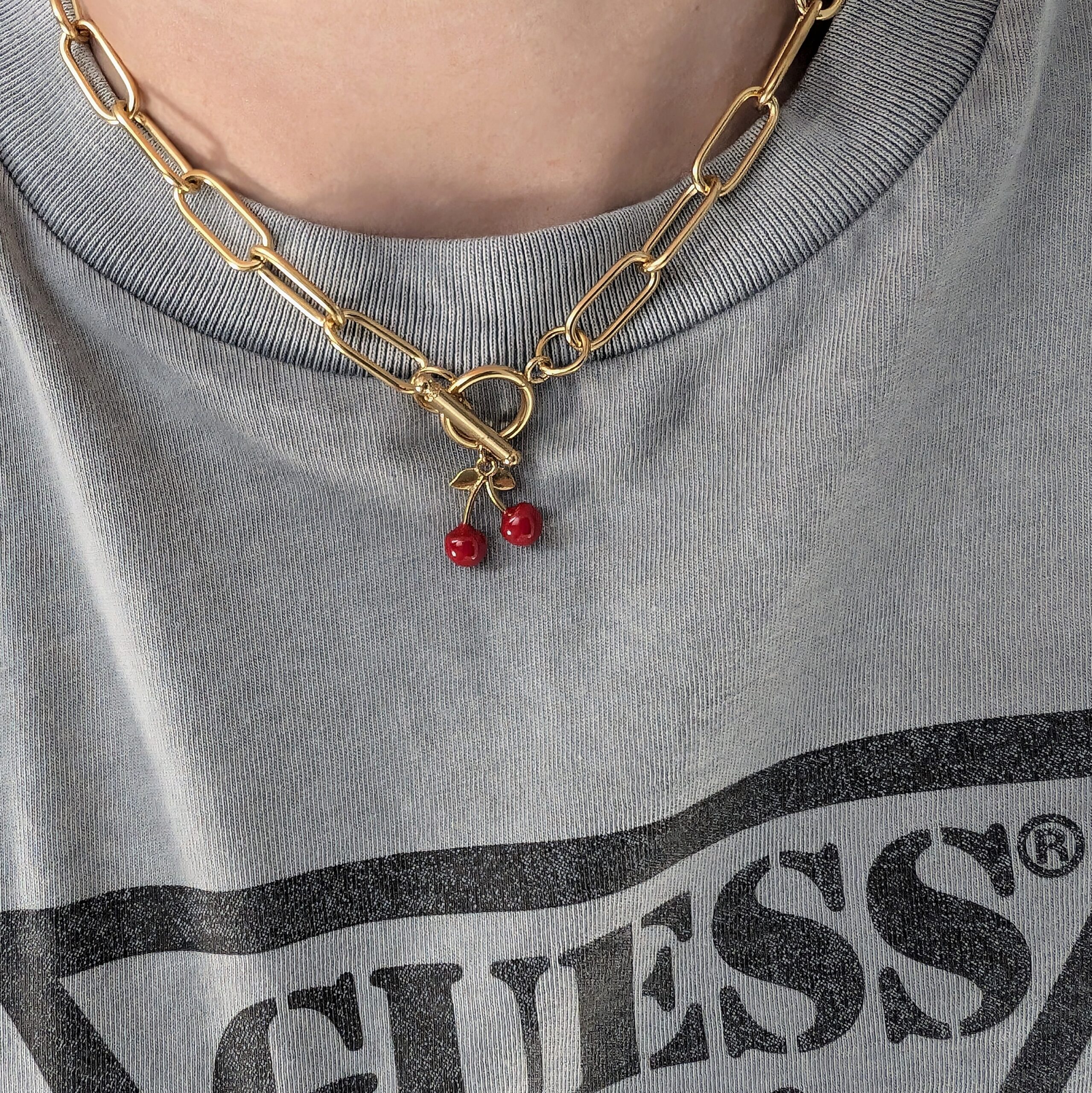 Łańcuch obok którego nikt nie przejdzie obojętnie. Duże, charakterystyczne ogniwa oraz motyw wiśni, niezwykle modne w ostatnim czasie.