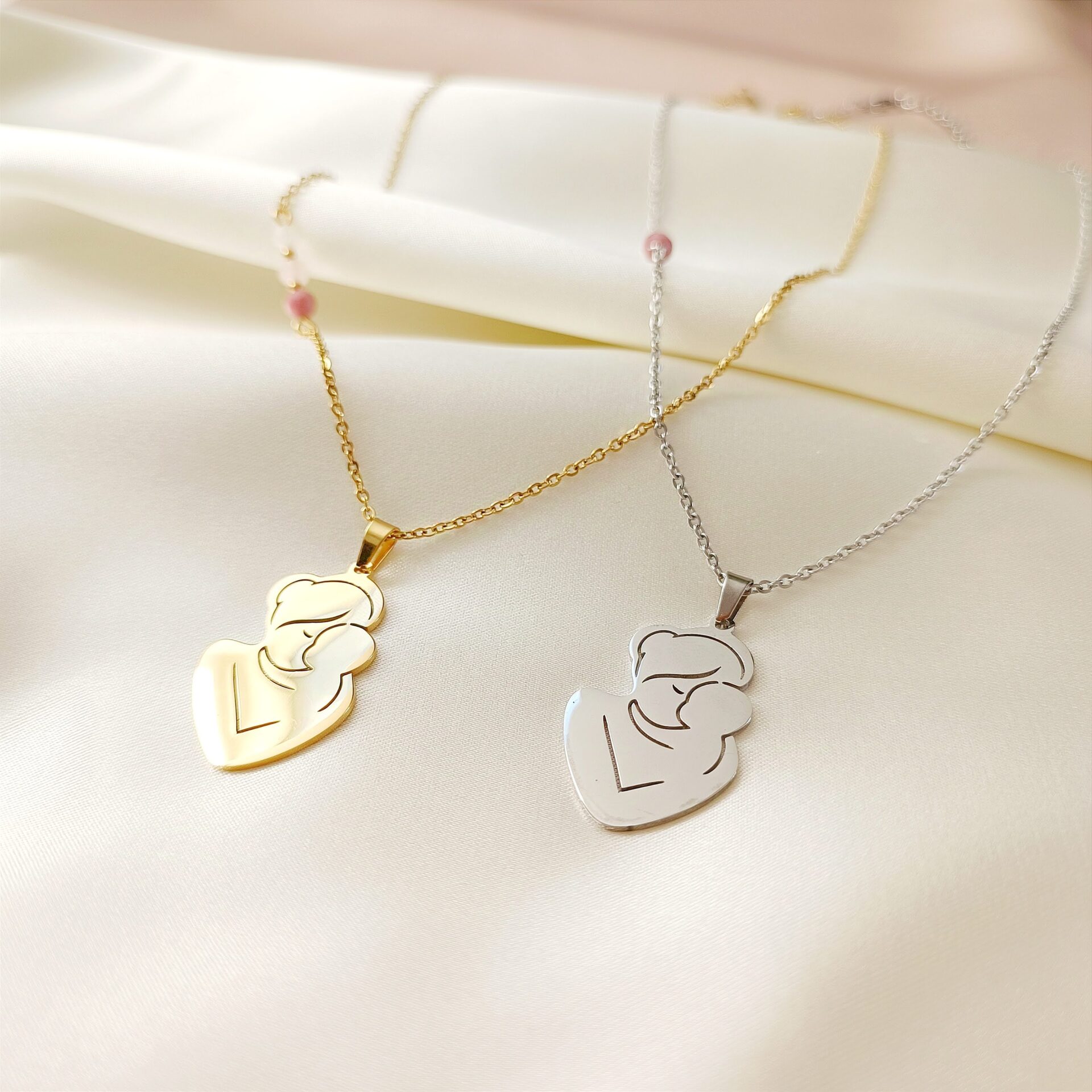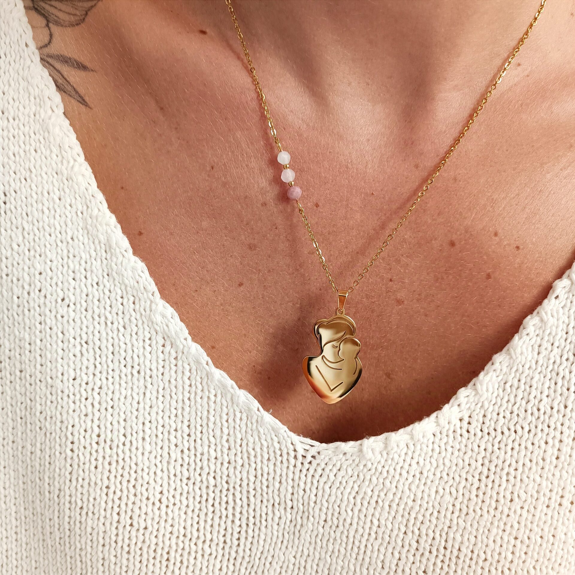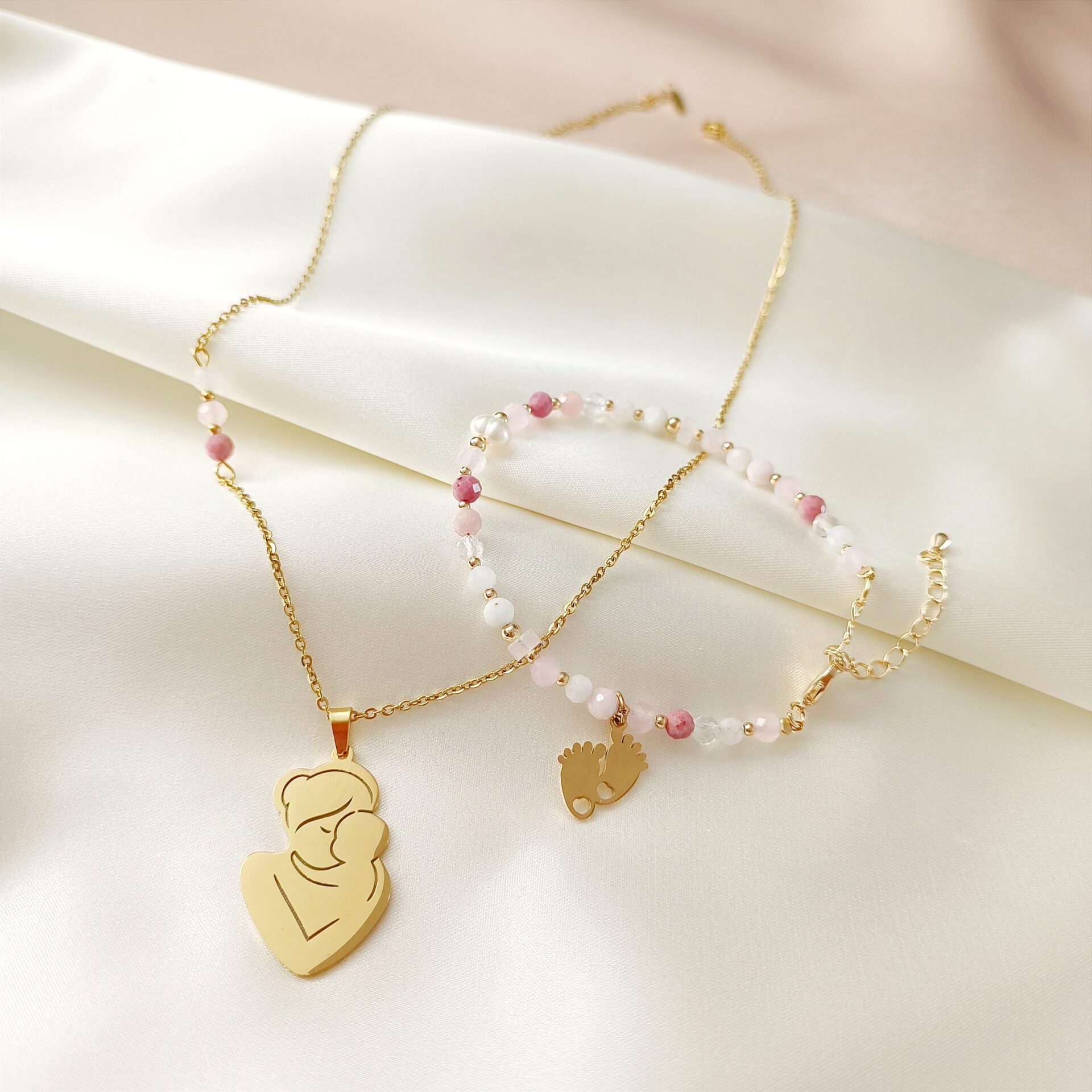 Zawieszka przedstawiająca maluszka w uścisku mamy oraz wstawka w łańcuszku z różowych kamieni: kwarc i rodonit.