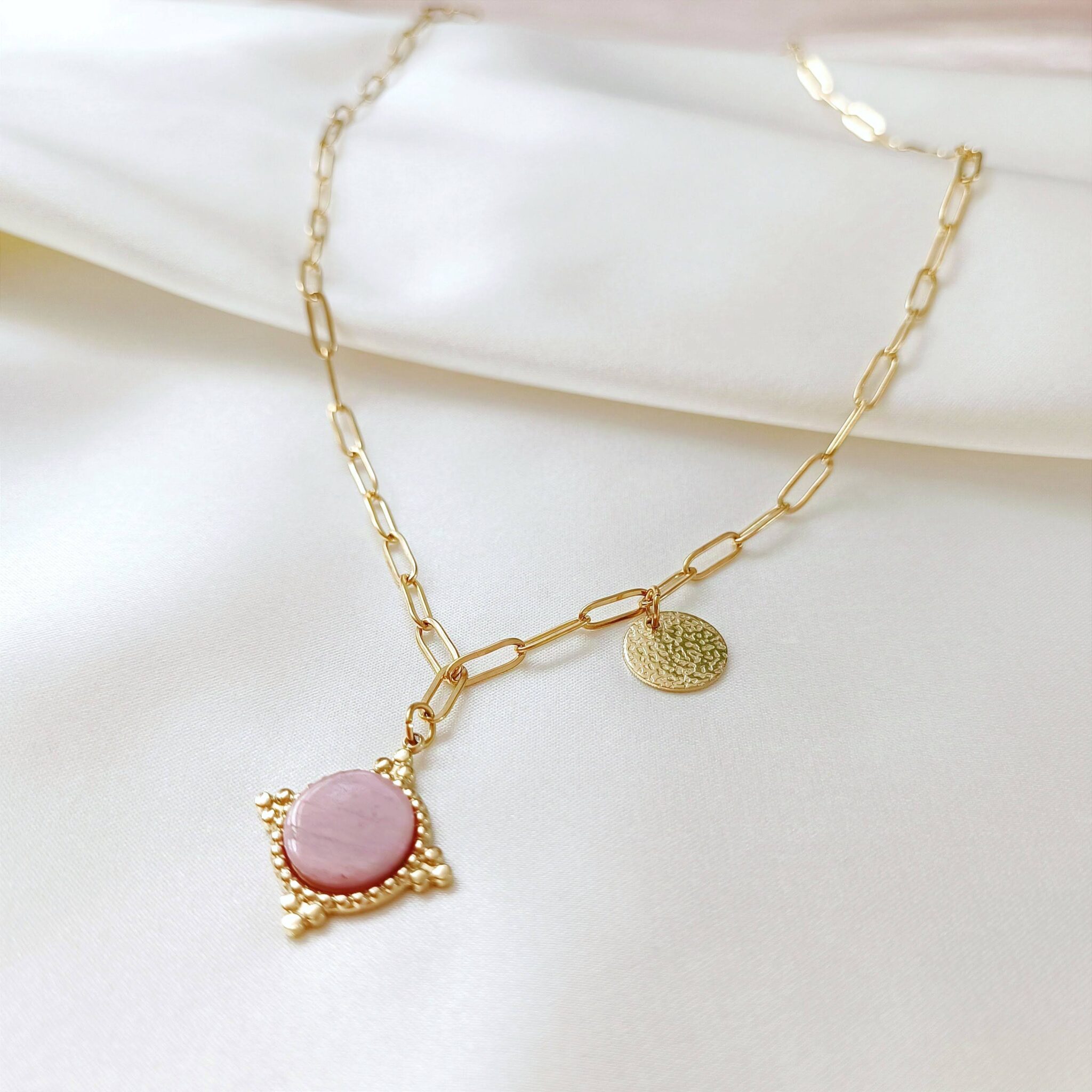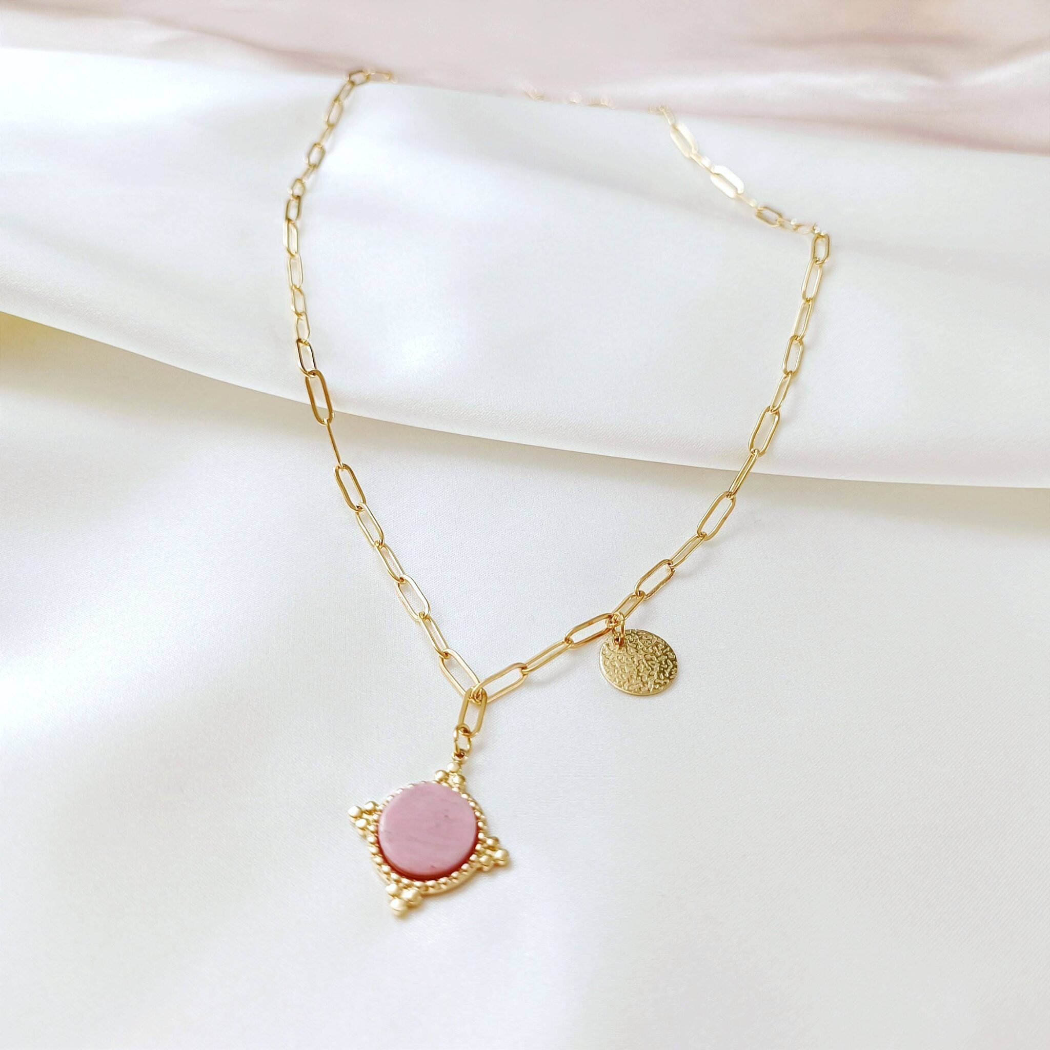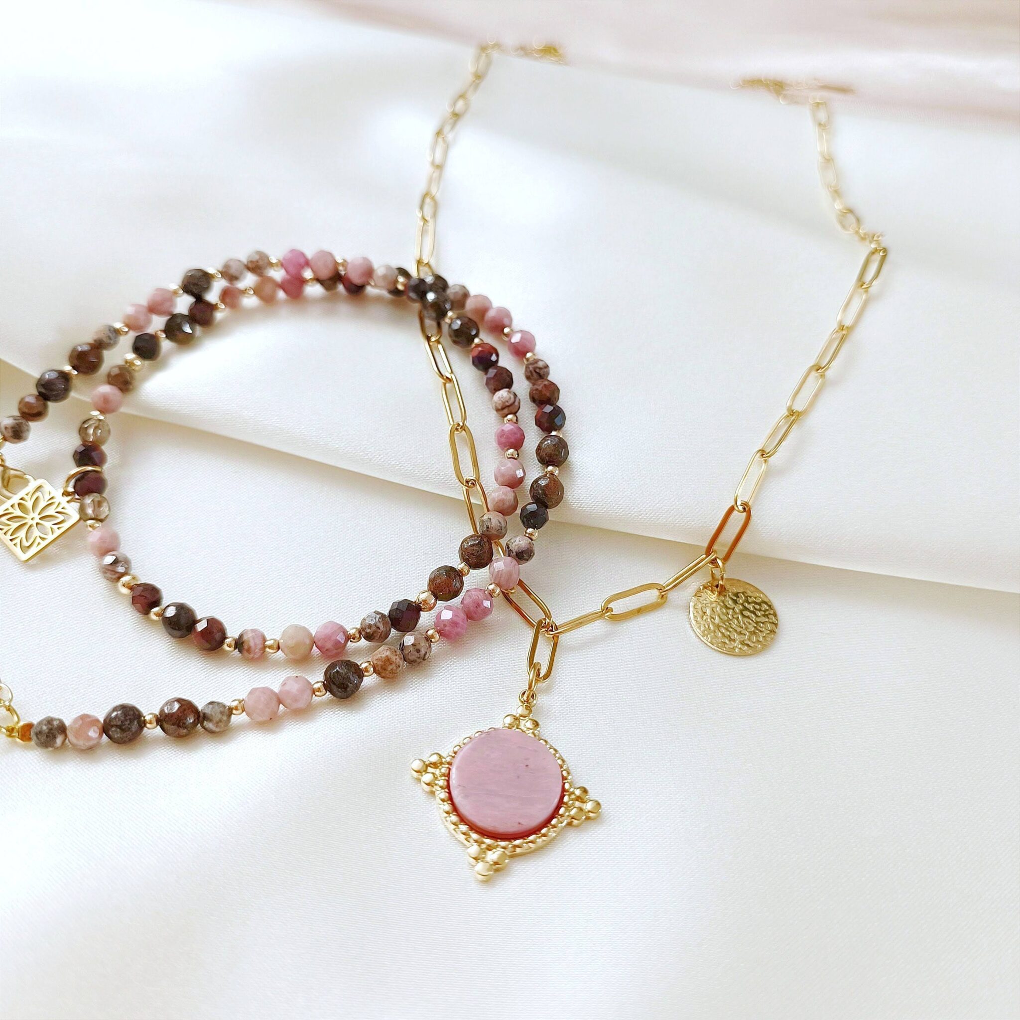 Zawieszka główna – kamień rodonit w ozdobnym okuciu oraz zawieszka boczna – okrągła, chropowata blaszka.
