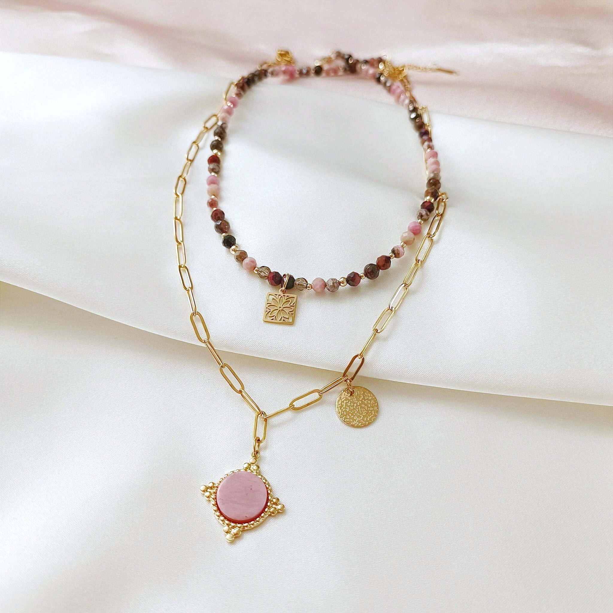 Zawieszka główna – kamień rodonit w ozdobnym okuciu oraz zawieszka boczna – okrągła, chropowata blaszka.