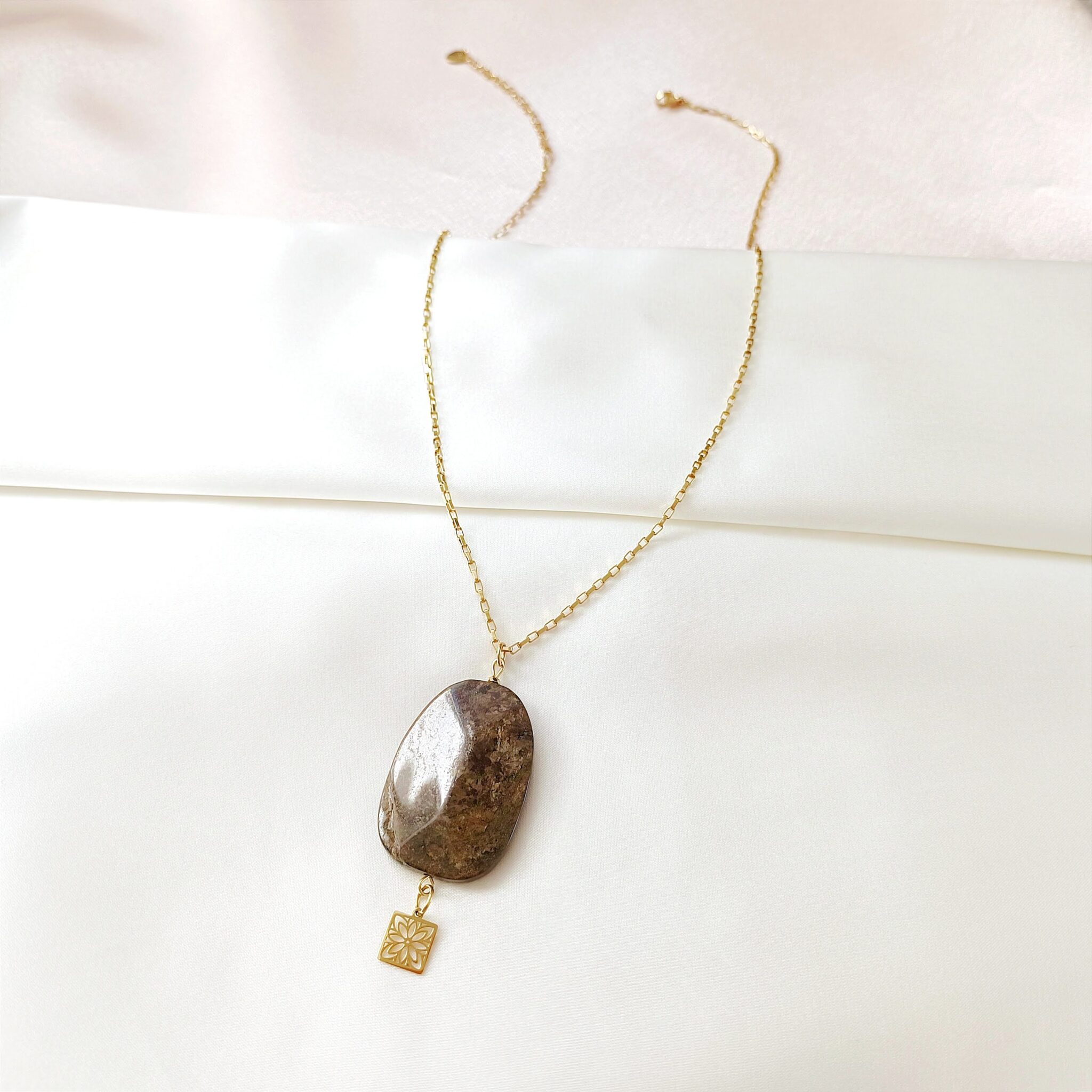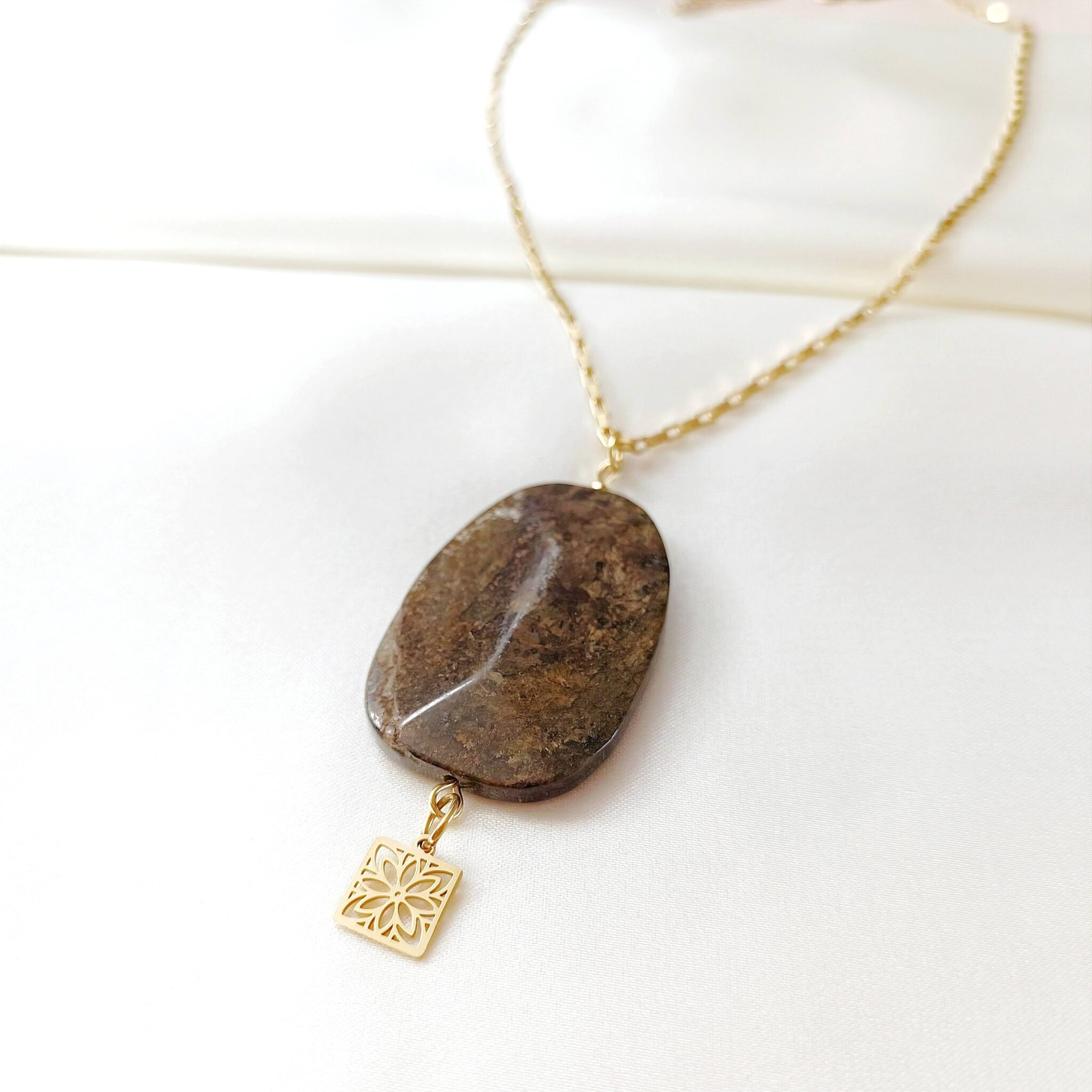 Oryginalny wisior z dużą, kamienną zawieszką. Kamień bronzyt.