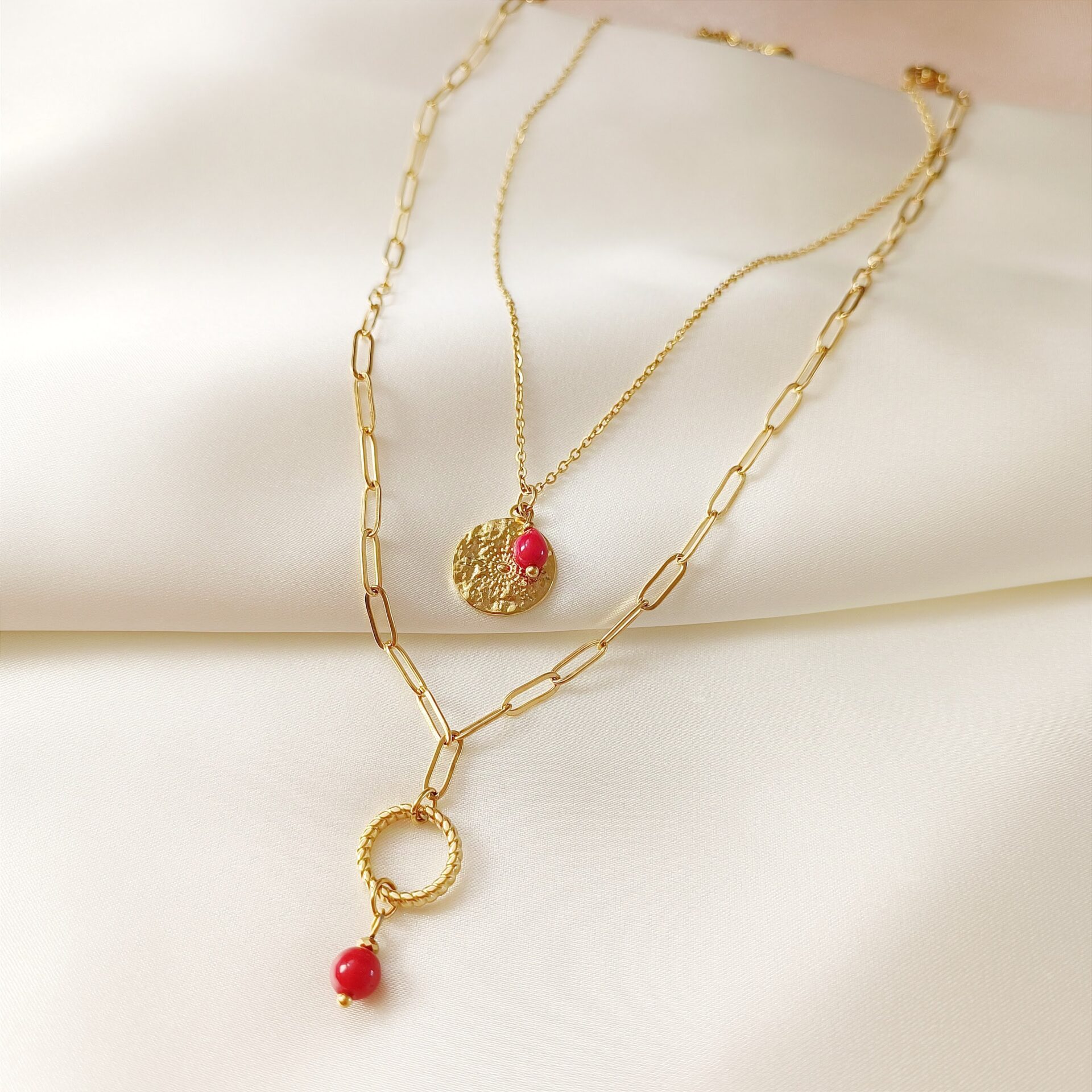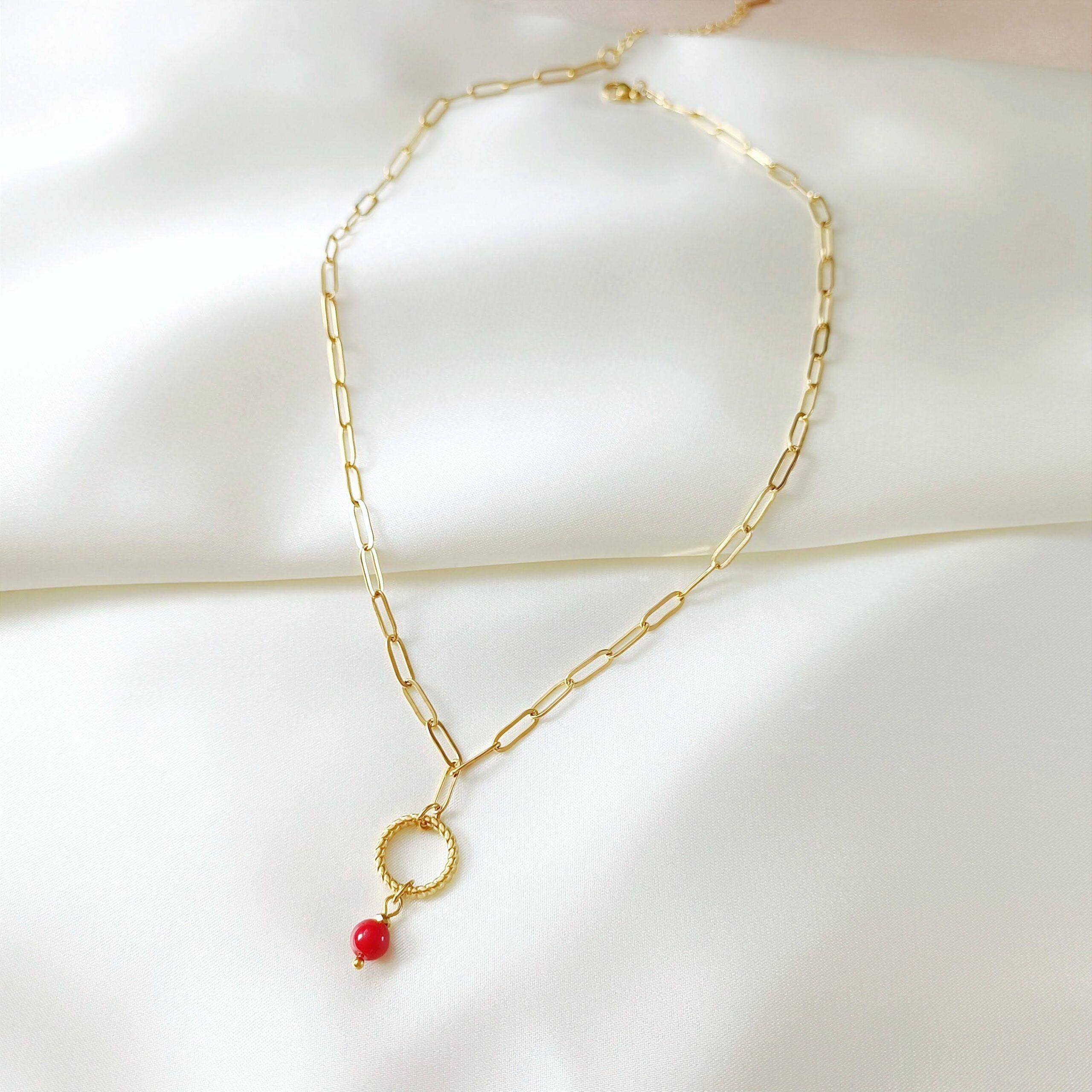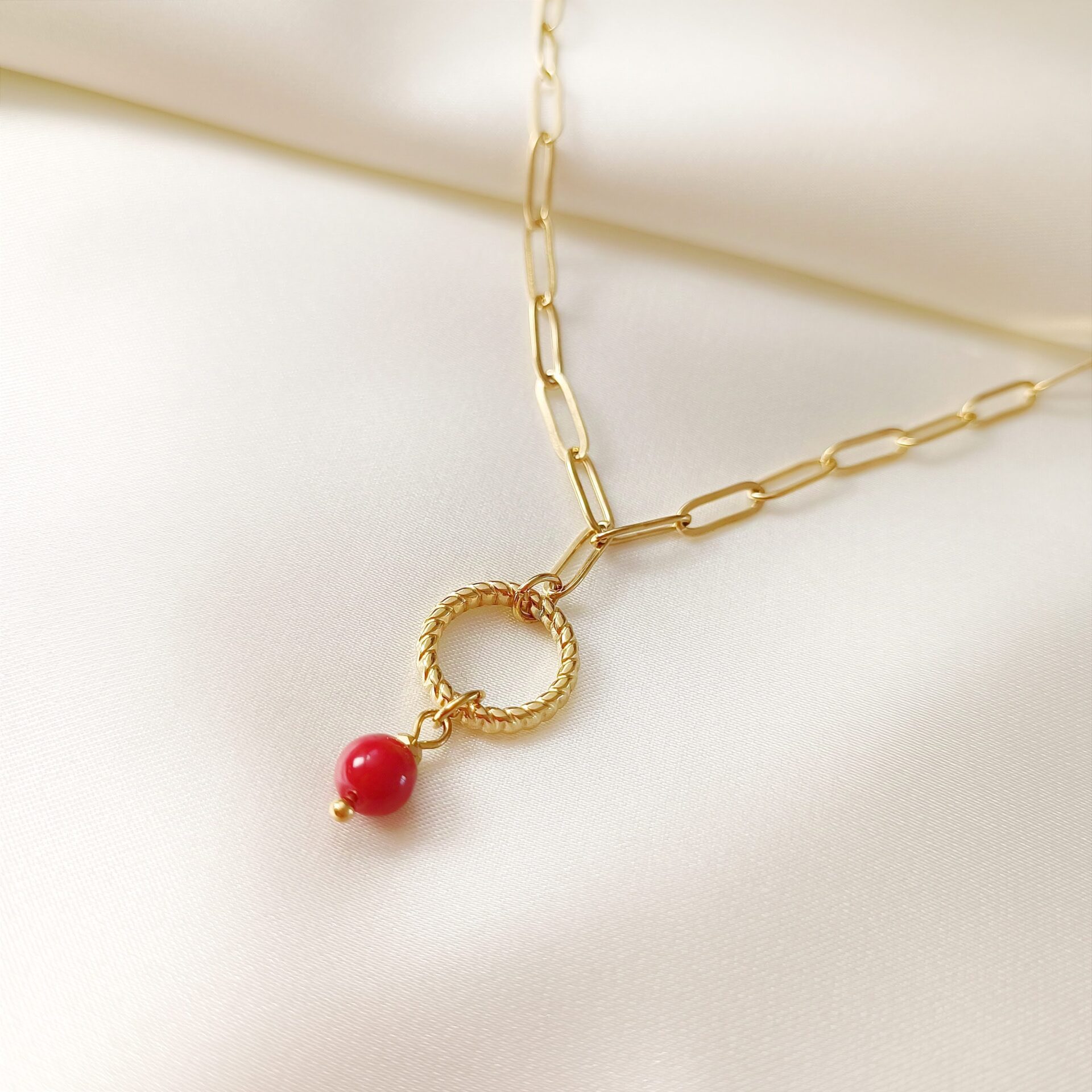 Okrągła zawieszka – ozdobne kółko i kamień czerwony koral w kształcie kulki.