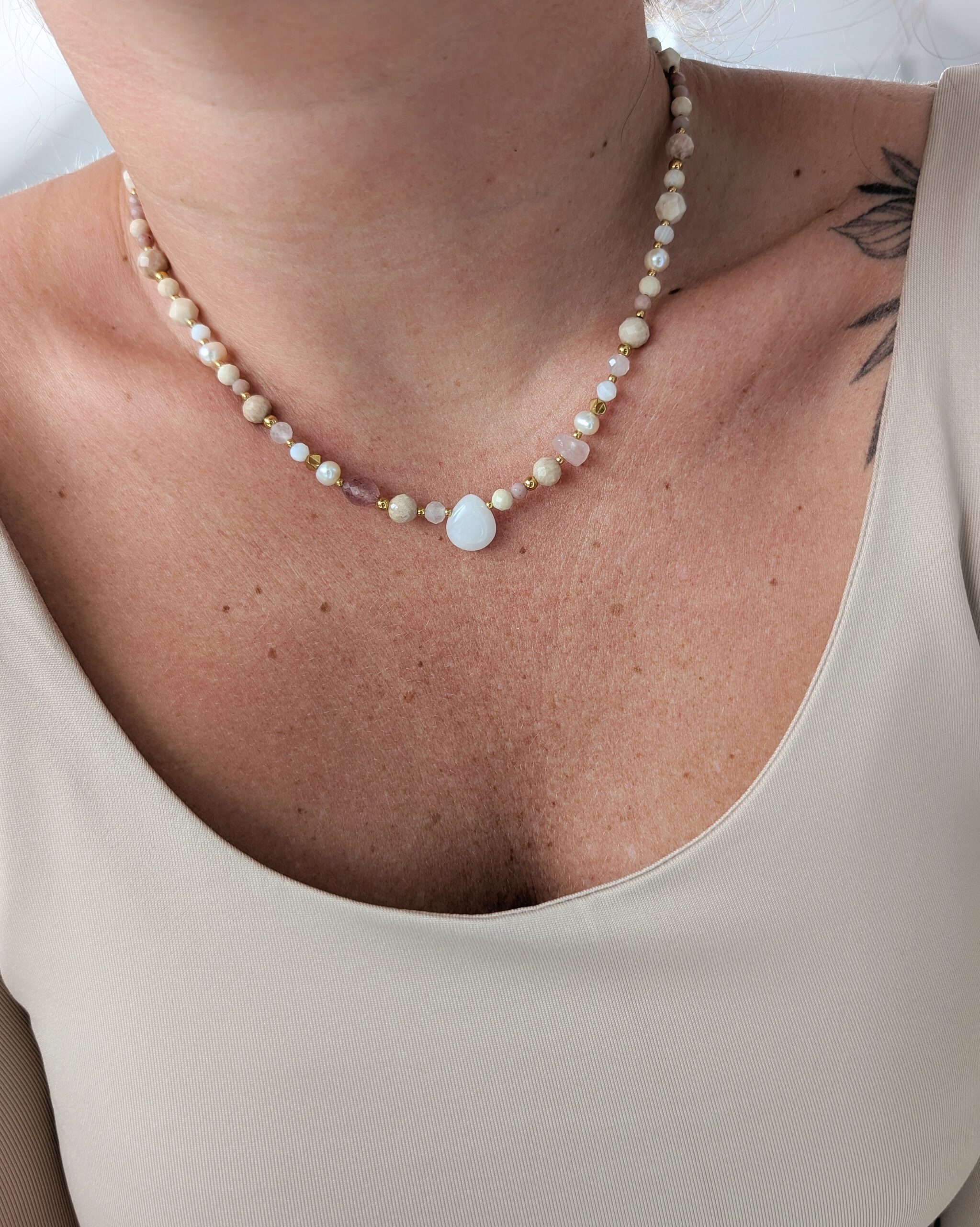 Środek naszyjnika zdobi kropla białego jadeitu. Jest on symbolem spokoju, harmonii i łagodności wobec samej siebie. Pomaga odnaleźć równowagę i poczucie bezpieczeństwa w codzienności.