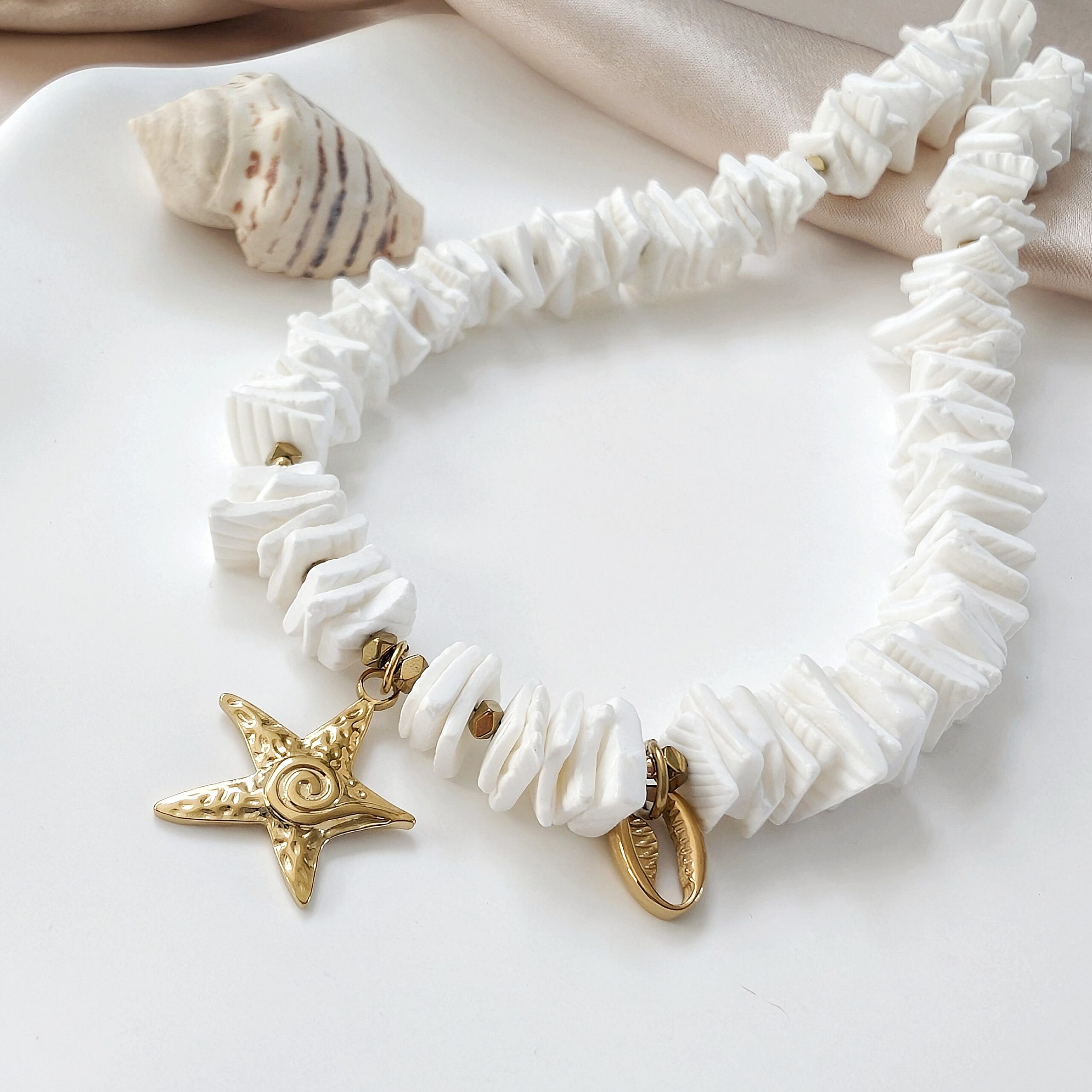 Naturalna, biała, nieregularna muszla cięta, złoty hematyt i wakacyjne zawieszki.