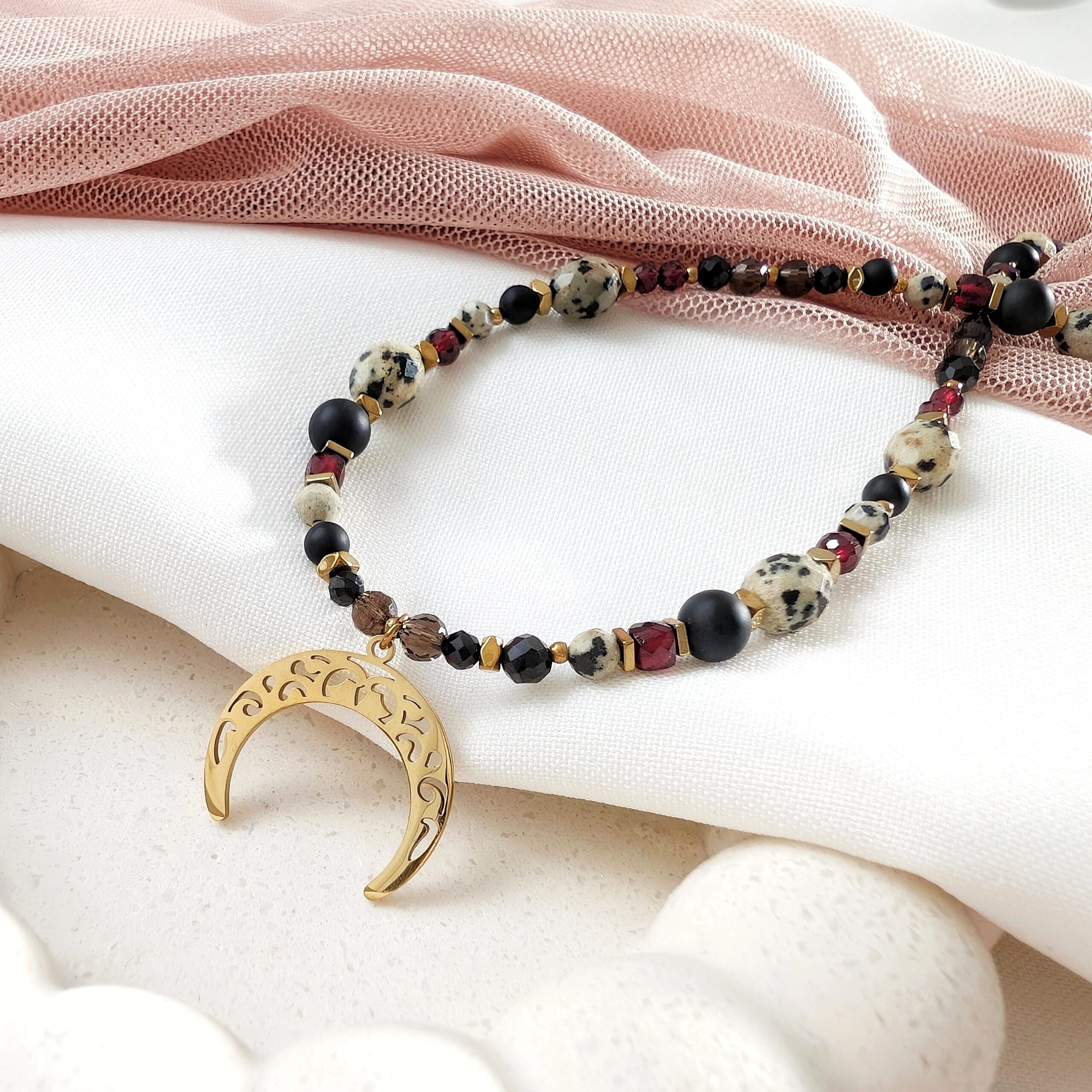 Onyks – kamień ochrony, siły i witalności. Pomaga w radzeniu sobie ze stresem i trudnymi emocjami, wzmacniając wewnętrzną stabilność oraz pewność siebie. Często jest używany jako talizman ochronny, który odpycha negatywne energie i wzmacnia wytrzymałość psychiczną.