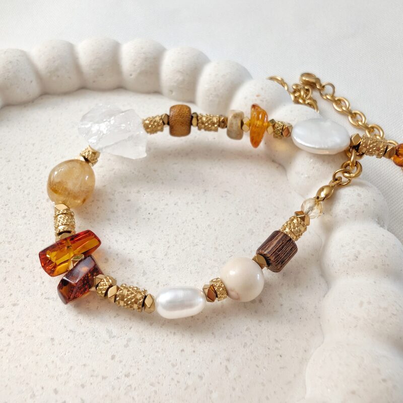 Bryła surowego kryształu górskiego, bursztyn bałtycki, cytryn, koral, jaspis, kamień rzeczny, hematyt, perły hodowane i koralik drewniany.