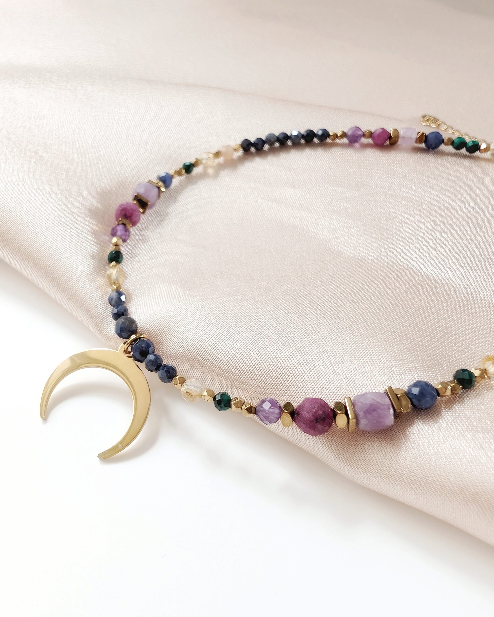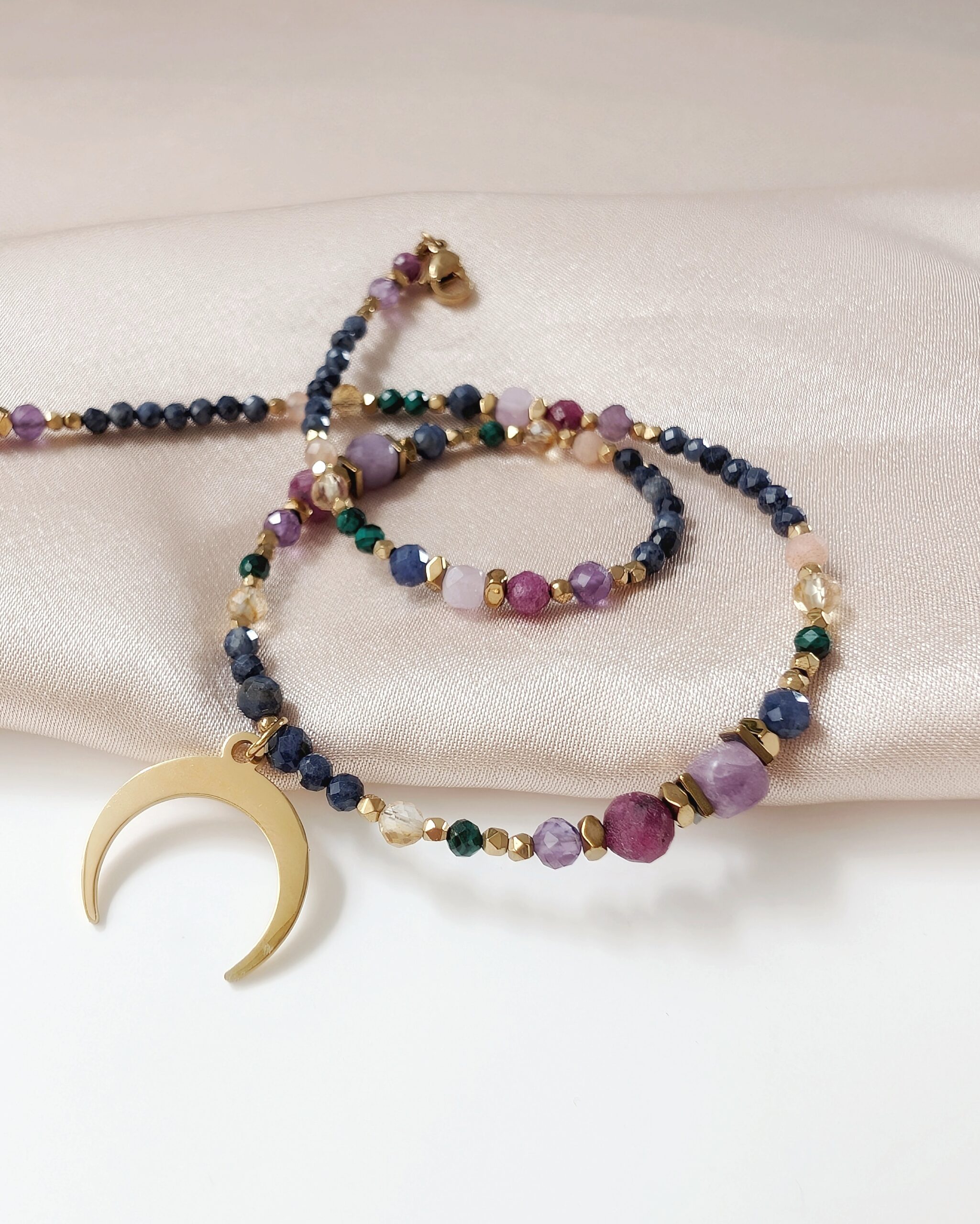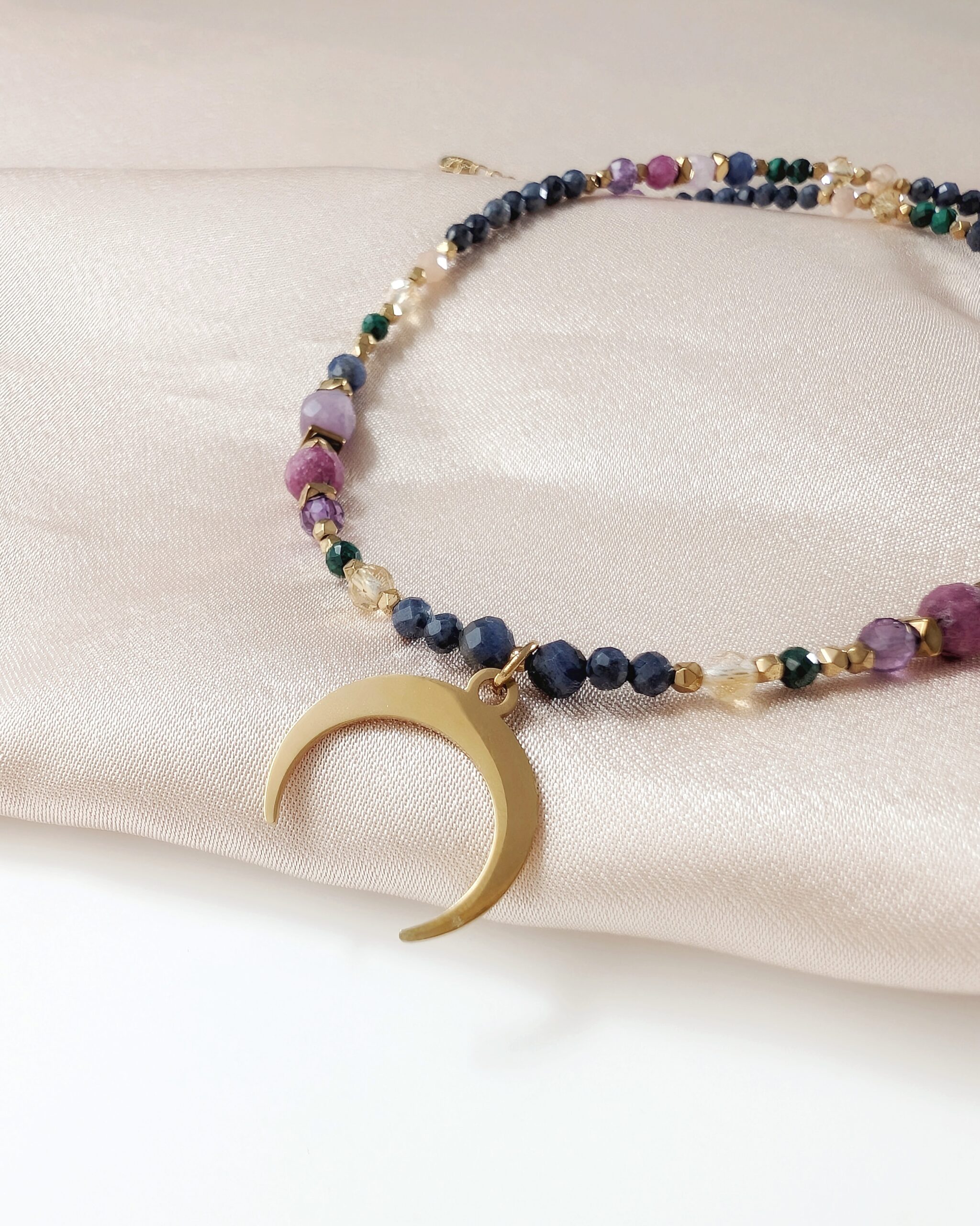Kompozycję kamieni naturalnych dopełnia zawieszka – księżyc lunula, który jest symbolem kobiecej energii i intuicji.