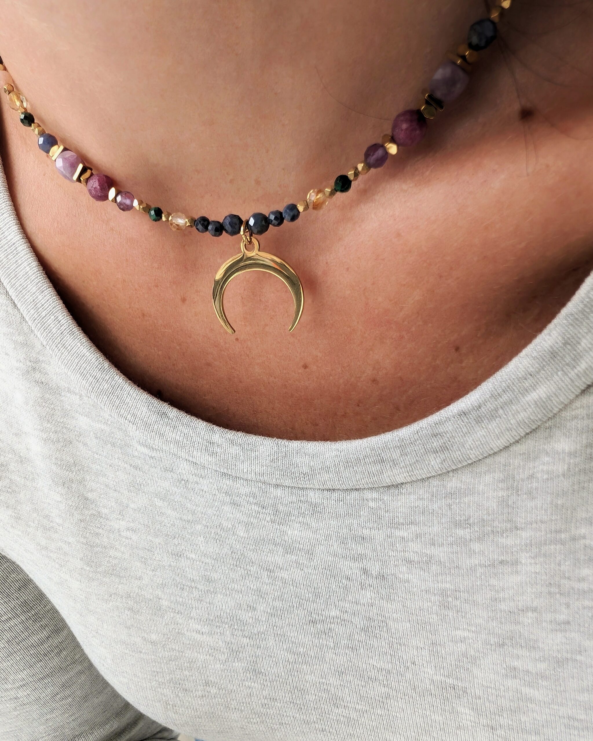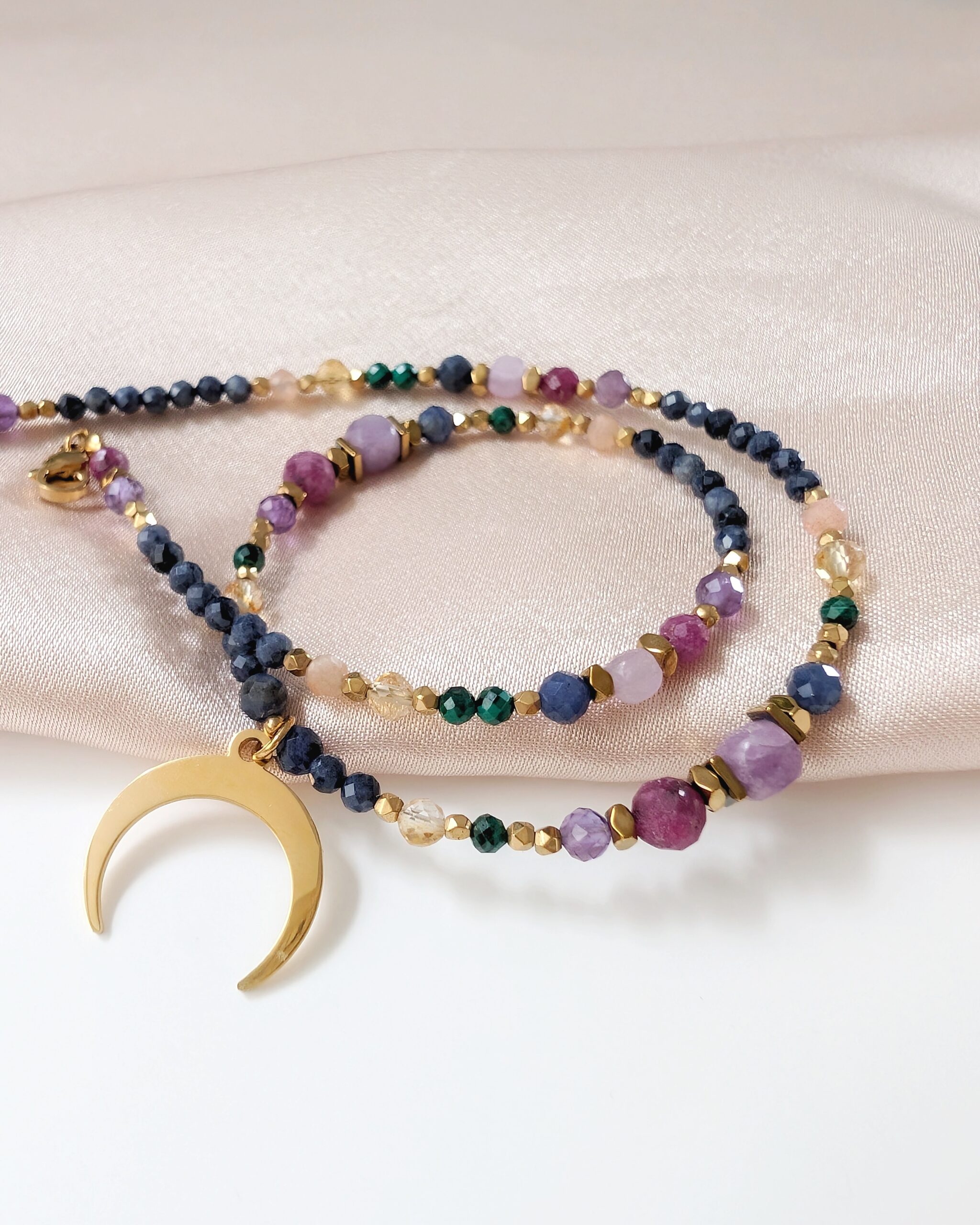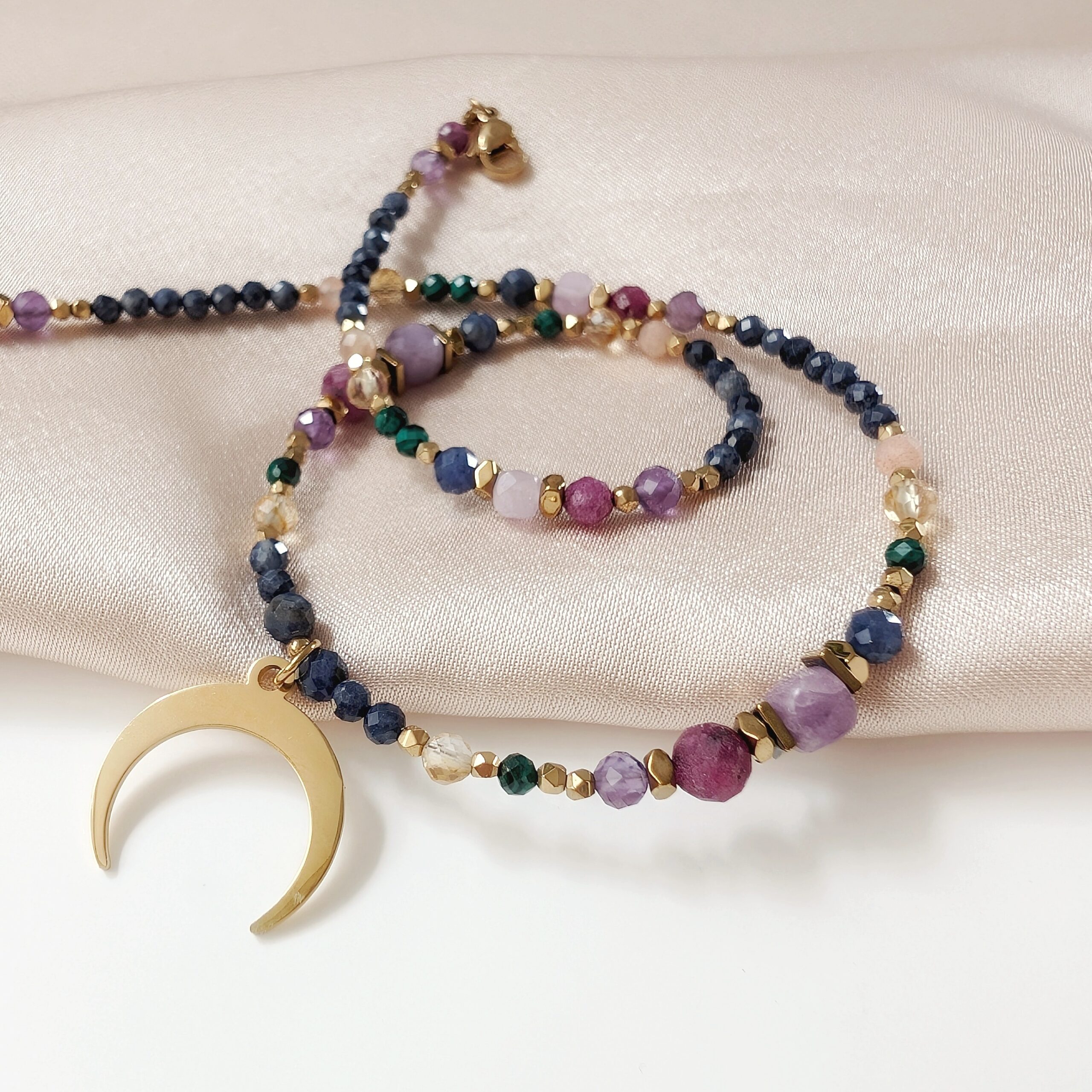 Kompozycję kamieni naturalnych dopełnia zawieszka – księżyc lunula, który jest symbolem kobiecej energii i intuicji.