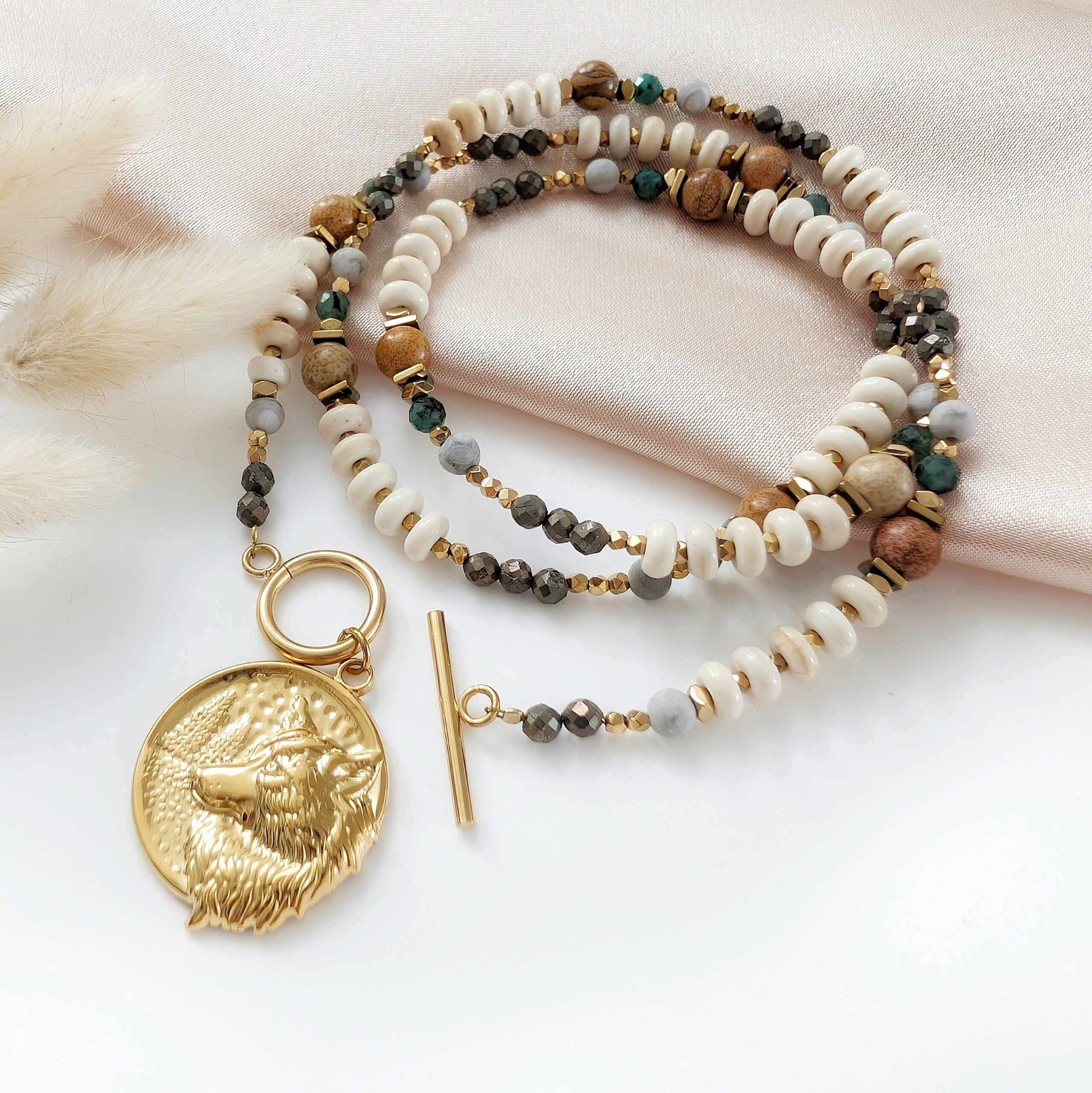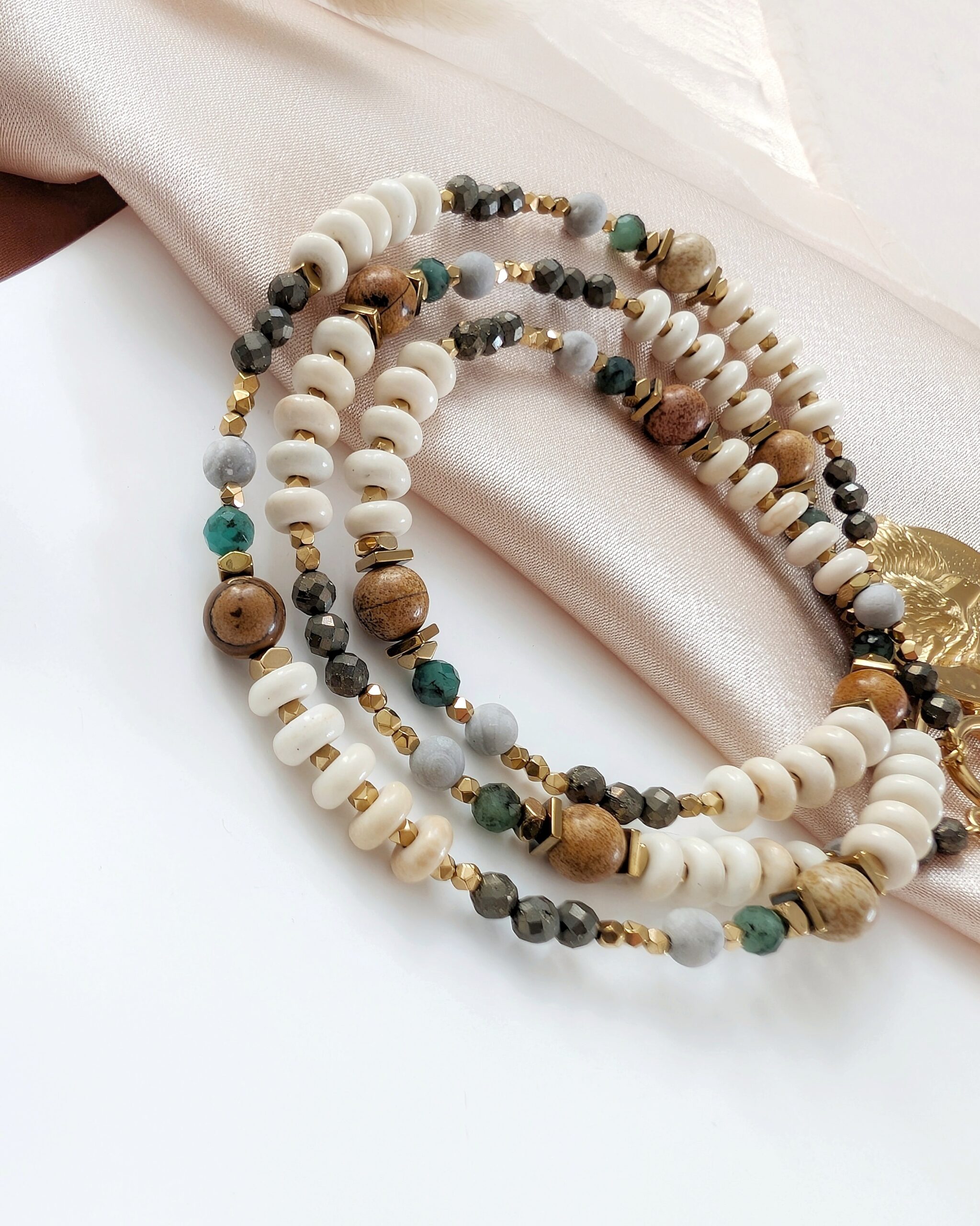 Naszyjnik GAJA wykonany został z kamieni naturalnych: kremowy howlit, piryt, jaspis krajobrazowy, szary agat, szmaragd i hematyt.