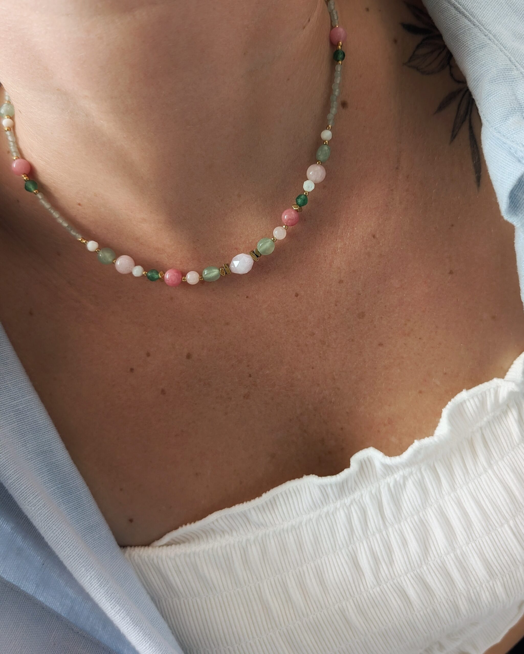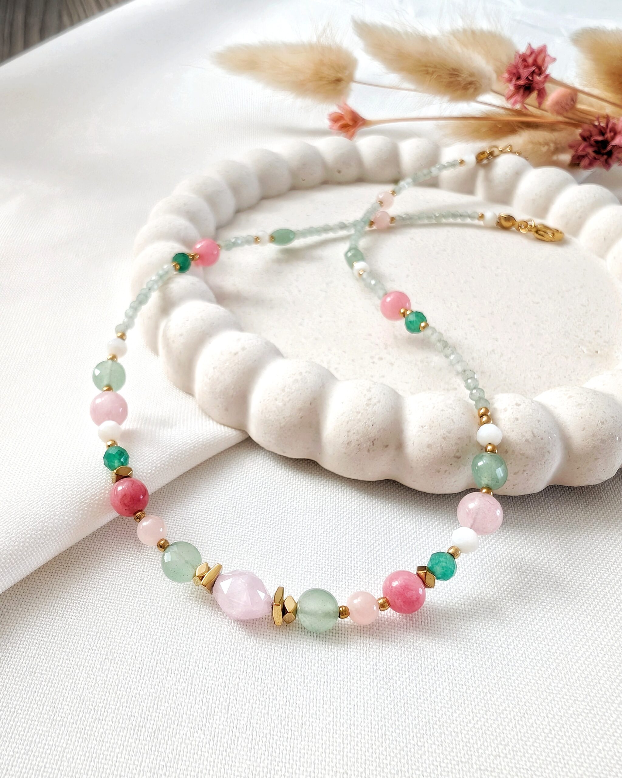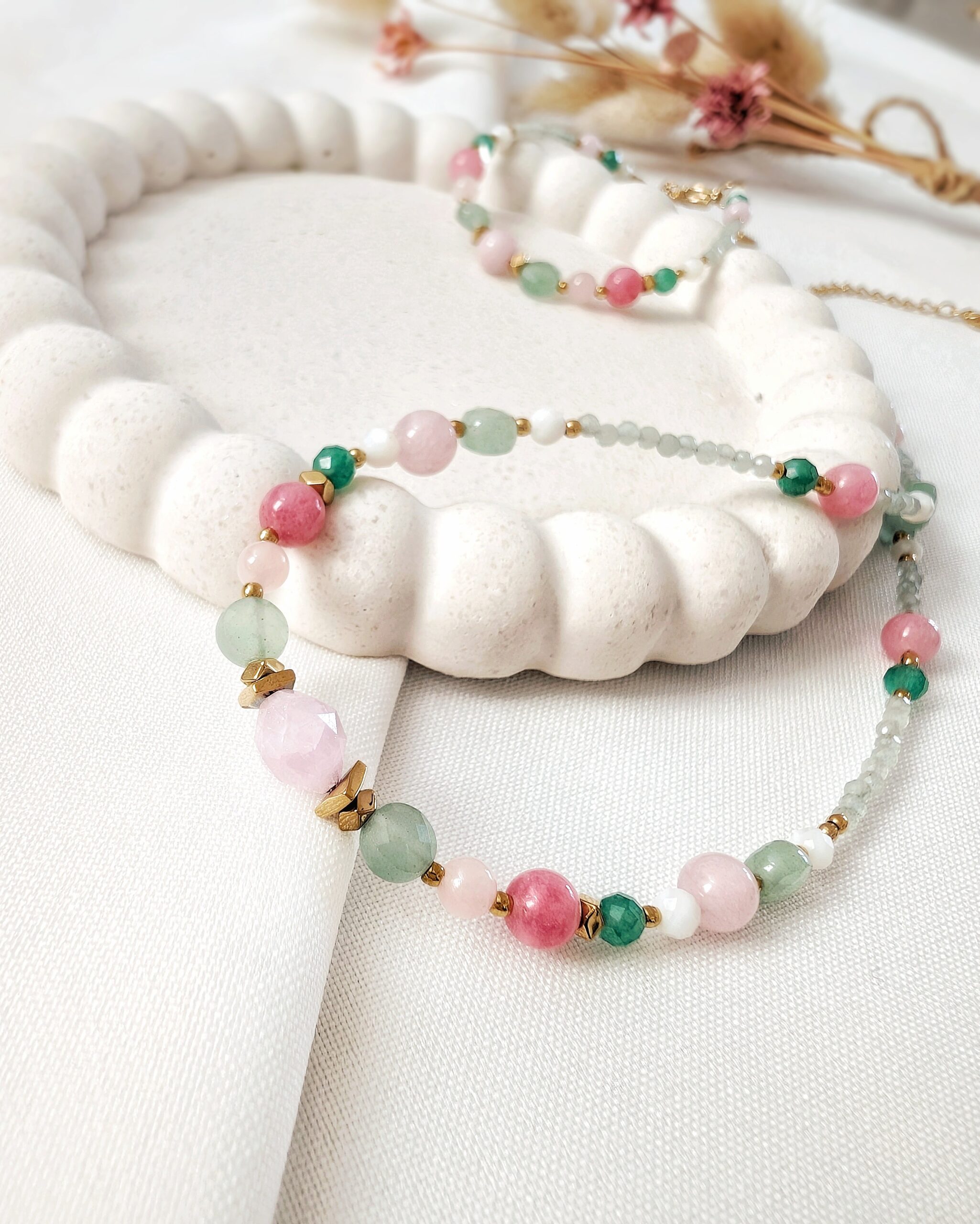 W tej kompozycji spotykają się zielony awenturyn, różowe jadeity, kunzyt oraz biała muszla naturalna. Razem tworzą paletę przypominającą kwietną łąkę skąpaną w słońcu.