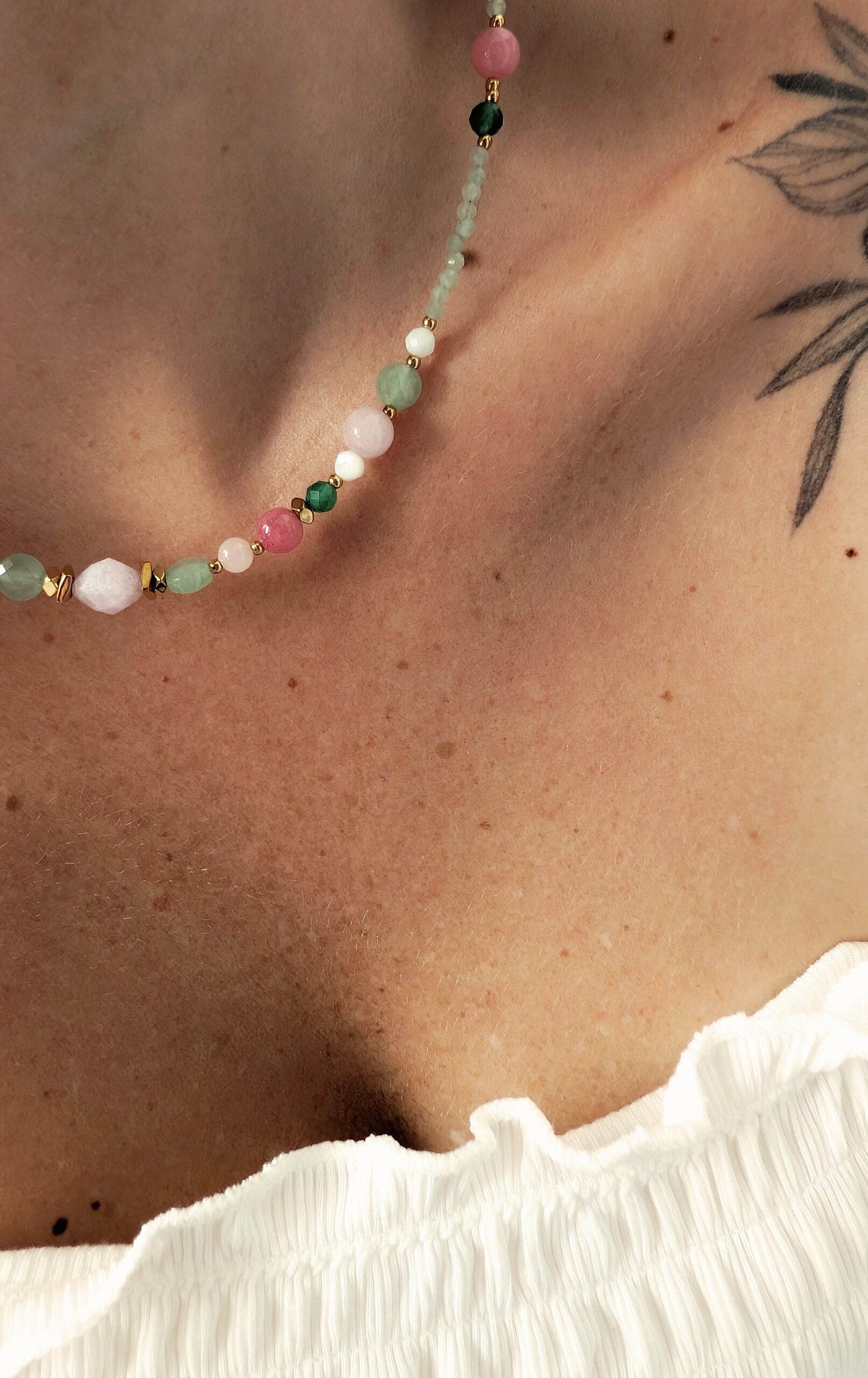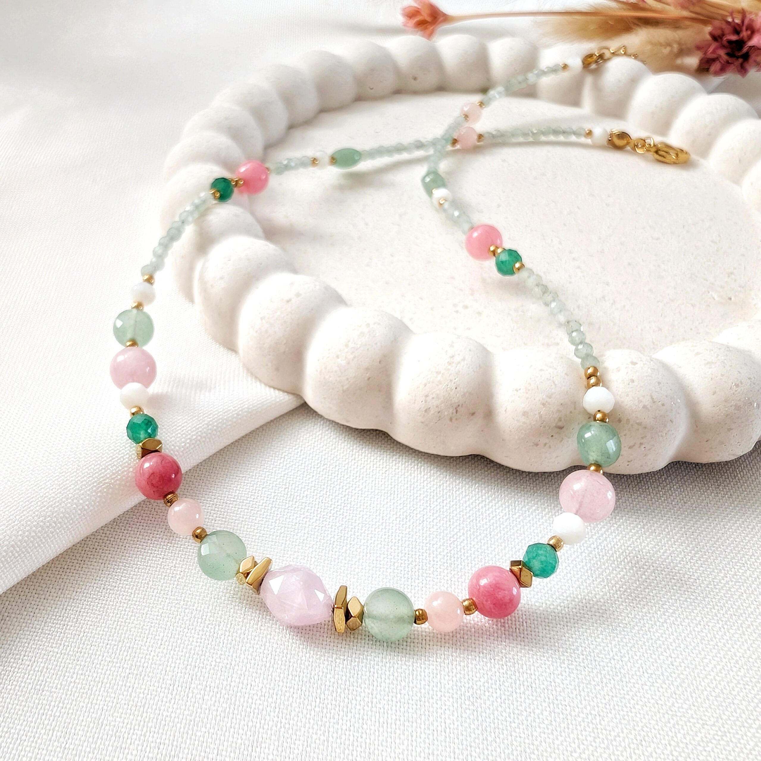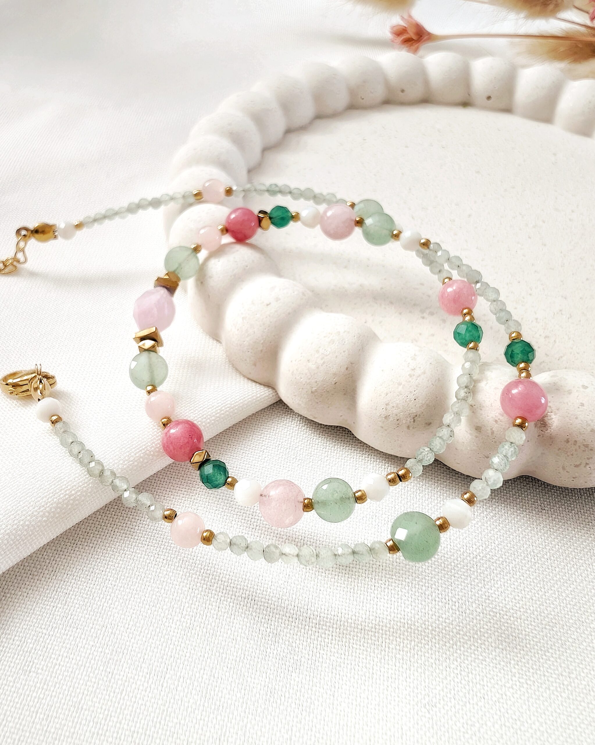 W tej kompozycji spotykają się zielony awenturyn, różowe jadeity, kunzyt oraz biała muszla naturalna. Razem tworzą paletę przypominającą kwietną łąkę skąpaną w słońcu.