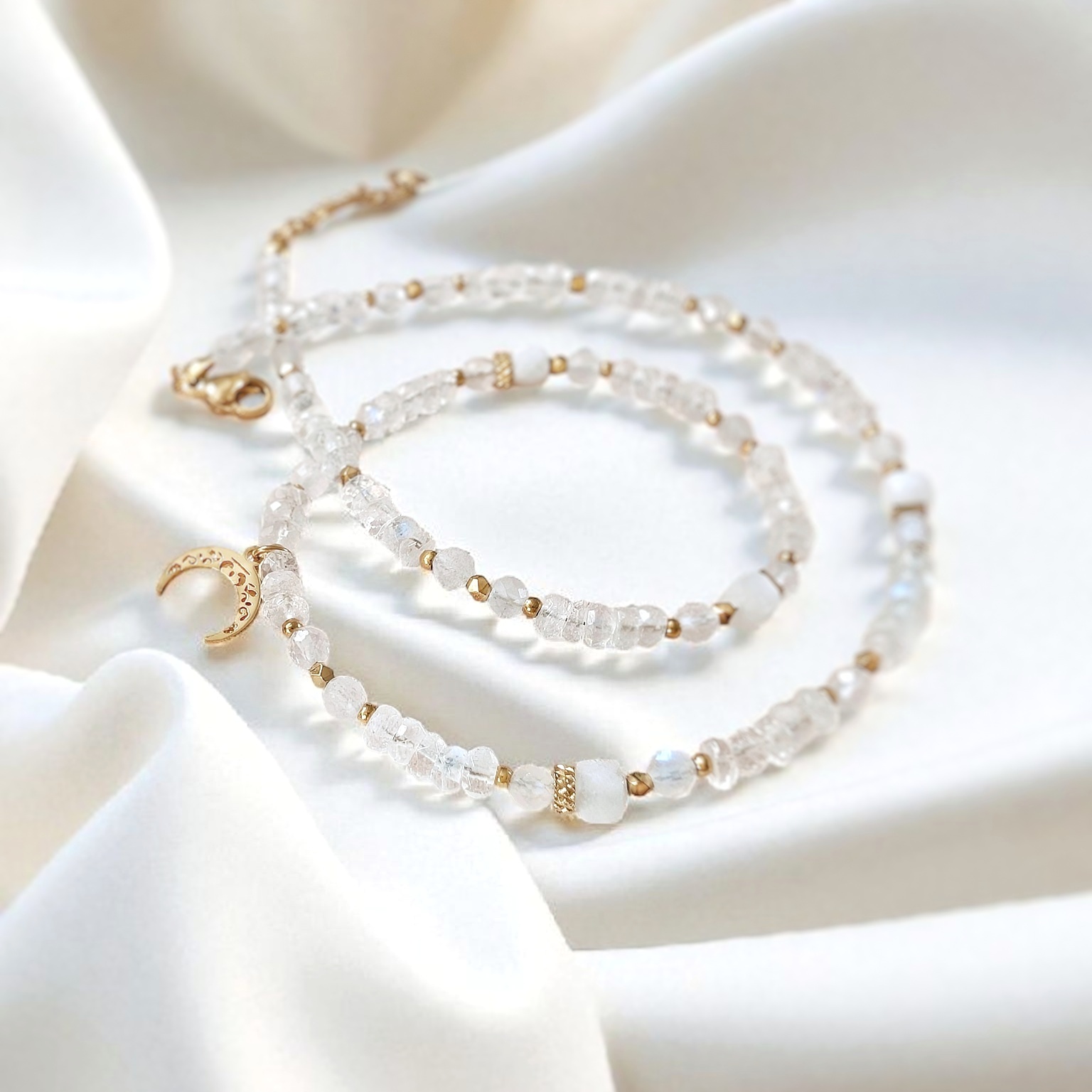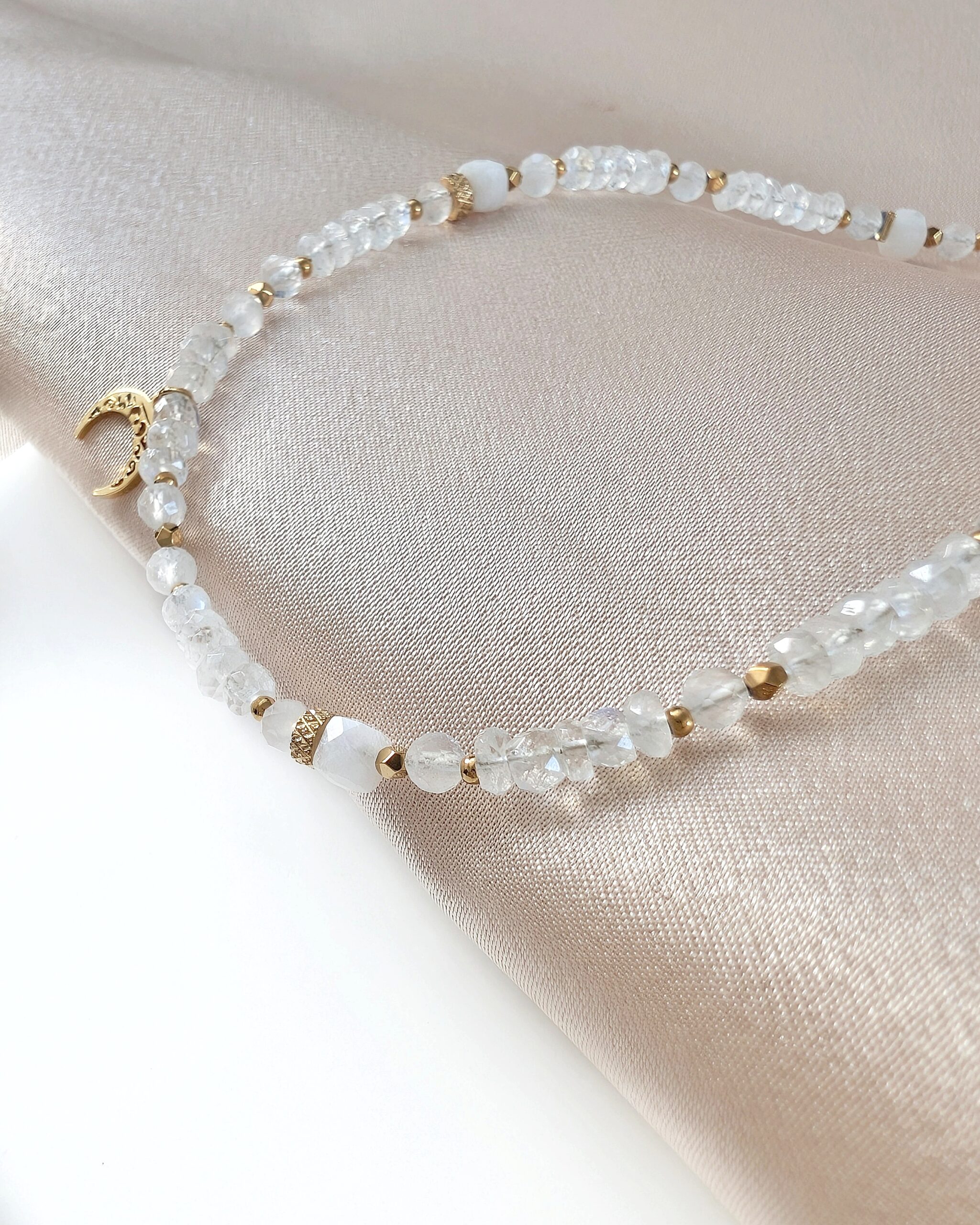 Naszyjnik / choker LUNEA wykonany z kamienia księżycowego różnych jakości i kształtów.