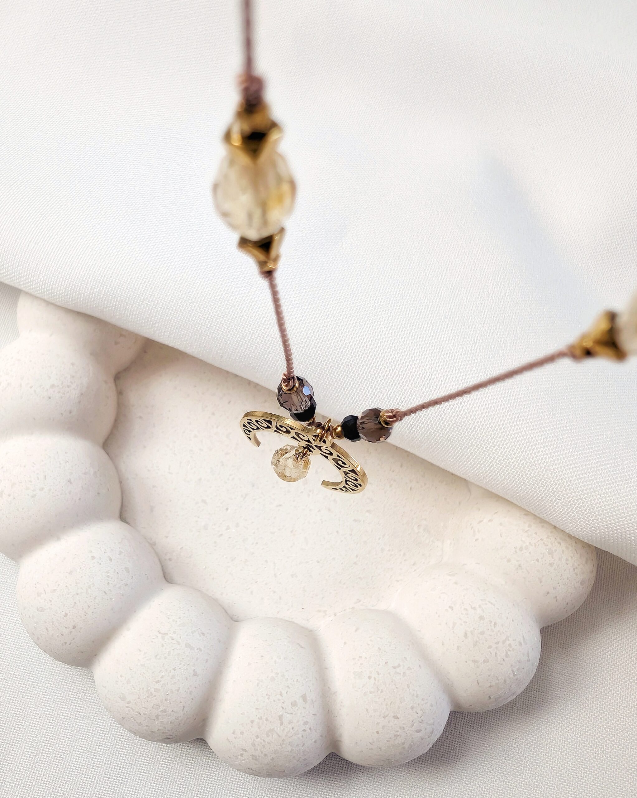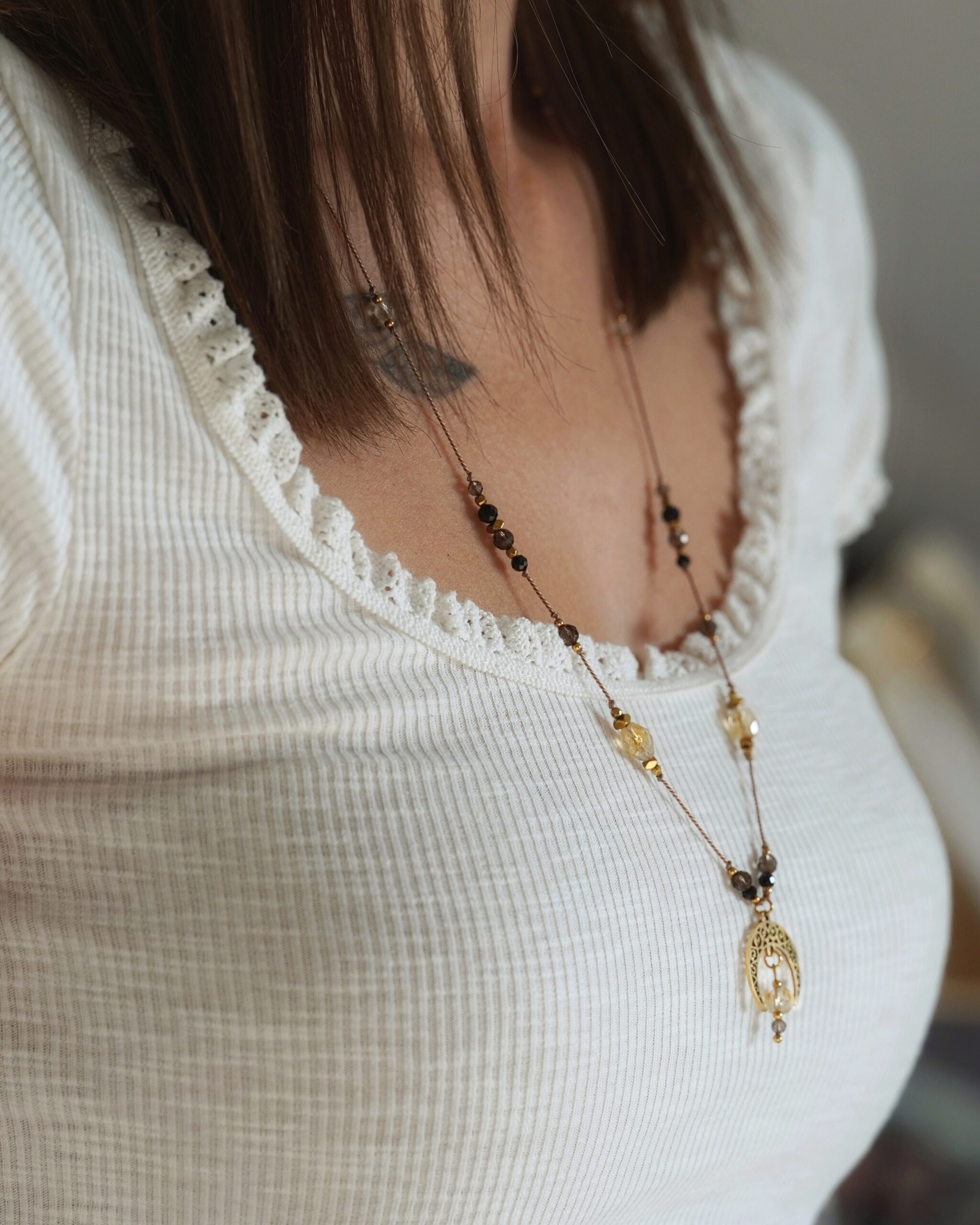 Uniwersalny kolorystycznie, niezobowiązujący porą roku naszyjnik wykonany na beżowej nici jedwabnej z kamieniami naturalnymi – z cytrynem, kwarcem dymnym, czarnym turmalinem i hematytem.