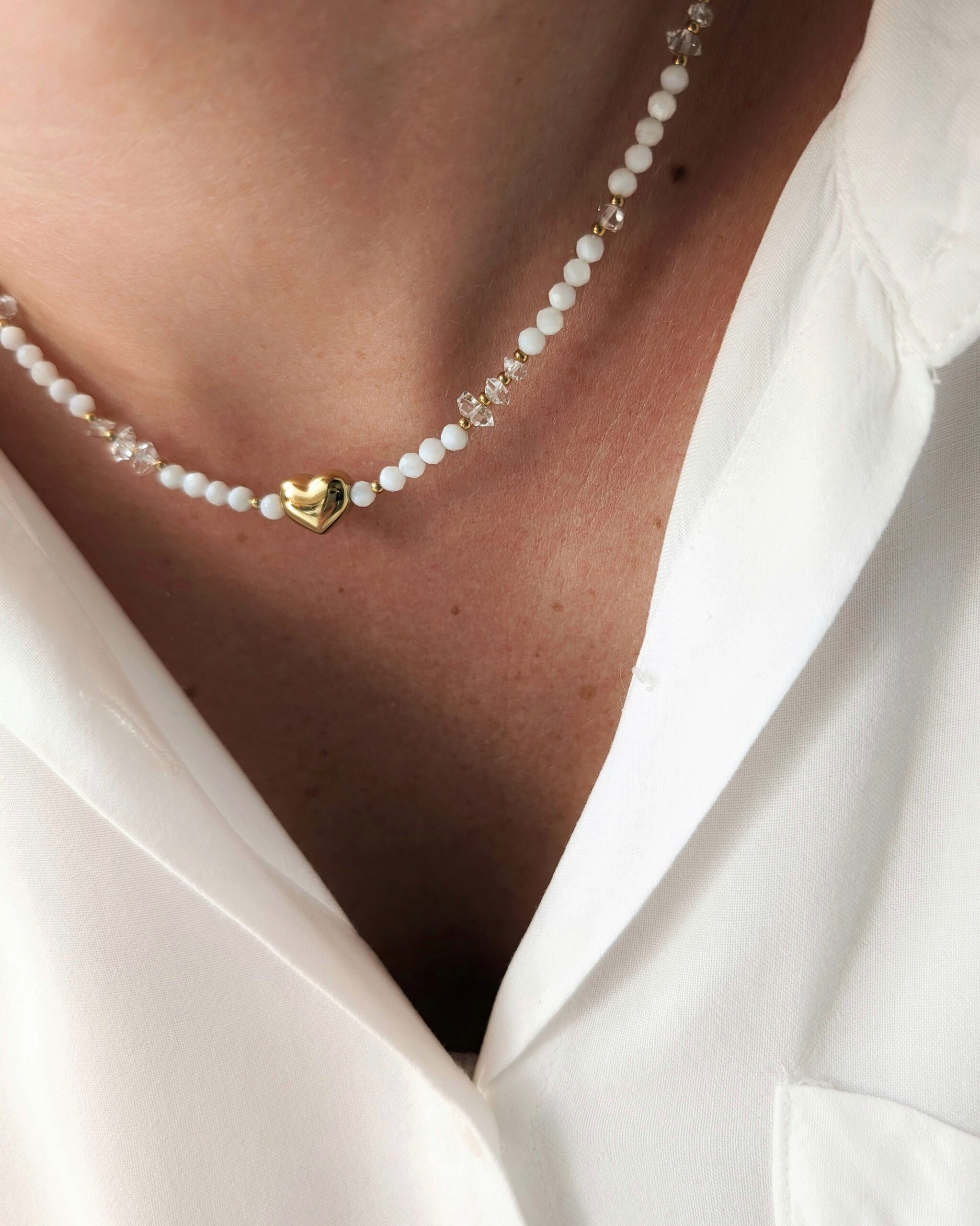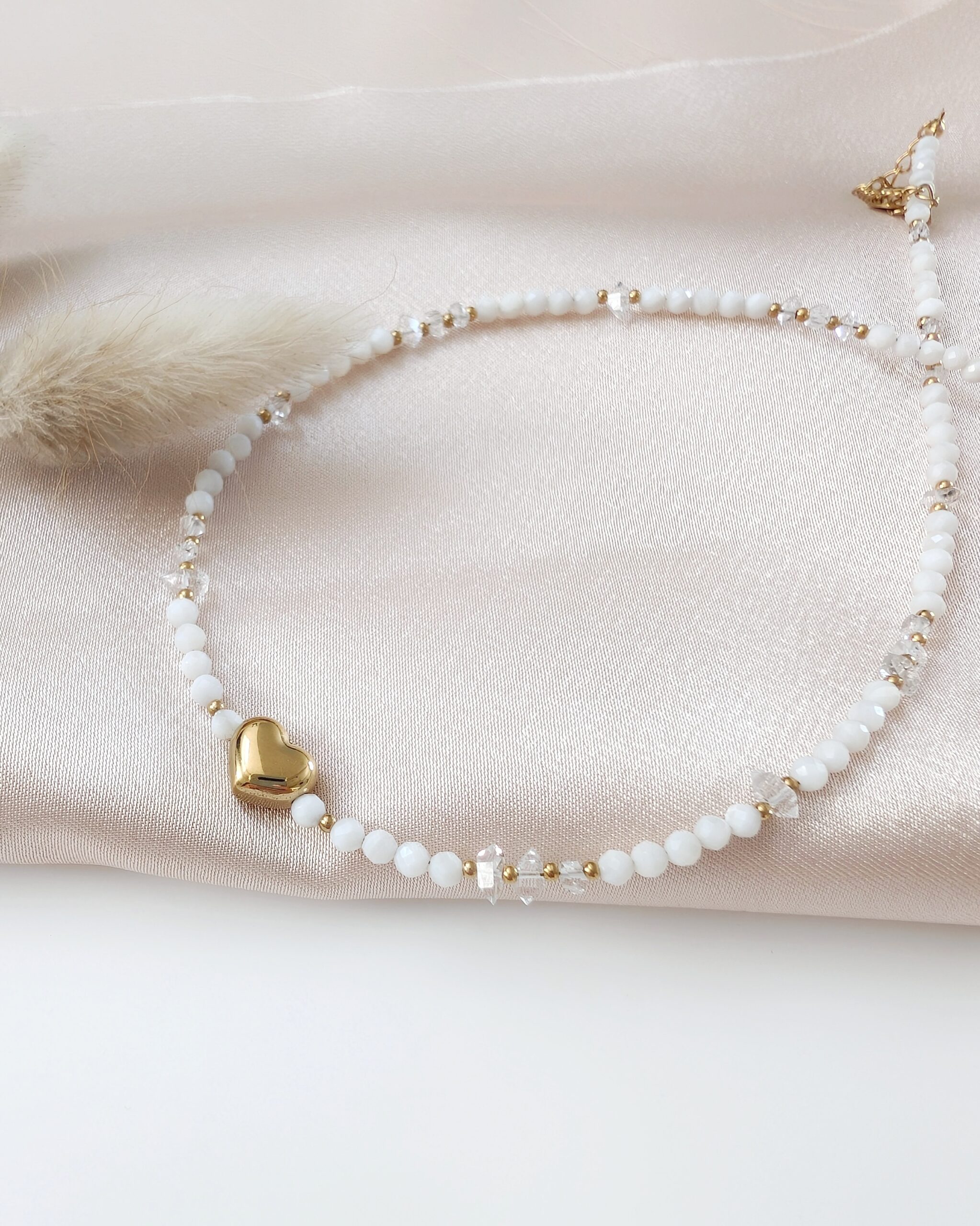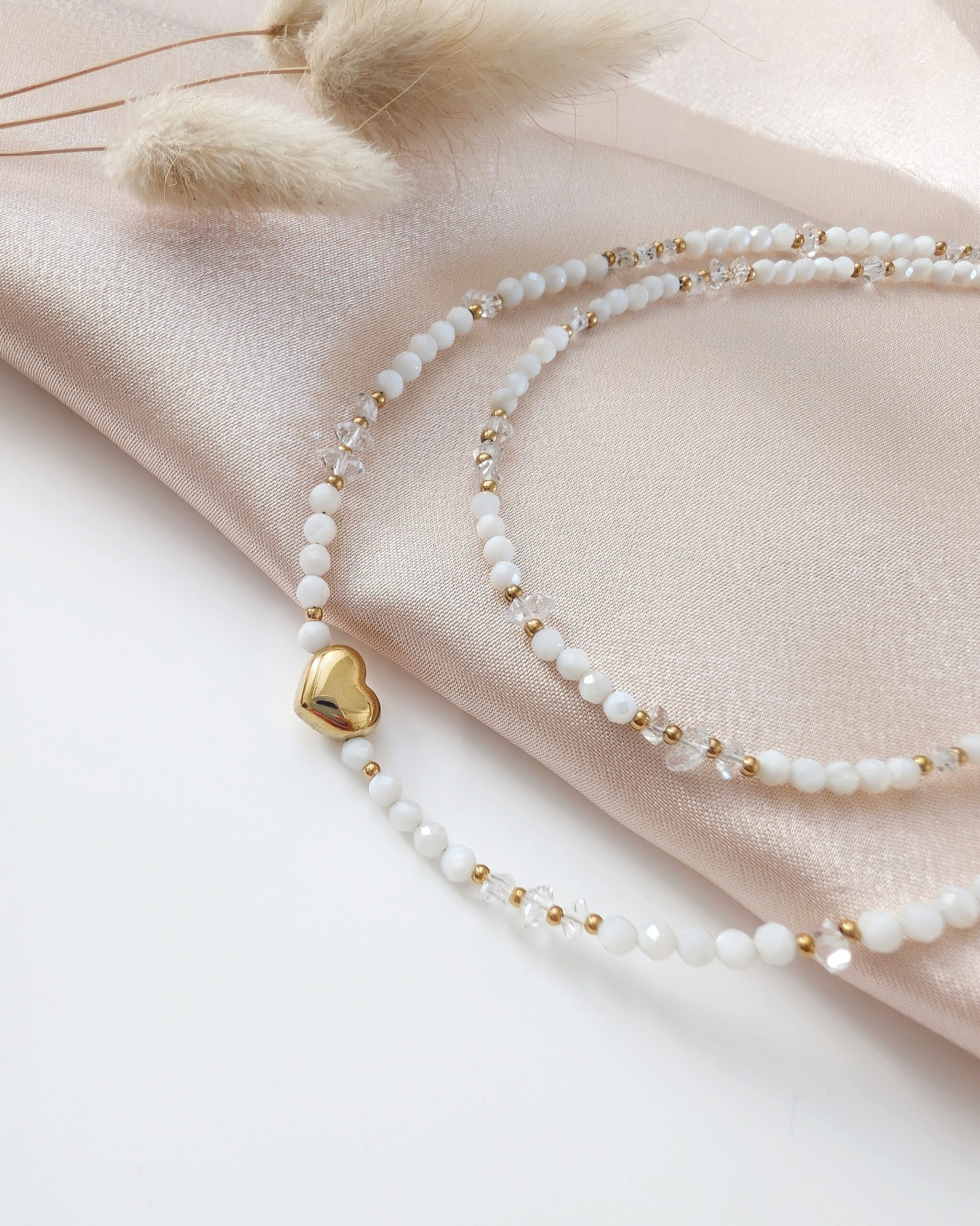 Naszyjnik dostępny w dwóch wariantach: ze złotym serduszkiem na środku lub bez (w miejscu serduszka znajduje się kryształ).