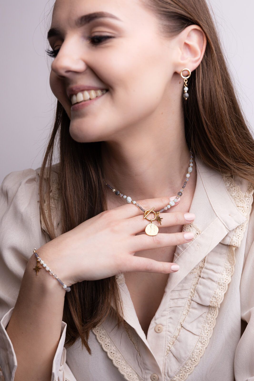 Za subtelny odcień pastelowej zieleni odpowiadają larimar, angelit i amazonit. Kolor szary to labradoryt oraz najdrobniejsze kuleczki kociego oka.